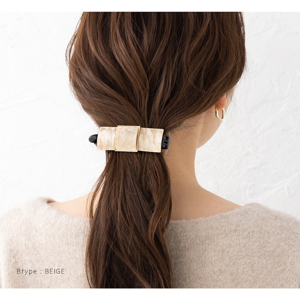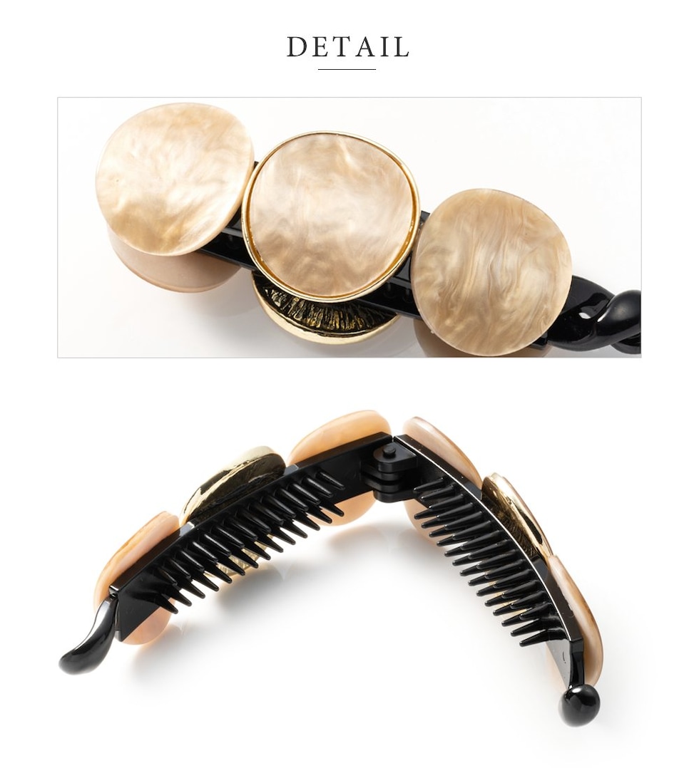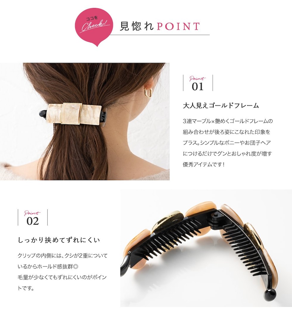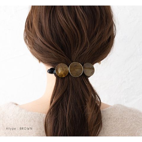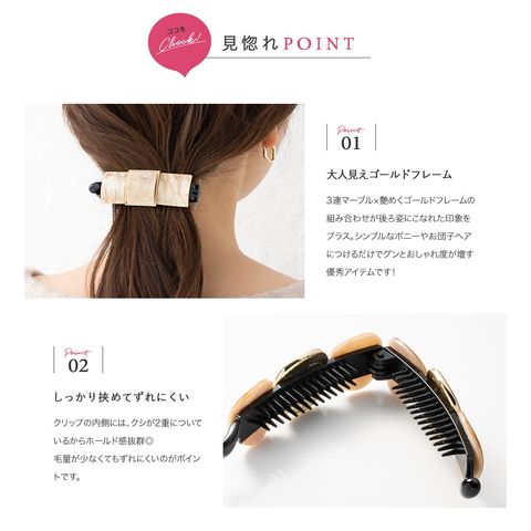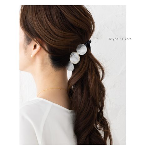 3連マーブル×艶めくゴールドフレームの組み合わせが後ろ姿にこなれた印象をプラス。シンプルなポニーやお団子ヘアにつけるだけでグンとおしゃれ度が増す優秀アイテムです!
