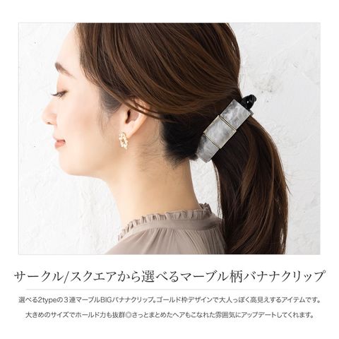 選べる2typeの3連マーブルBIGバナナクリップ。ゴールド枠デザインで大人っぽく高見えするアイテムです。大きめのサイズでホールド力も抜群◎さっとまとめたヘアもこなれた雰囲気にアップデートしてくれます。