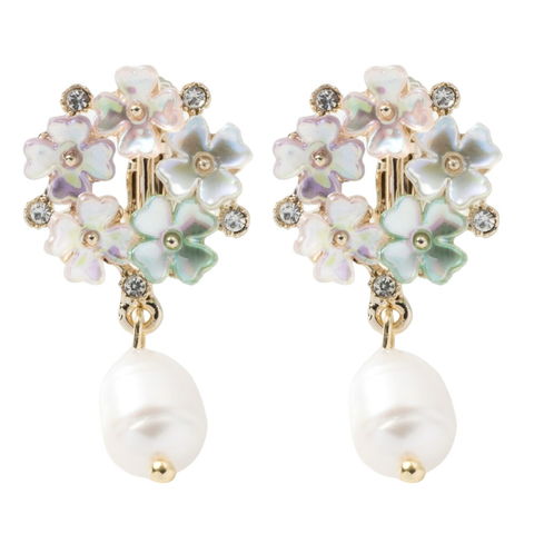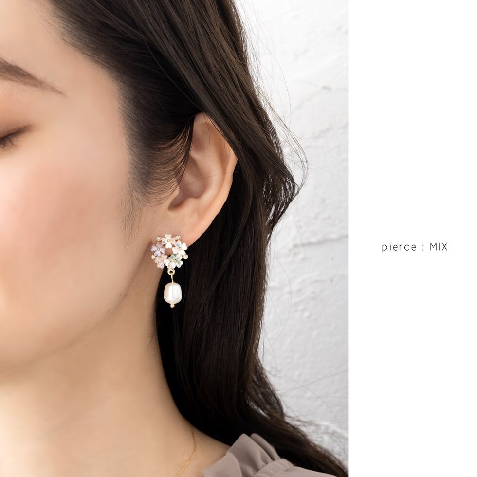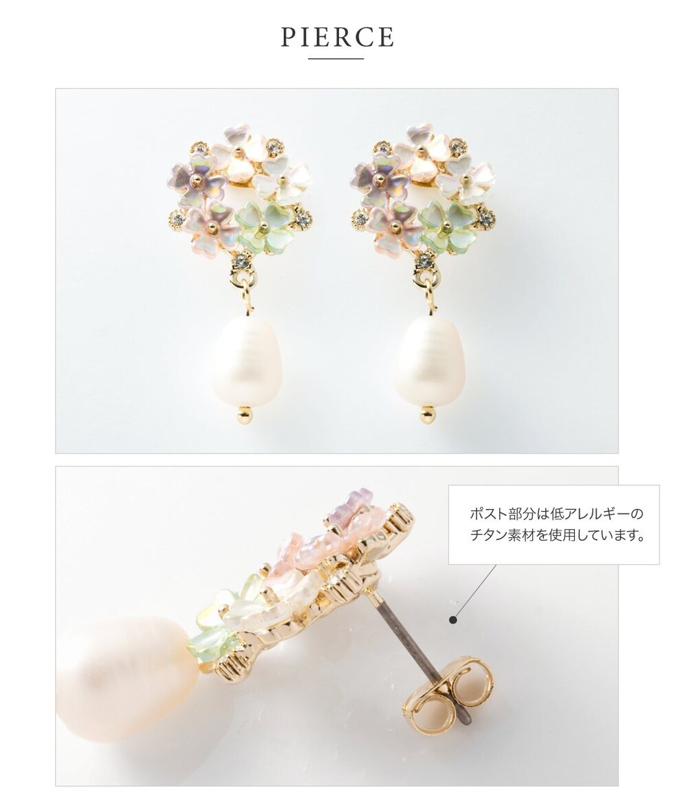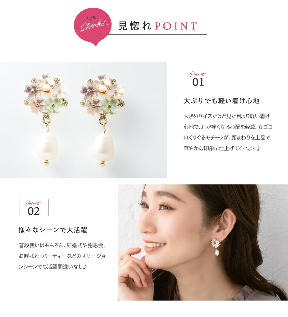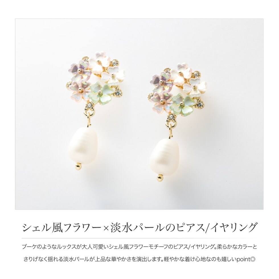 ブーケのようなルックスが大人可愛いシェル風フラワーモチーフのピアス/イヤリング。柔らかなカラーとさりげなく揺れる淡水パールが上品な華やかさを演出します。軽やかな着け心地なのも嬉しいpoint◎