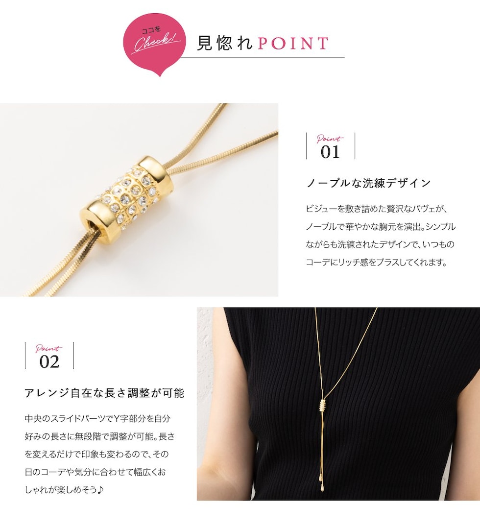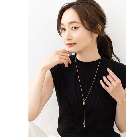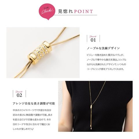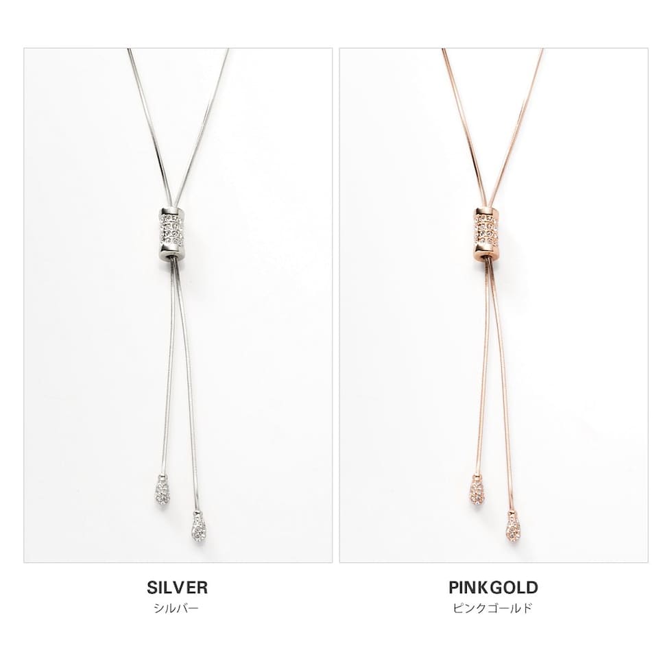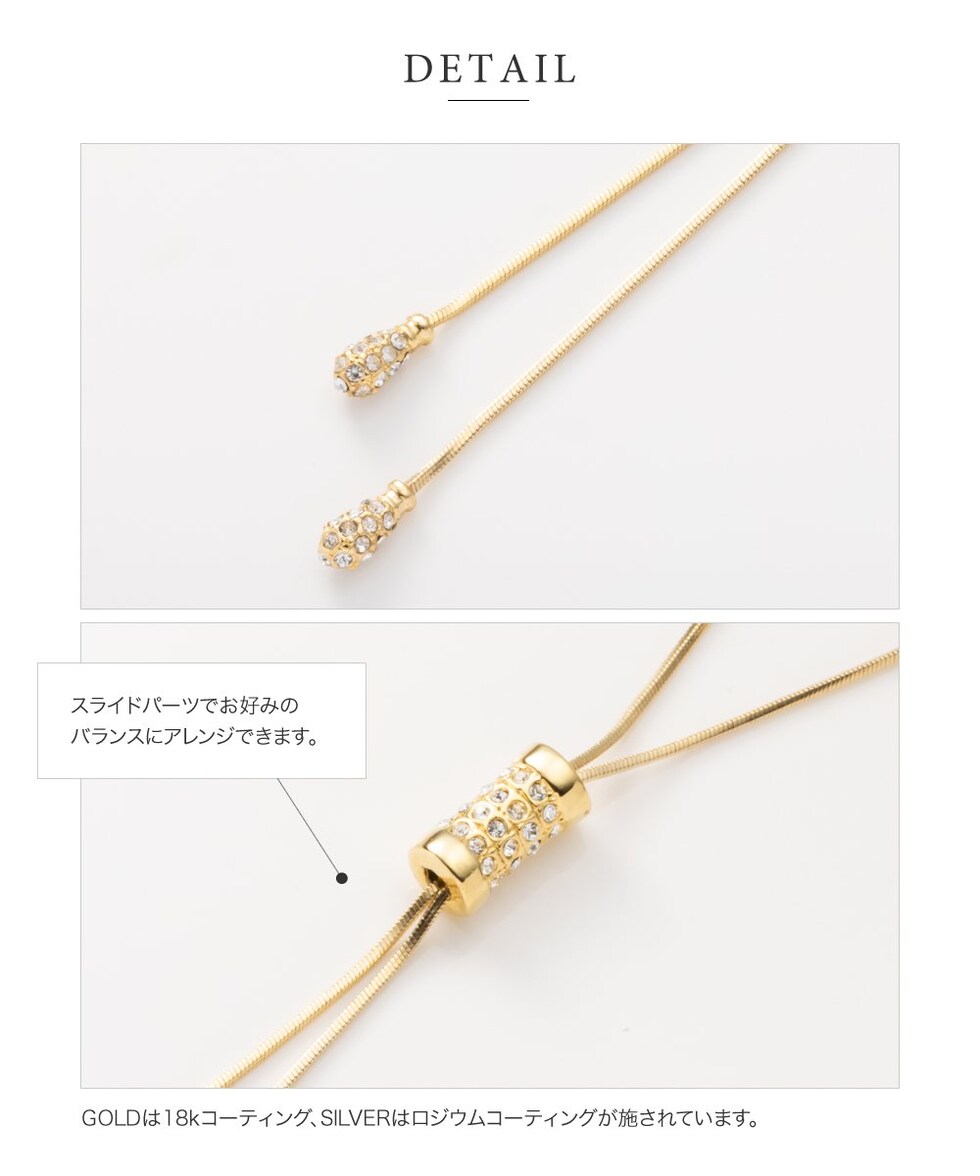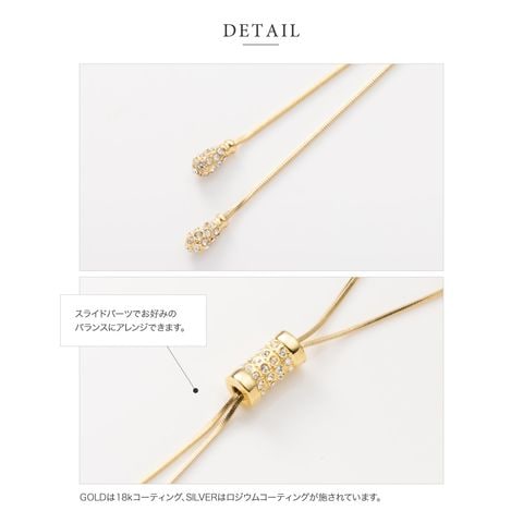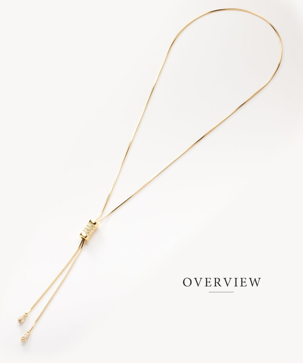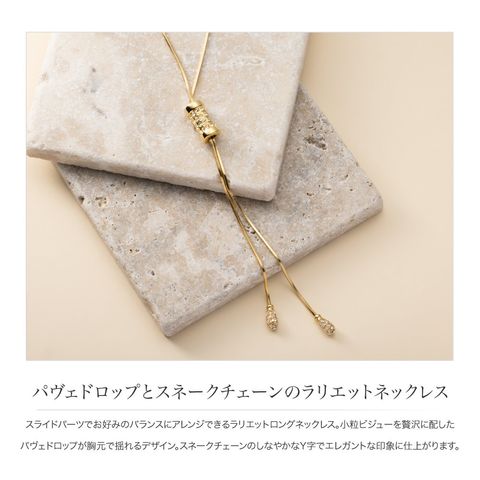 スライドパーツでお好みのバランスにアレンジできるラリエットロングネックレス。小粒ビジューを贅沢に配したパヴェドロップが胸元で揺れるデザイン。スネークチェーンのしなやかなY字でエレガントな印象に仕上がります。