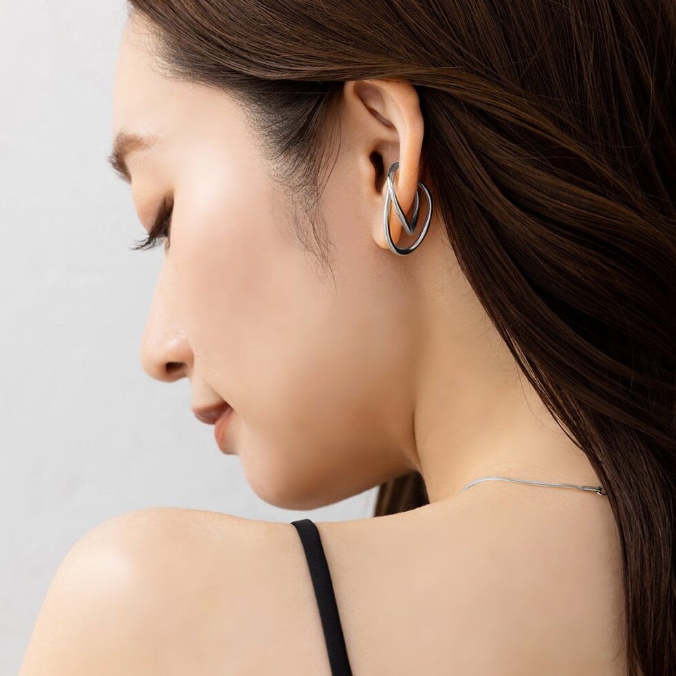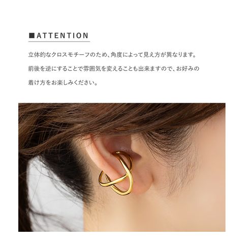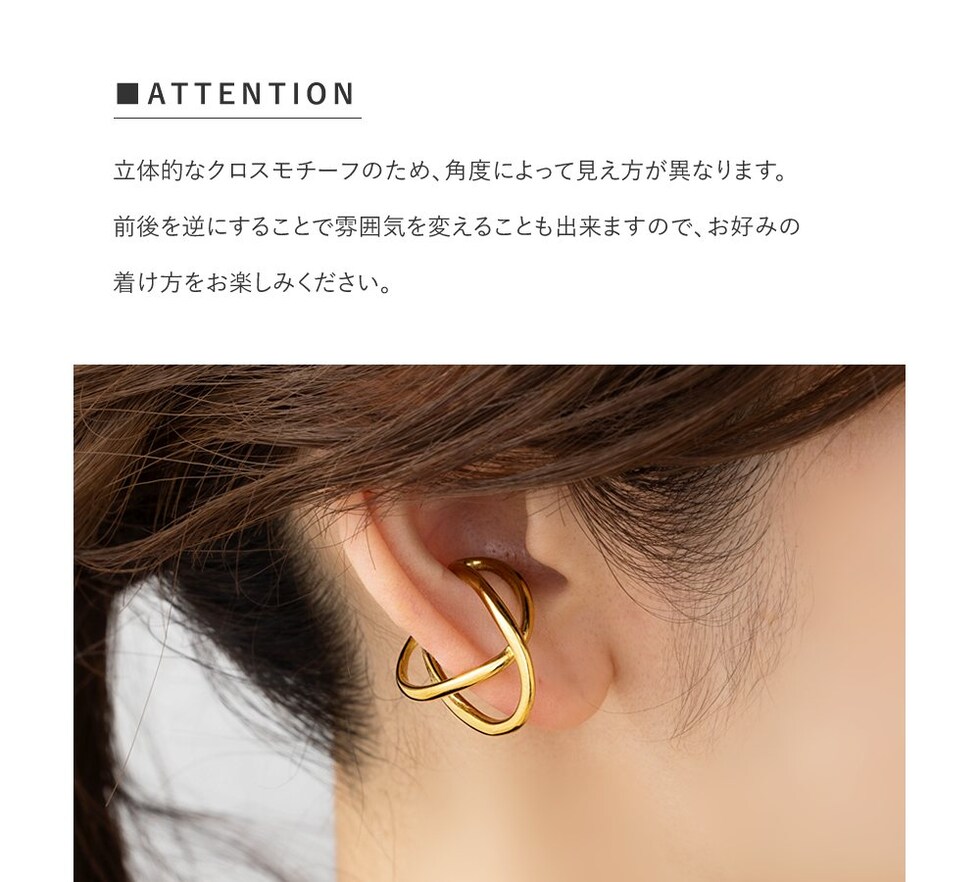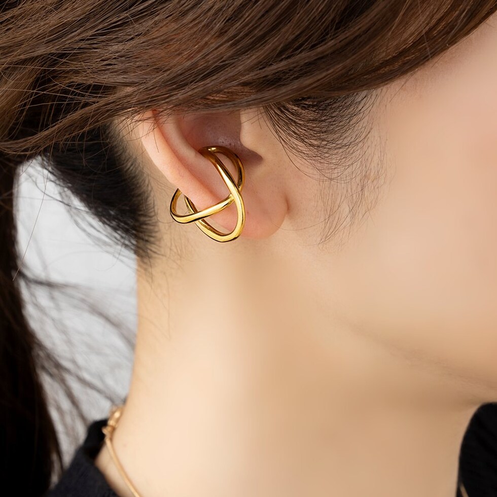 緩やかな曲線をクロスさせ立体感を持たせた片耳用イヤーカフ。落ち着いた女性らしさを感じさせるデザインで耳元から大人っぽい品格をプラス。シンプルなので合わせるコーデを選ばずクラスアップしてくれます。錆びにくいステンレス製でデイリーに活躍しそう。
