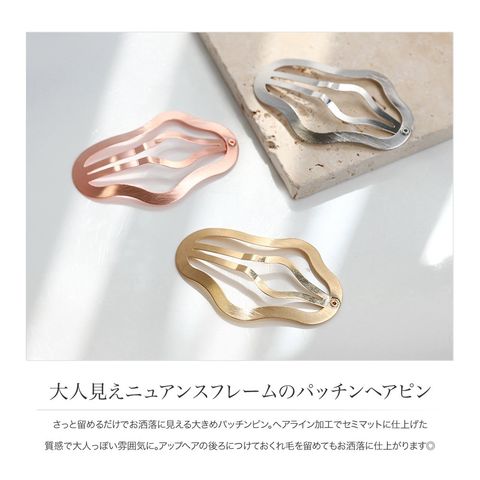 さっと留めるだけでお洒落に見える大きめパッチンピン。ヘアライン加工でセミマットに仕上げた質感で大人っぽい雰囲気に。アップヘアの後ろにつけておくれ毛を留めてもお洒落に仕上がります◎
