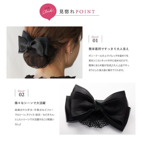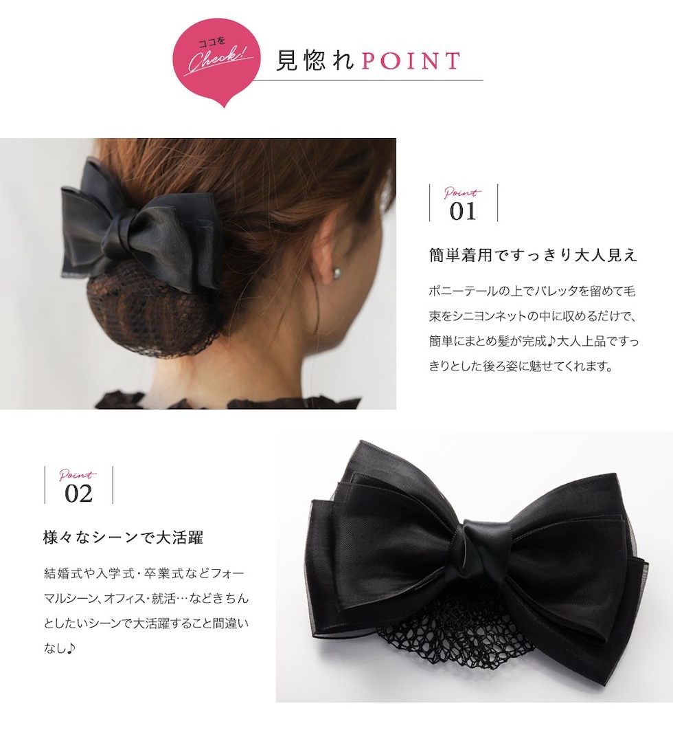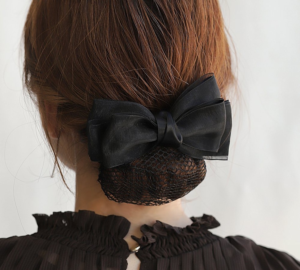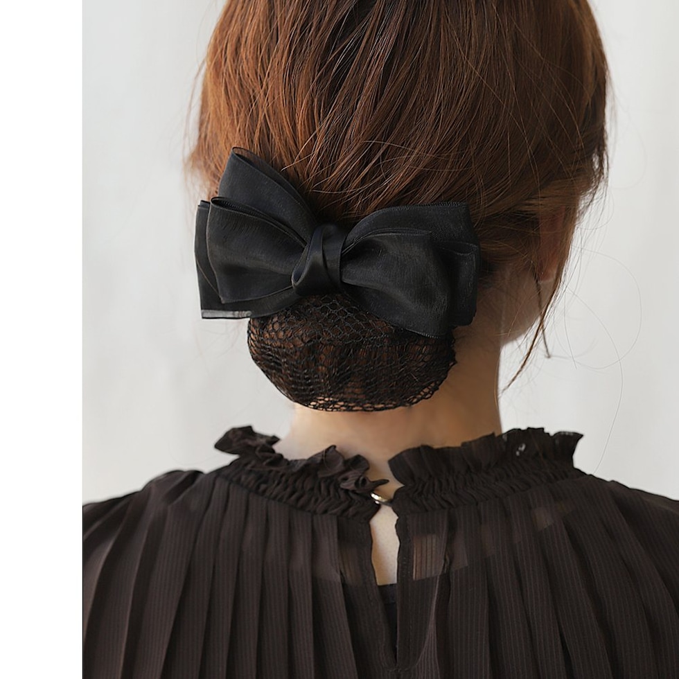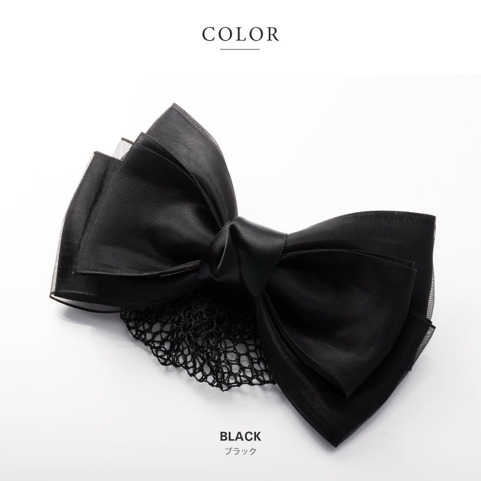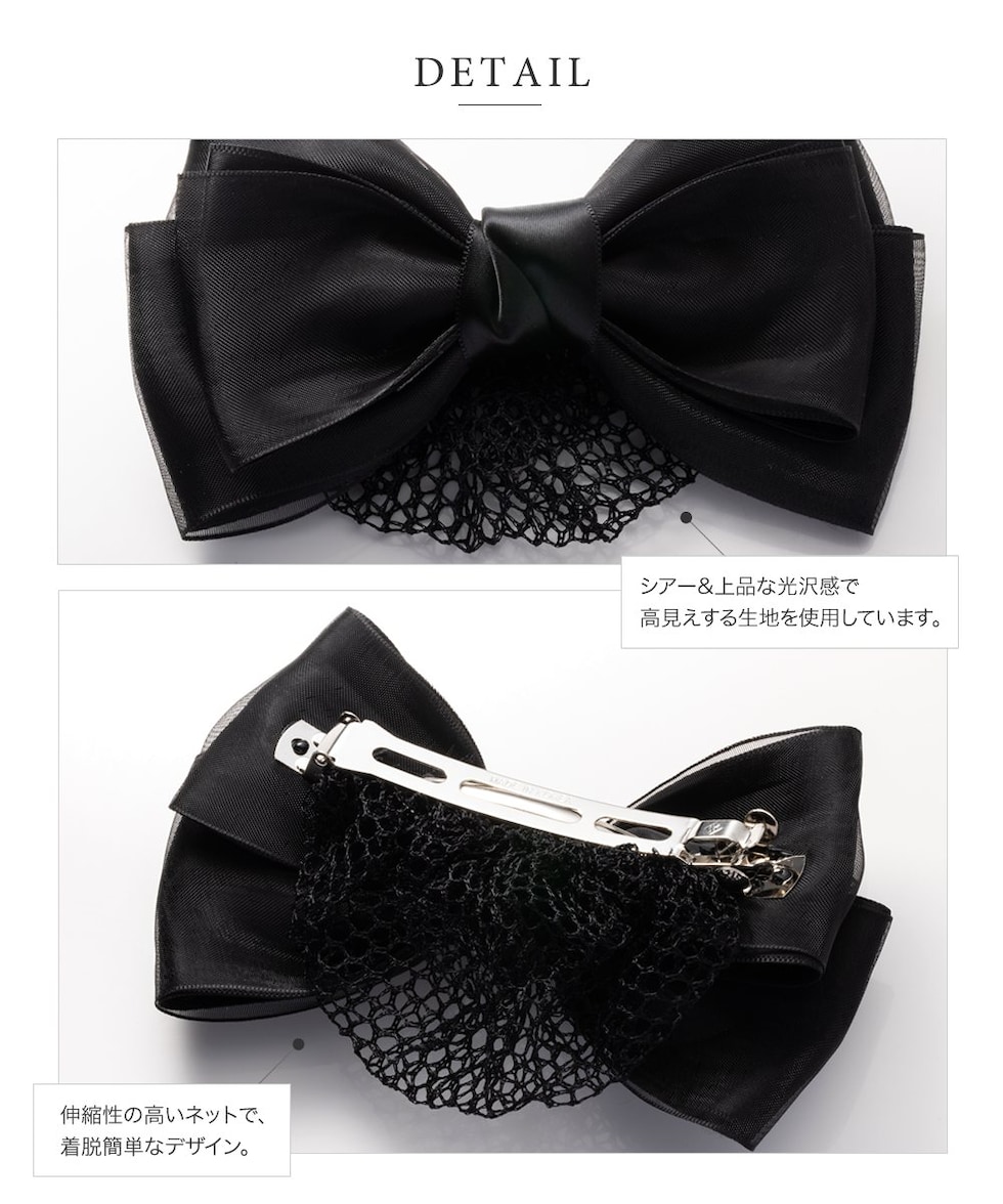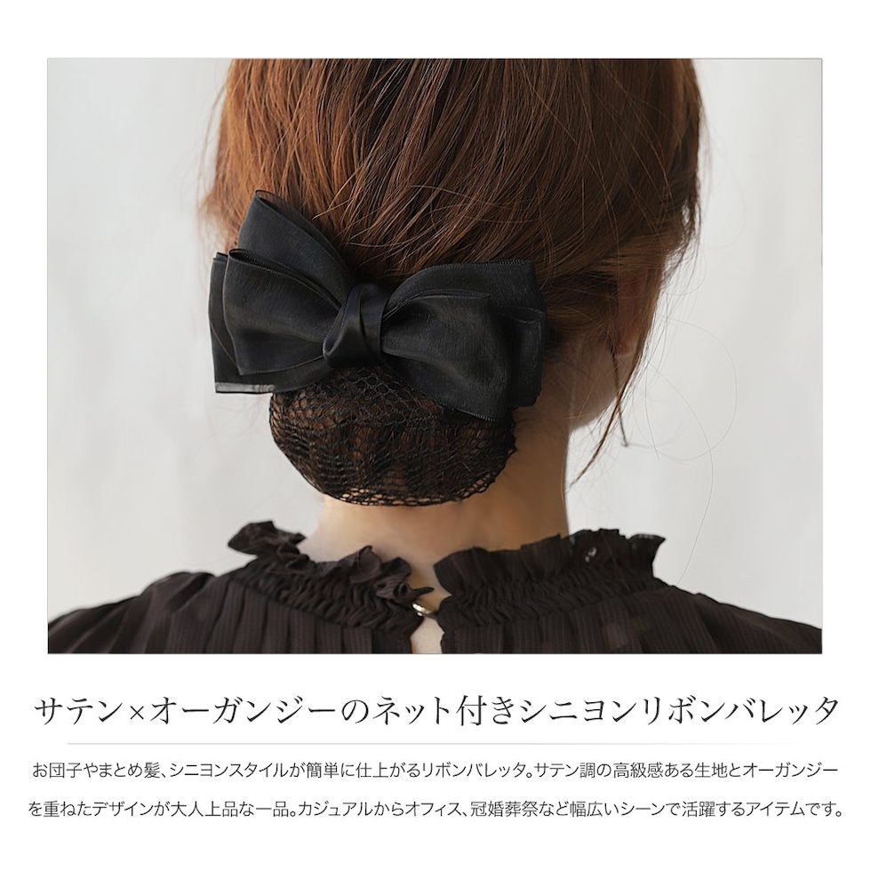 お団子やまとめ髪、シニヨンスタイルが簡単に仕上がるリボンバレッタ。サテン調の高級感ある生地とオーガンジーを重ねたデザインが大人上品な一品。カジュアルからオフィス、冠婚葬祭など幅広いシーンで活躍するアイテムです。