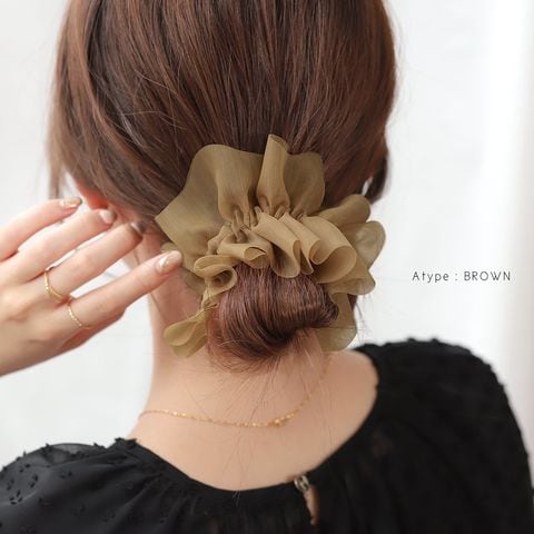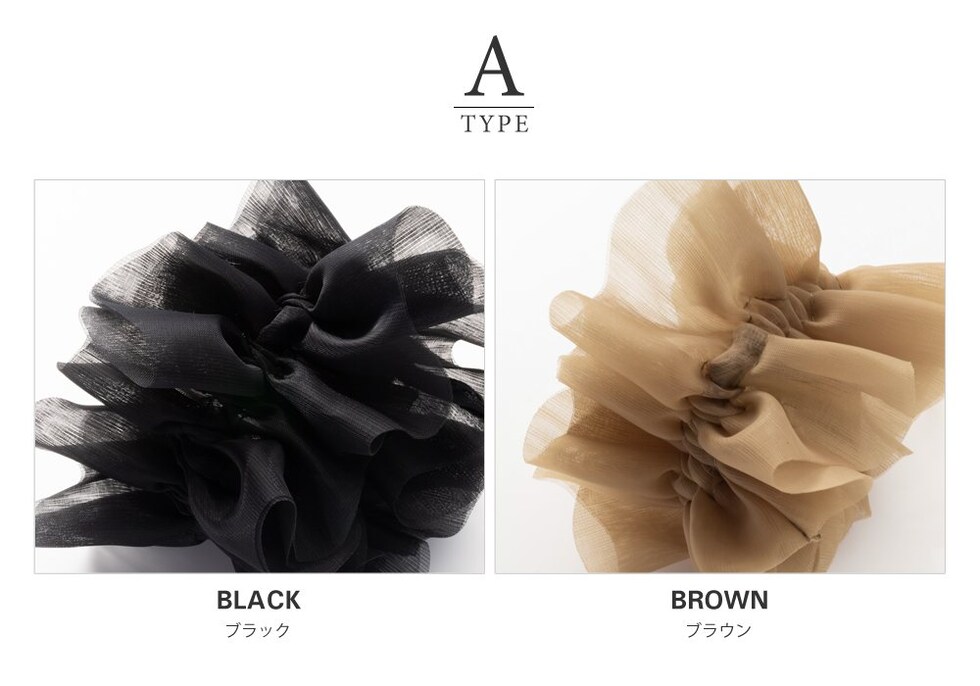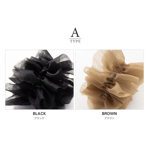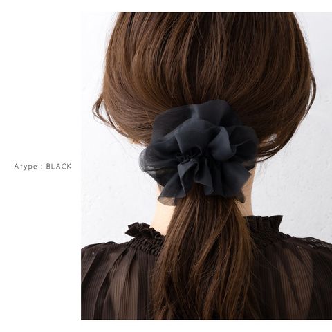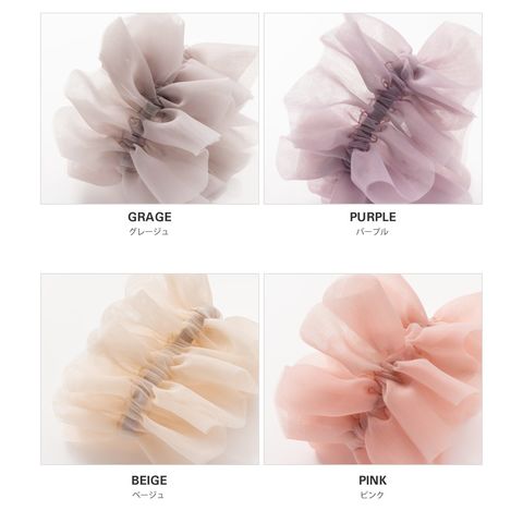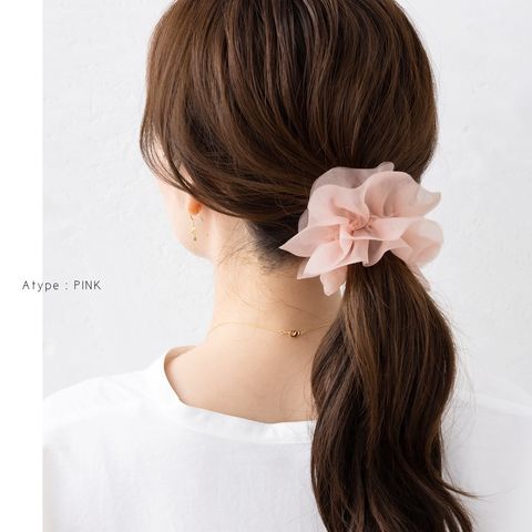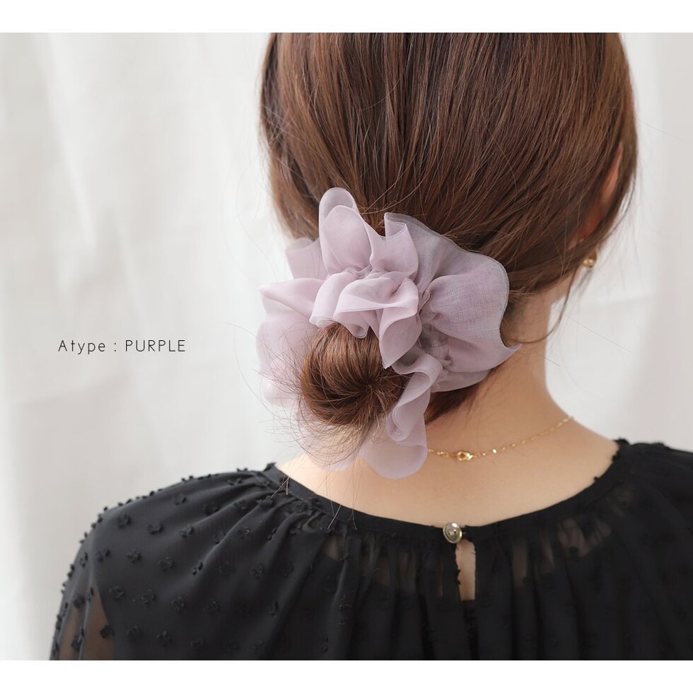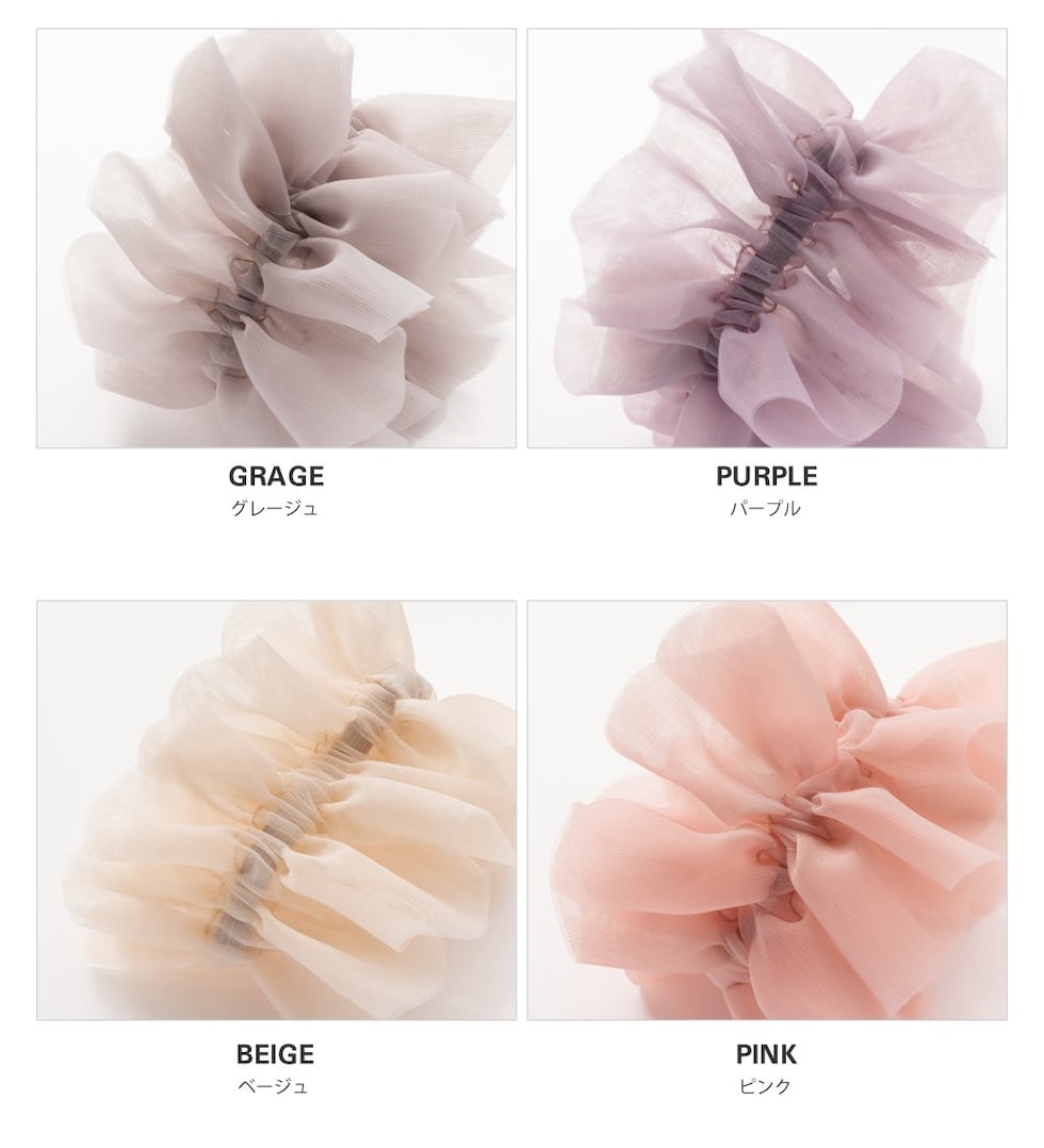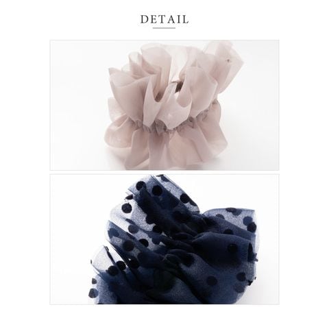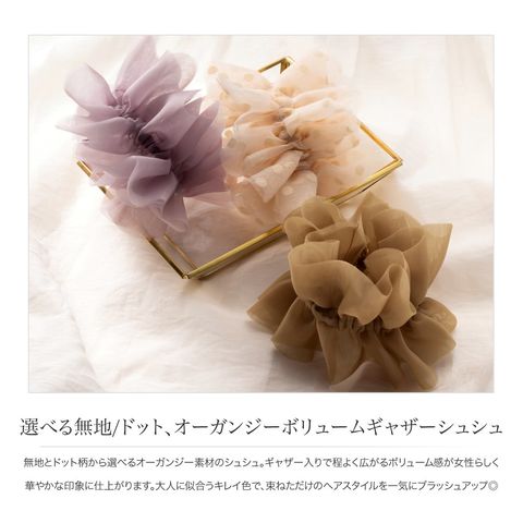 無地とドット柄から選べるオーガンジー素材のシュシュ。ギャザー入りで程よく広がるボリューム感が女性らしく華やかな印象に仕上がります。大人に似合うキレイ色で、束ねただけのヘアスタイルを一気にブラッシュアップ◎