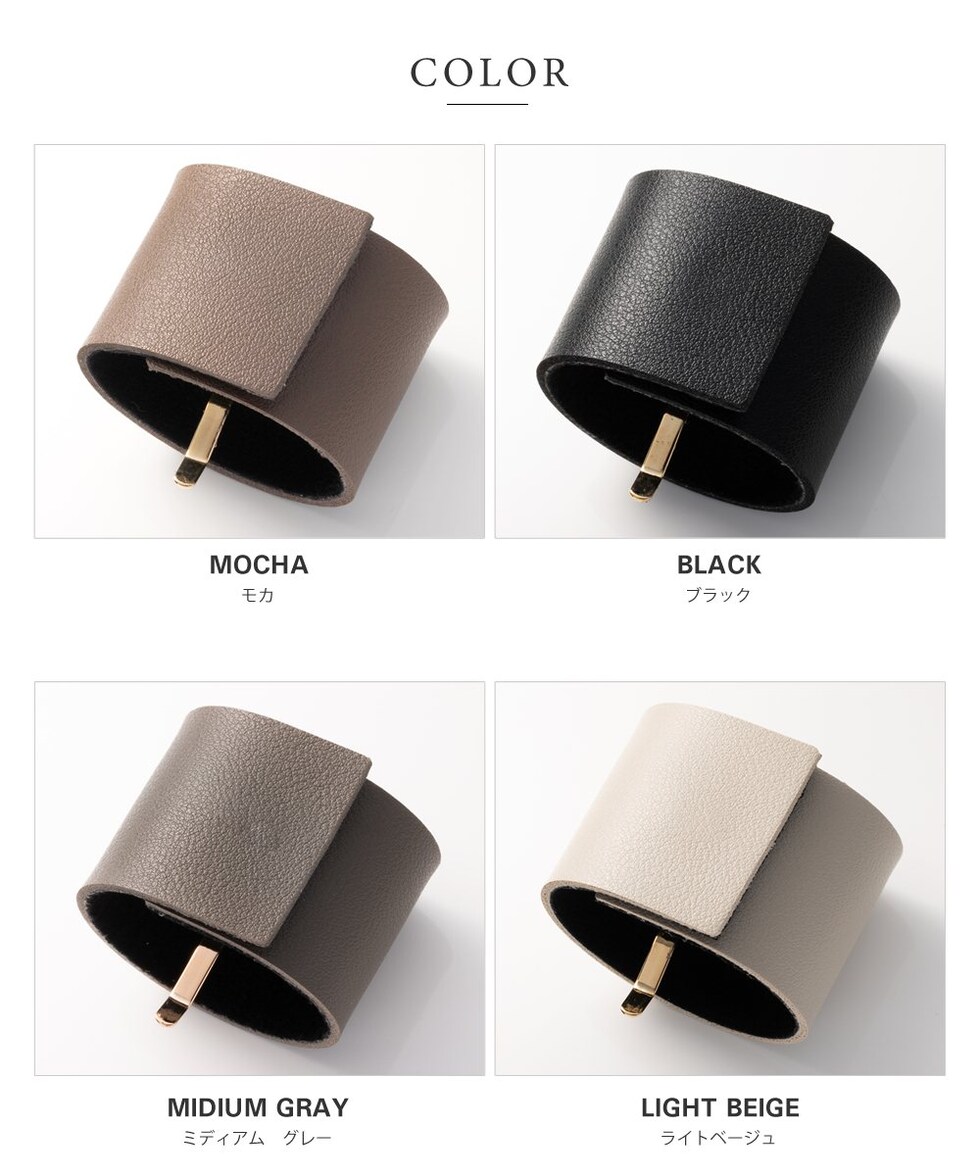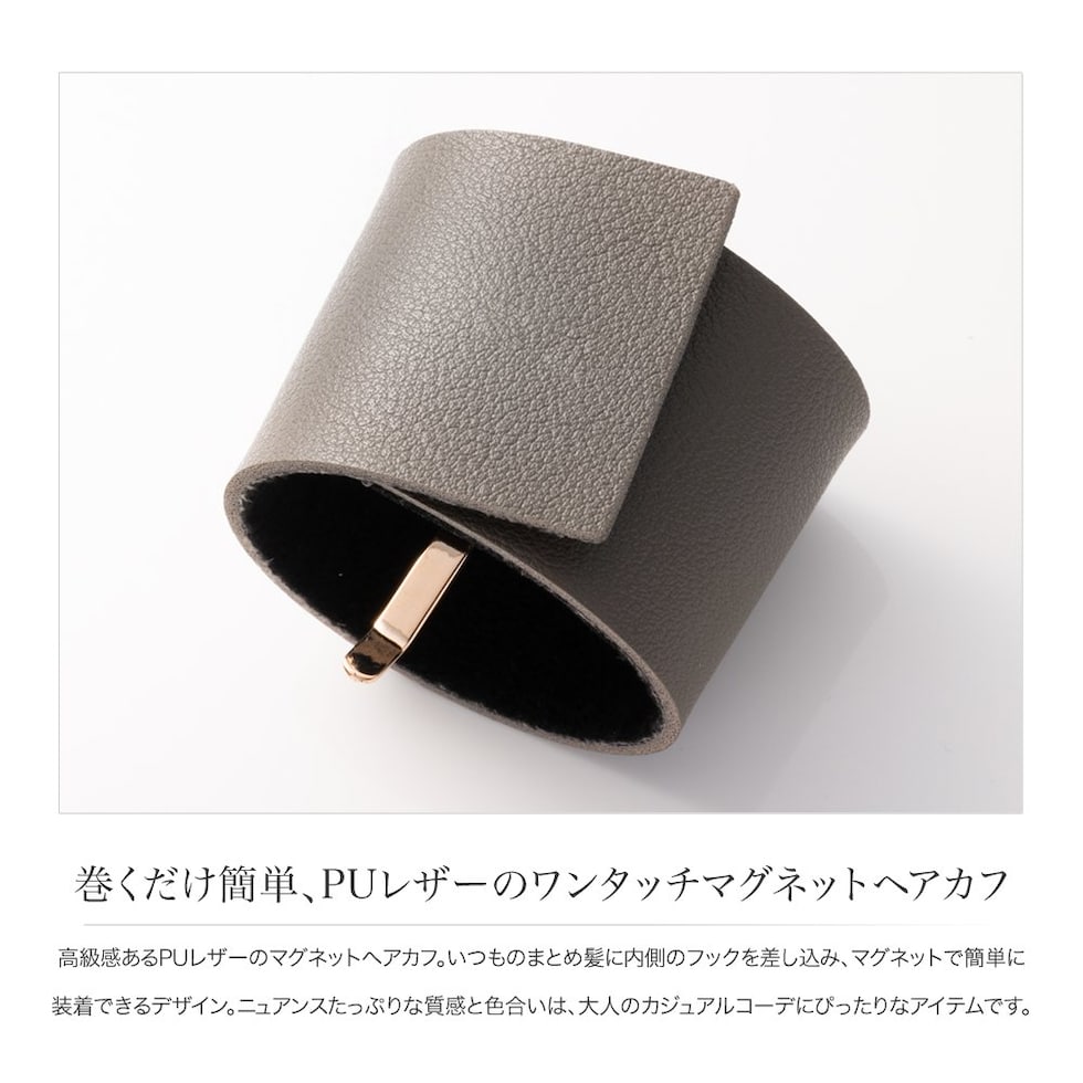 高級感あるPUレザーのマグネットヘアカフ。いつものまとめ髪に内側のフックを差し込み、マグネットで簡単に装着できるデザイン。ニュアンスたっぷりな質感と色合いは、大人のカジュアルコーデにぴったりなアイテムです。