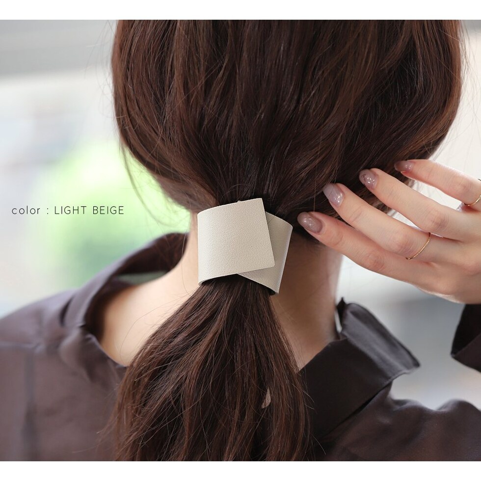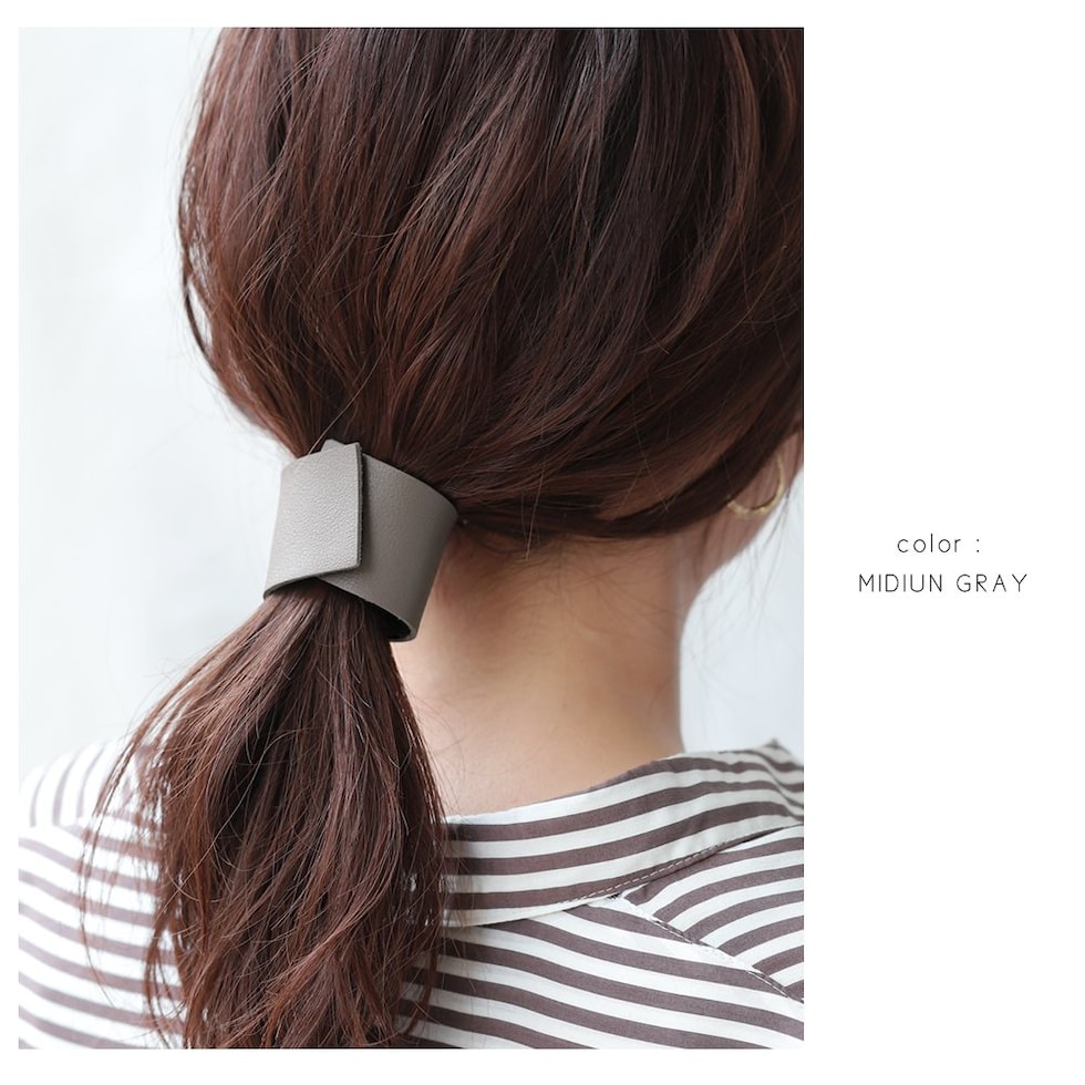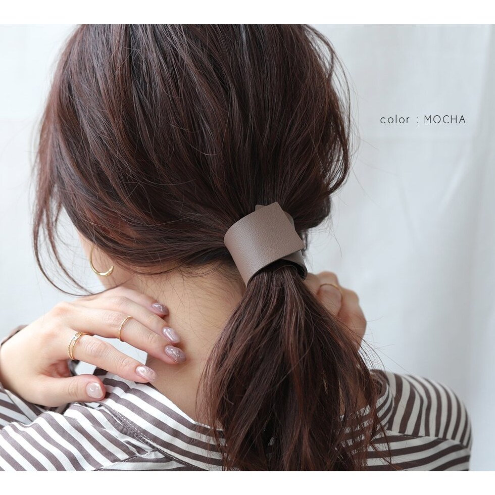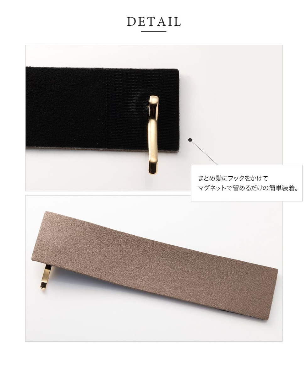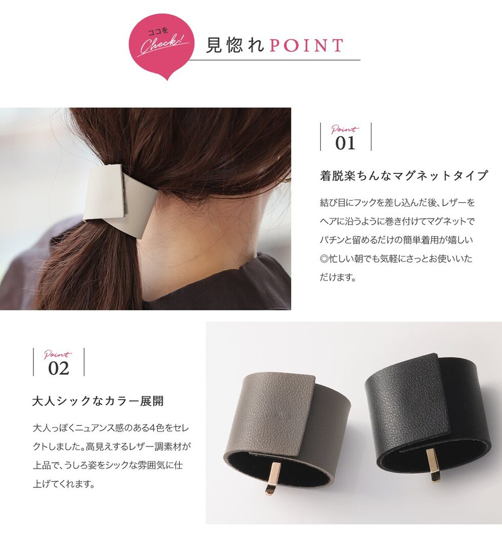 結び目にフックを差し込んだ後、レザーをヘアに沿うように巻き付けてマグネットでパチンと留めるだけの簡単着用が嬉しい◎忙しい朝でも気軽にさっとお使いいただけます。