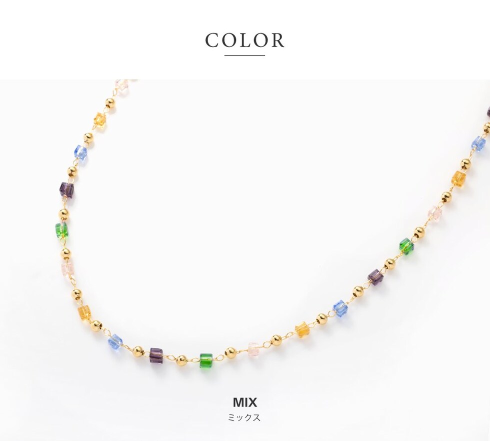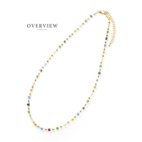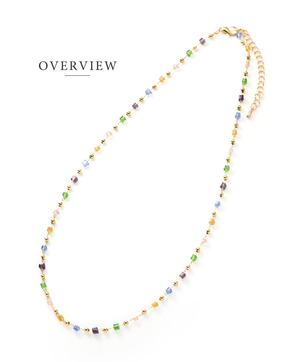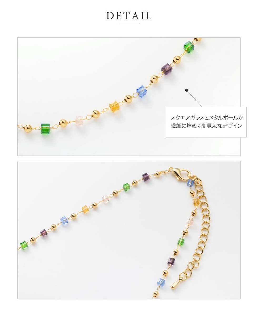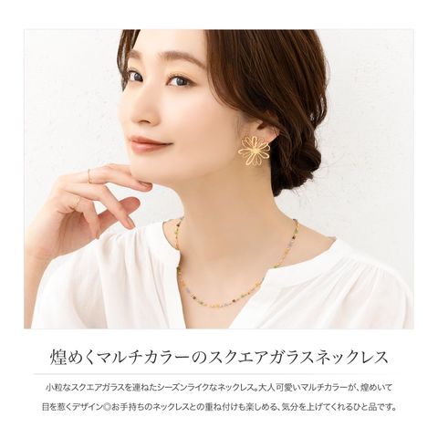 小粒なスクエアガラスを連ねたシーズンライクなネックレス。大人可愛いマルチカラーが、煌めいて目を惹くデザイン◎お手持ちのネックレスとの重ね付けも楽しめる、気分を上げてくれるひと品です。