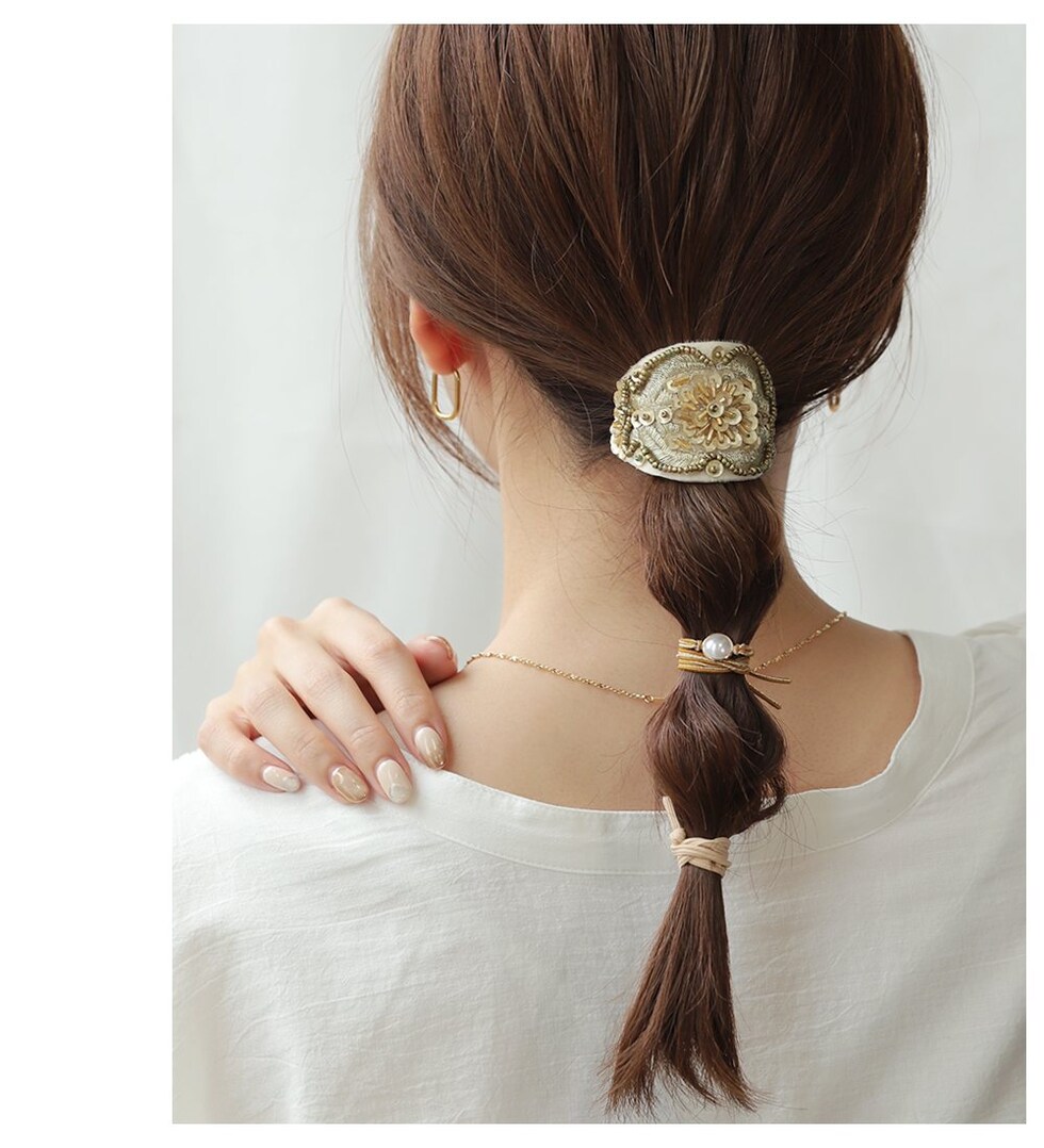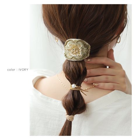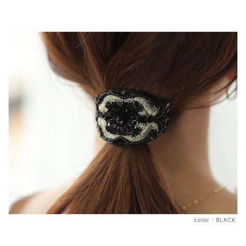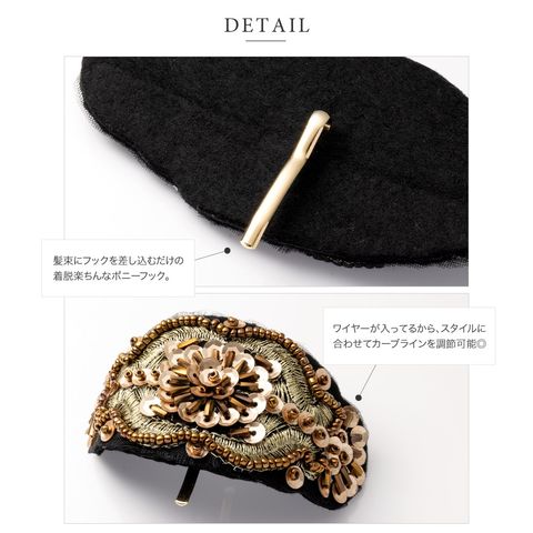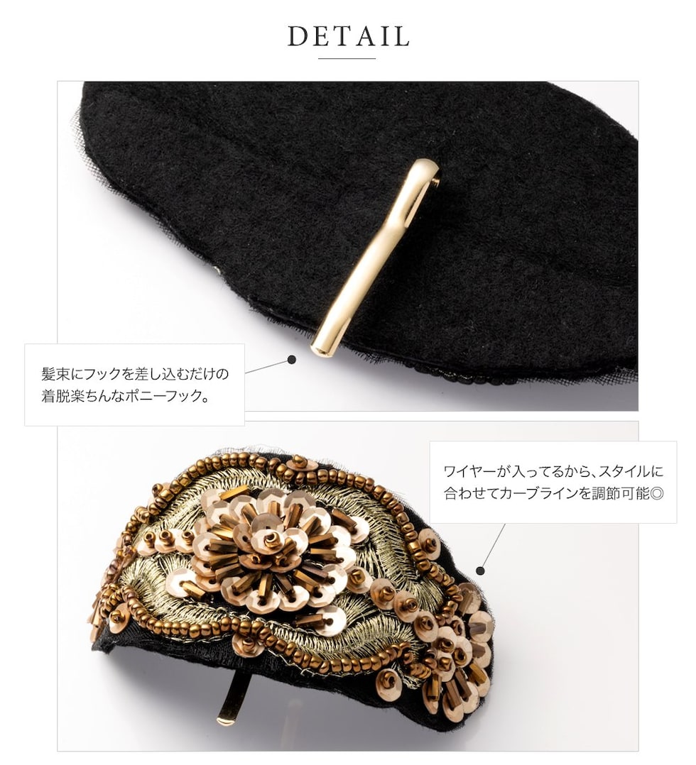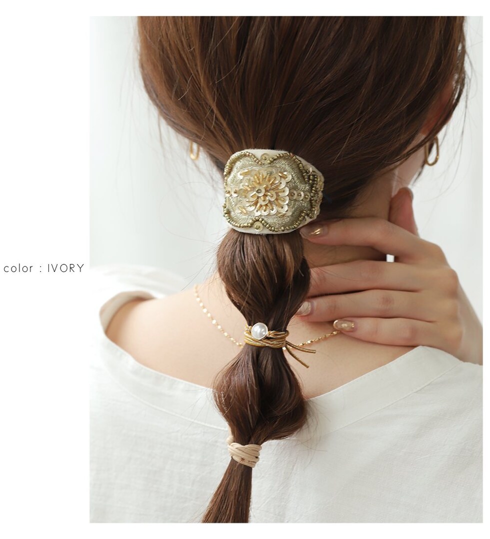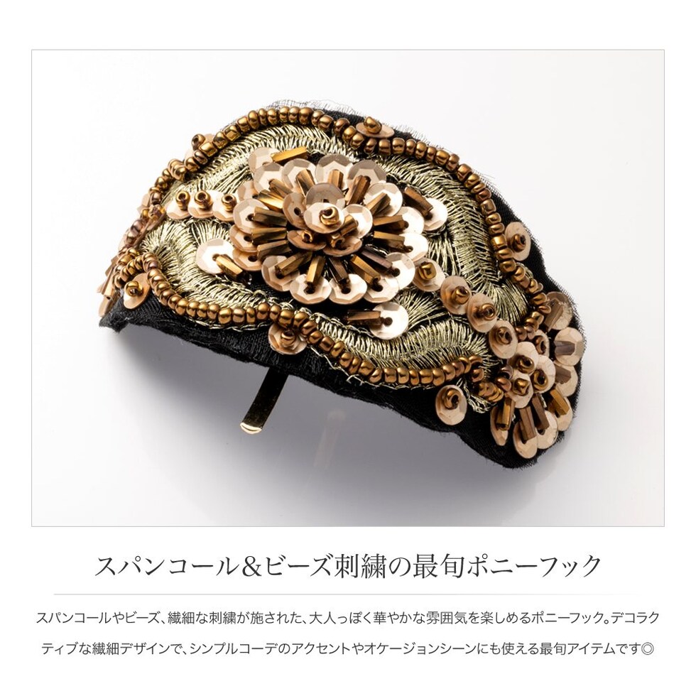 スパンコールやビーズ、繊細な刺繍が施された、大人っぽく華やかな雰囲気を楽しめるポニーフック。デコラクティブな繊細デザインで、シンプルコーデのアクセントやオケージョンシーンにも使える最旬アイテムです◎