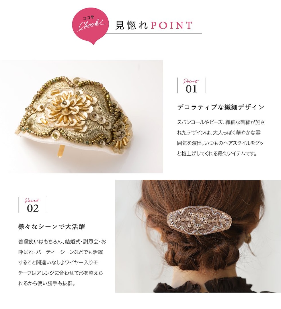 普段使いはもちろん、結婚式・謝恩会・お呼ばれ・パーティーシーンなどでも活躍すること間違いなし♪ワイヤー入りモチーフはアレンジに合わせて形を整えられるから使い勝手も抜群。
