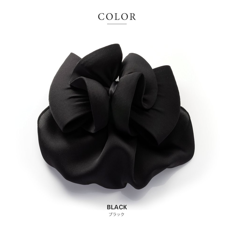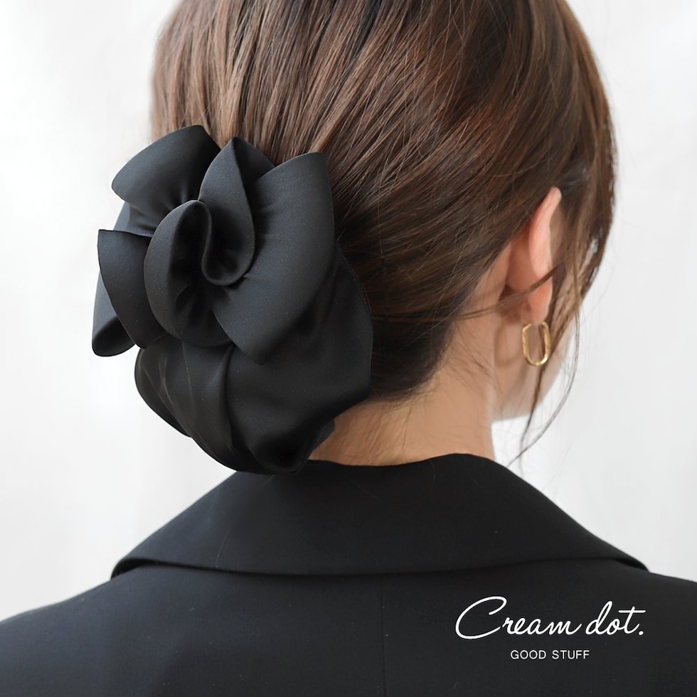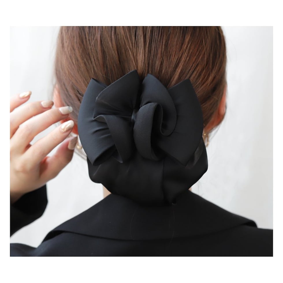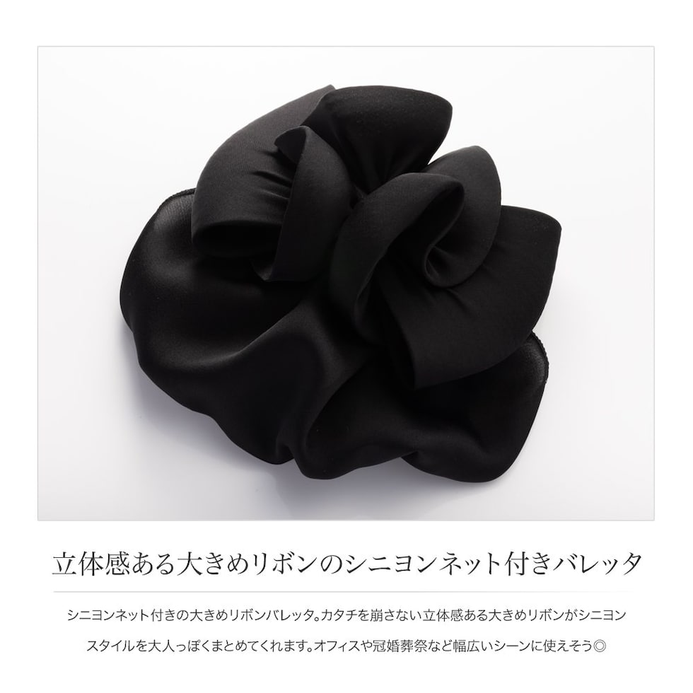 シニヨンネット付きの大きめリボンバレッタ。カタチを崩さない立体感ある大きめリボンがシニヨンスタイルを大人っぽくまとめてくれます。オフィスや冠婚葬祭など幅広いシーンに使えそう◎