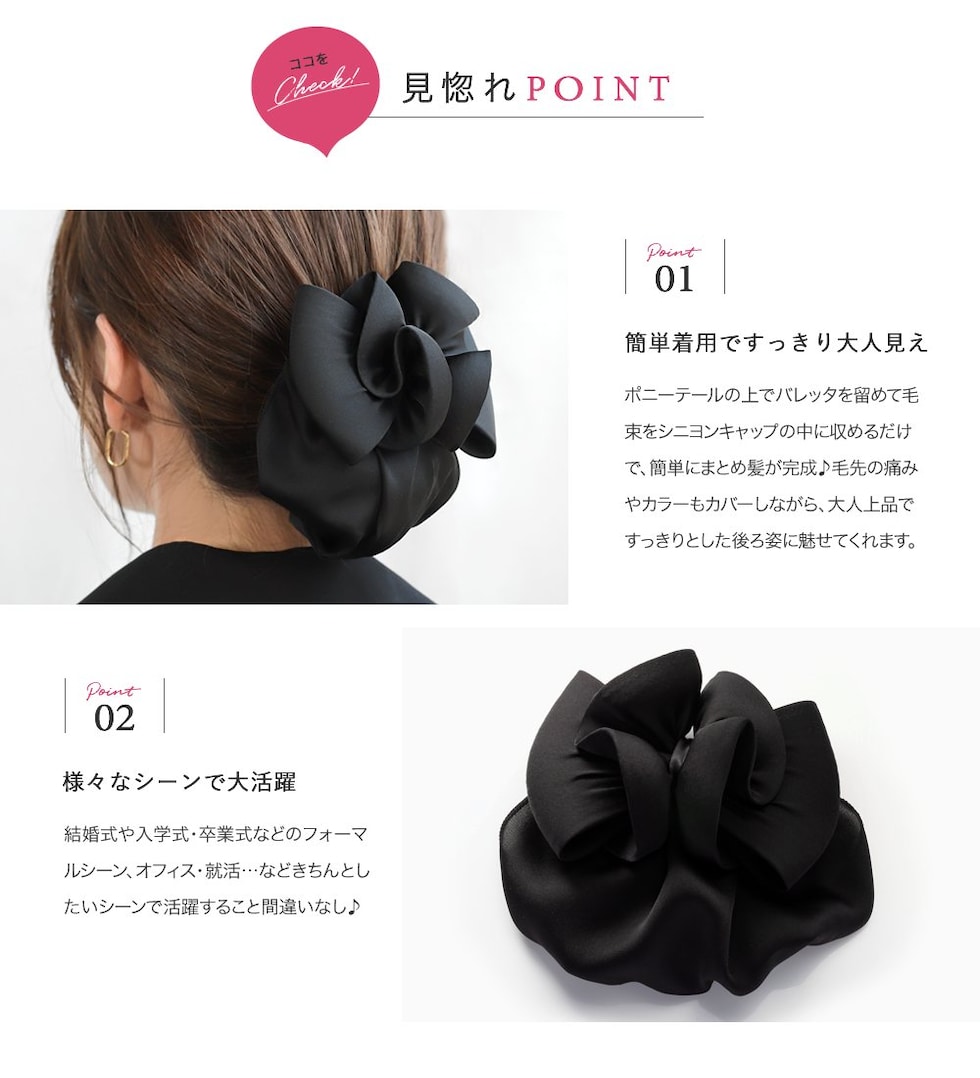 ポニーテールの上でバレッタを留めて毛束をシニヨンキャップの中に収めるだけで、簡単にまとめ髪が完成♪毛先の痛みやカラーもカバーしながら、大人上品ですっきりとした後ろ姿に魅せてくれます。