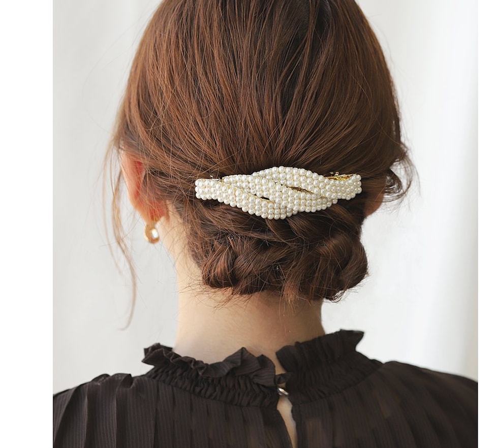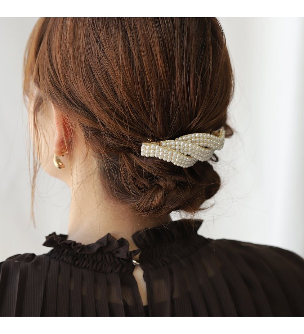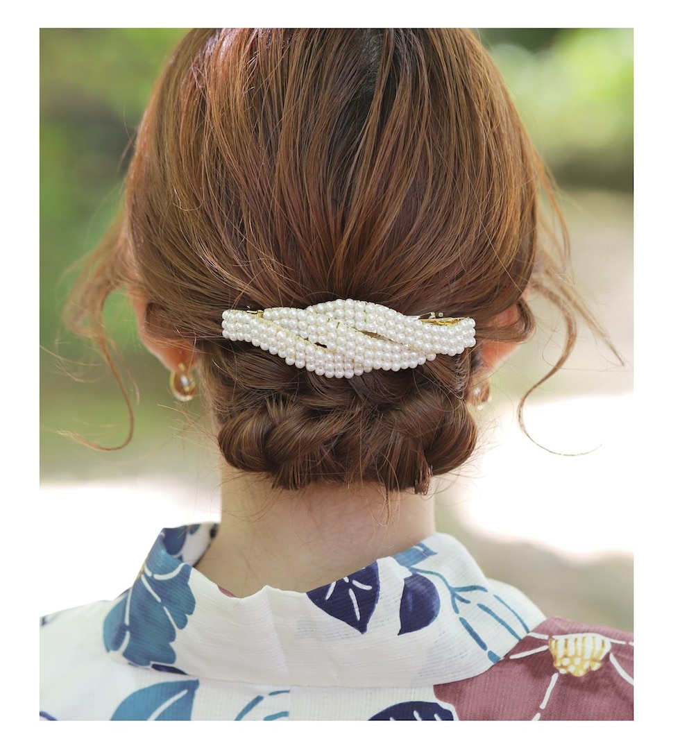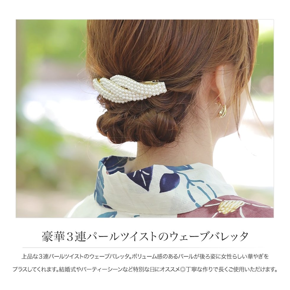 上品な3連パールツイストのウェーブバレッタ。ボリューム感のあるパールが後ろ姿に女性らしい華やぎをプラスしてくれます。結婚式やパーティーシーンなど特別な日にオススメ◎丁寧な作りで長くご使用いただけます。