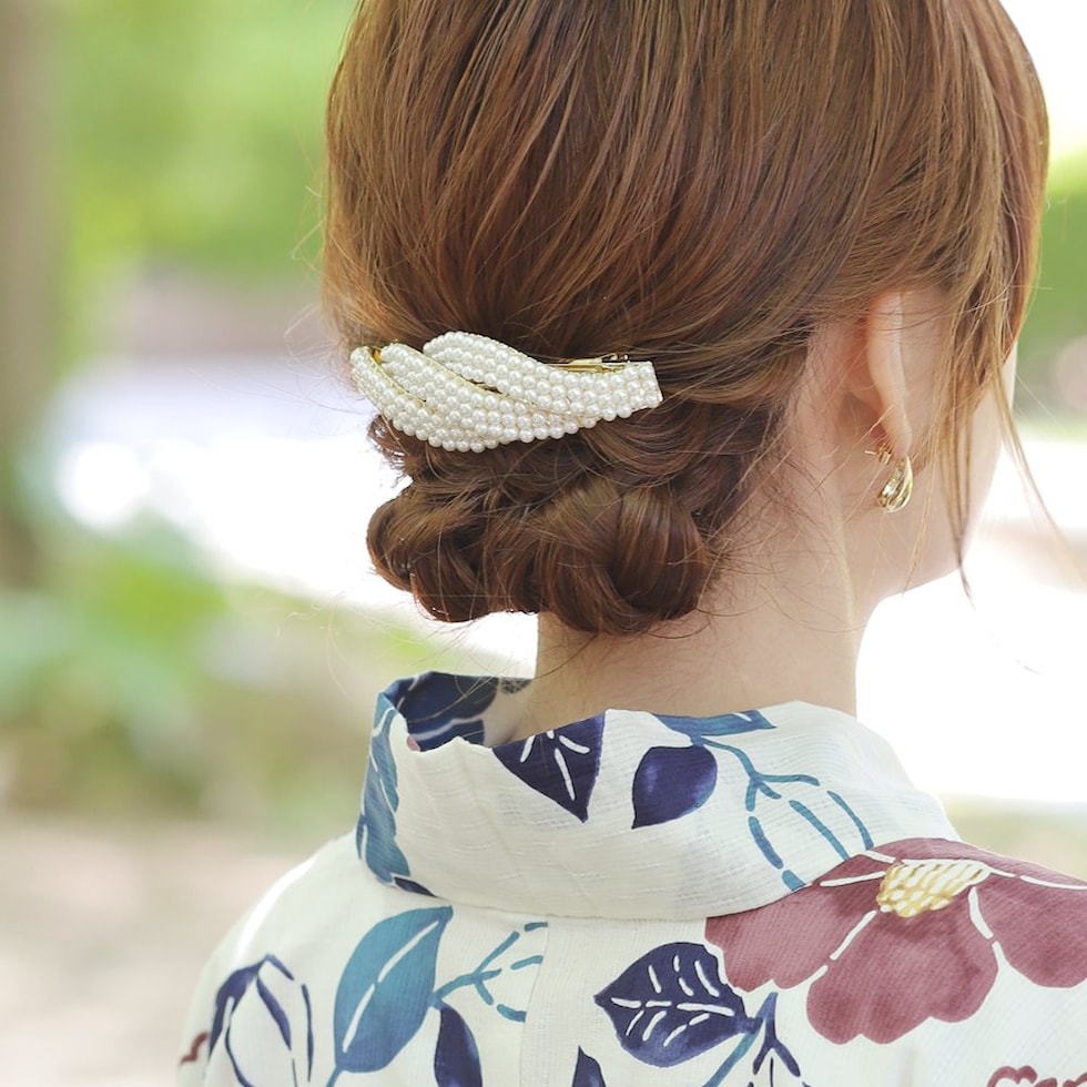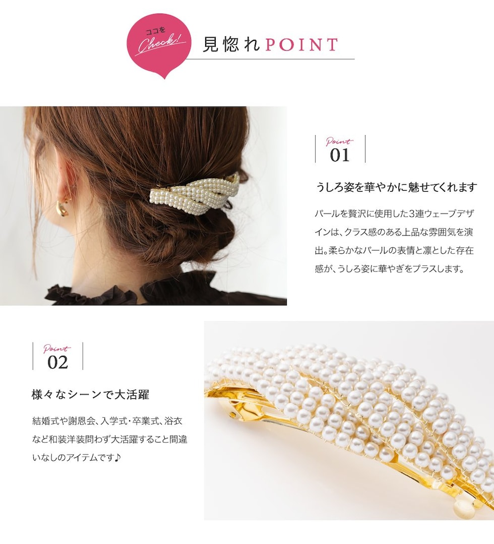 パールを贅沢に使用した3連ウェーブデザインは、クラス感のある上品な雰囲気を演出。柔らかなパールの表情と凛とした存在感が、うしろ姿に華やぎをプラスします。