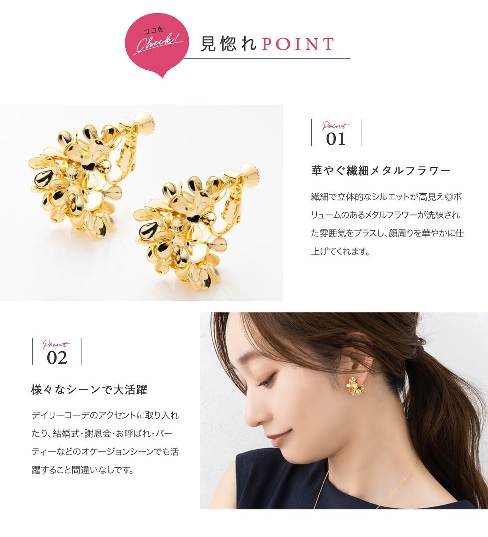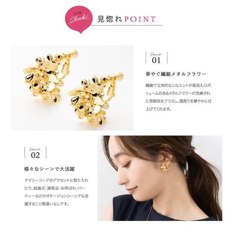 繊細で立体的なシルエットが高見え◎ボリュームのあるメタルフラワーが洗練された雰囲気をプラスし、顔周りを華やかに仕上げてくれます。