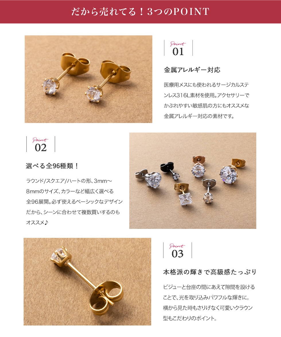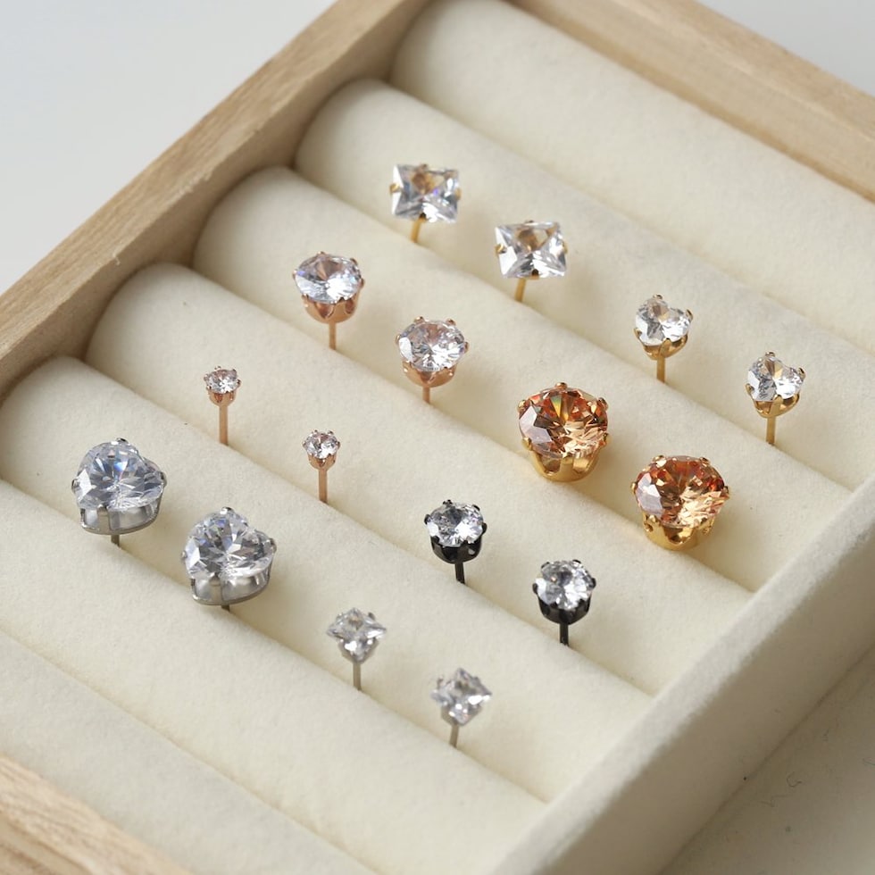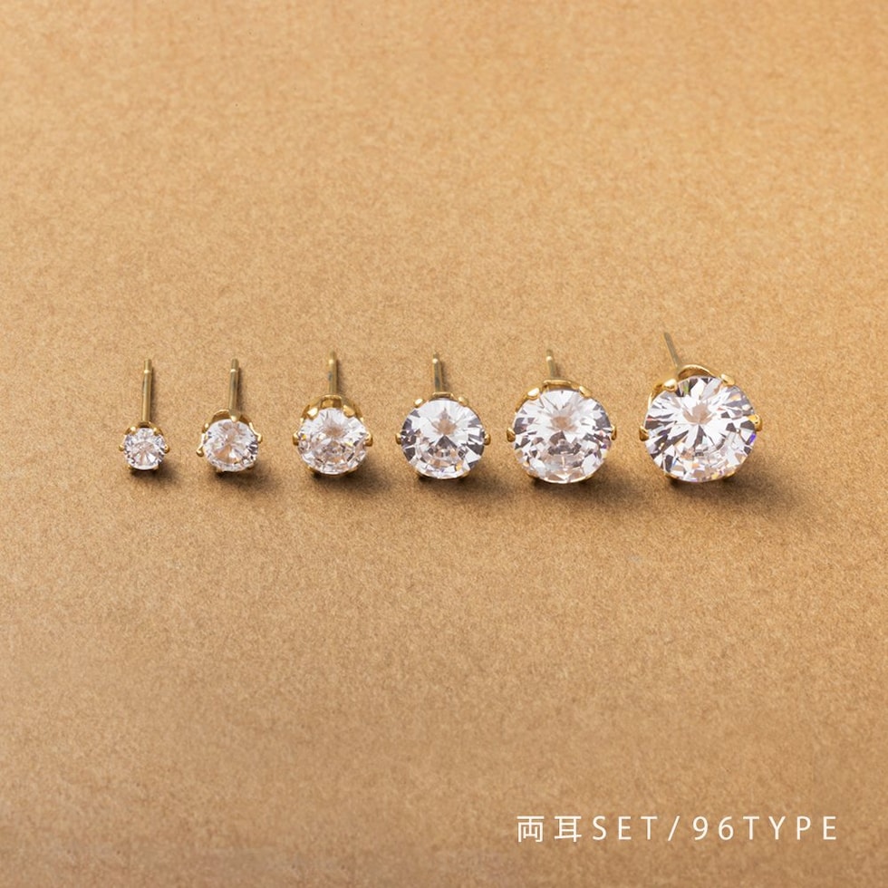 一粒のビジューが品よく煌くシンプルなスタッドピアス。選べる全96種類でデイリー、オフィスやオケージョンなどどんなシーンにも使えます◎クラウン台座でさりげなく立体感を持たせているから横から見ても可愛いデザイン。錆びにくく傷に強いステンレス製で毎日のコーデに活躍間違いナシのアイテムです。