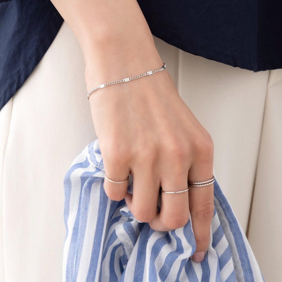 動く度に手元で繊細に煌めき、大人の抜け感を演出。サラッと1本で着用しても、重ね着けしても楽しめるアイテムです。シンプルで品の良いデザインだからリングとも相性◎錆びにくいステンレス製でデイリーに活躍しそう。