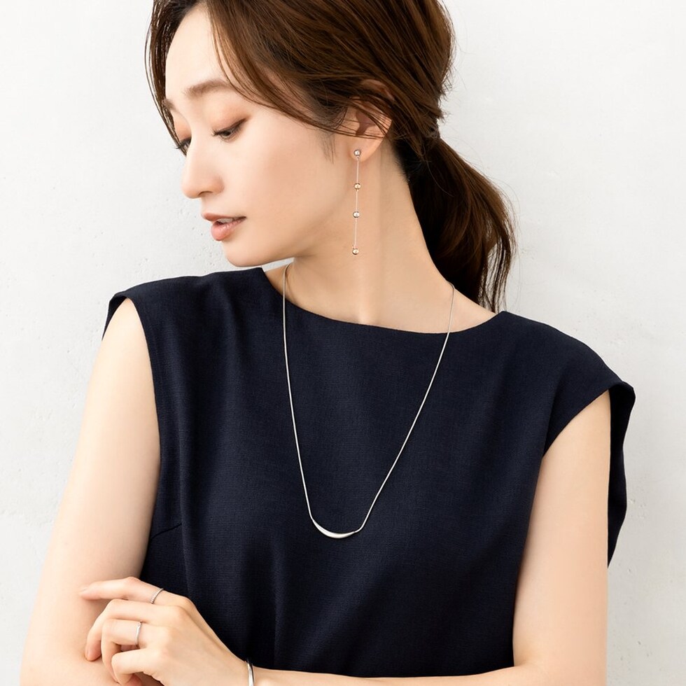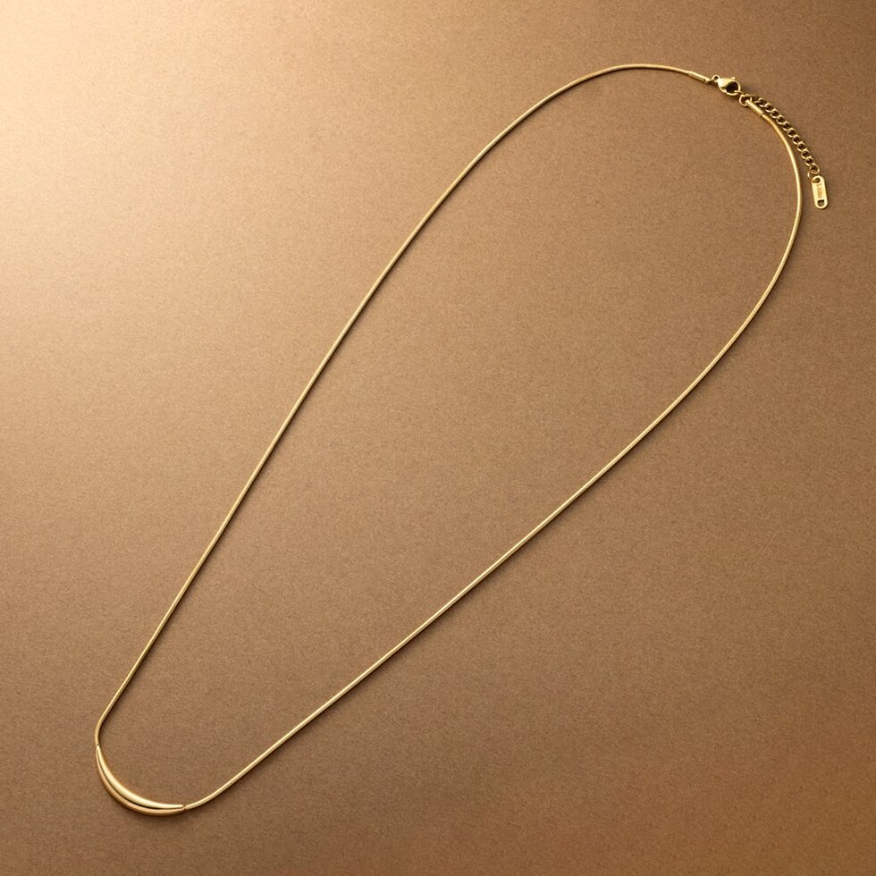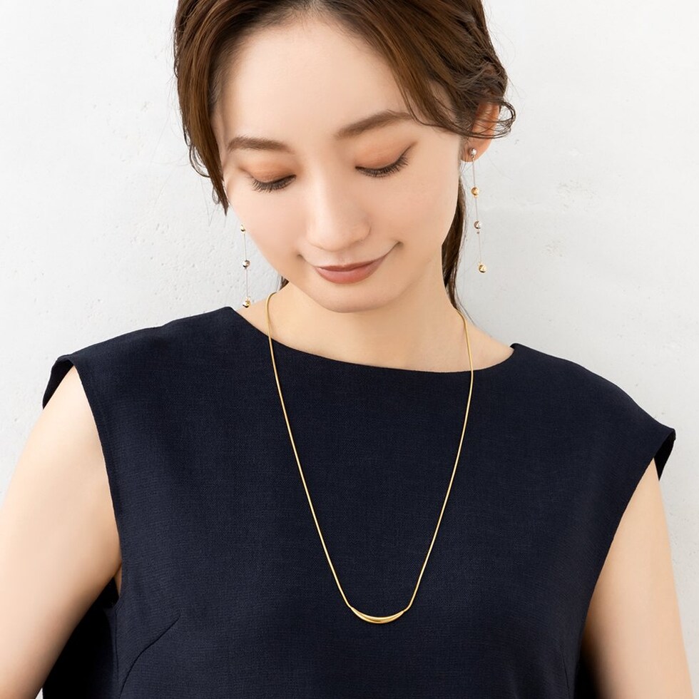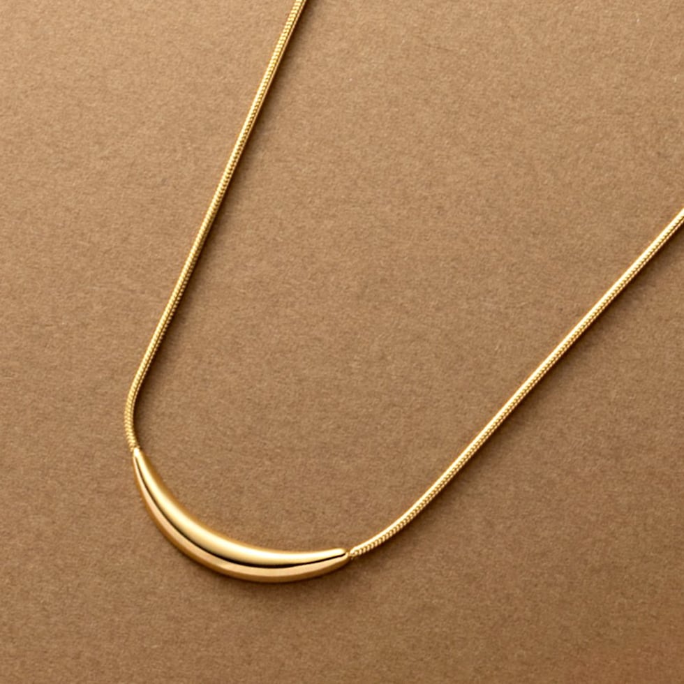艶めくクレッセントモチーフが大人上品なロングネックレス。シンプルなデザインとしなやかなスネークチェーンが、コーデに洗練された雰囲気をプラスします。錆びにくいステンレス製でデイリーに活躍するひと品。