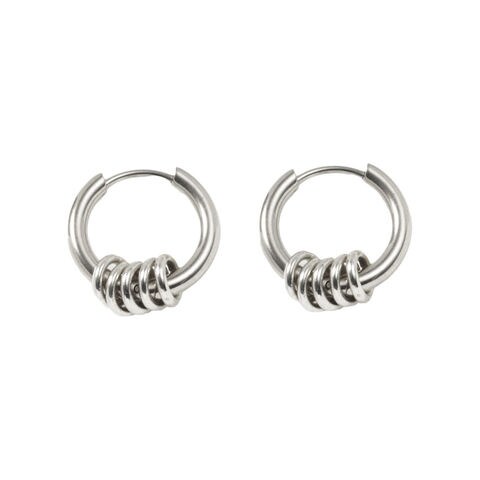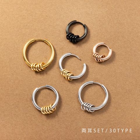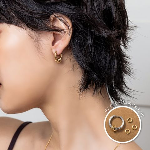 多重リングパーツのキャッチレスフープピアス。男女を問わず身につけられるタイムレスなルックスでコーデに合わせやすいアイテムです。リングパーツはお好みの数にアレンジしたり、取り外してシンプルなフープピアスとして使っても◎錆びにくく傷に強いステンレス製で長く愛用頂けます。