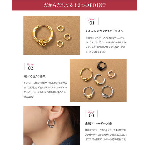 ピアス ステンレス 金属アレルギー サージカルステンレス レディース 30種類 フープ つけっぱなし メンズ 2way リング バイカラー ブラック cream dot ゆうパケット [シルバー_12mm]