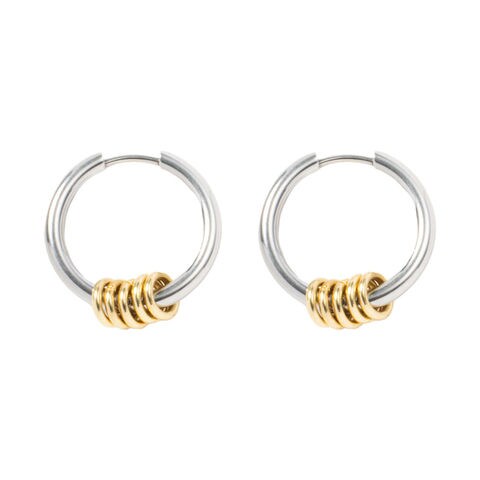 多重リングパーツのキャッチレスフープピアス。男女を問わず身につけられるタイムレスなルックスでコーデに合わせやすいアイテムです。リングパーツはお好みの数にアレンジしたり、取り外してシンプルなフープピアスとして使っても◎錆びにくく傷に強いステンレス製で長く愛用頂けます。