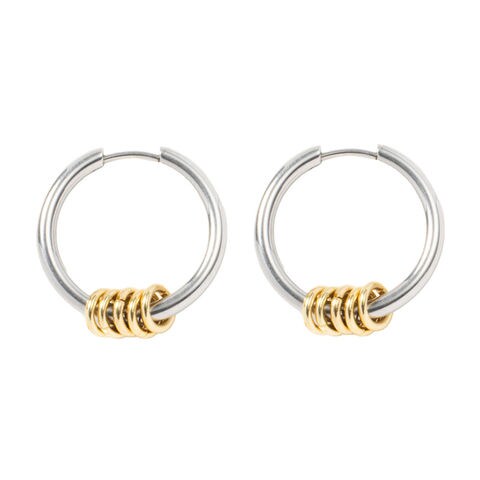 多重リングパーツのキャッチレスフープピアス。男女を問わず身につけられるタイムレスなルックスでコーデに合わせやすいアイテムです。リングパーツはお好みの数にアレンジしたり、取り外してシンプルなフープピアスとして使っても◎錆びにくく傷に強いステンレス製で長く愛用頂けます。