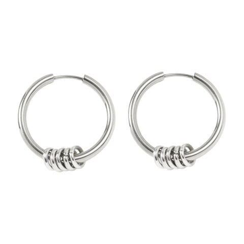 多重リングパーツのキャッチレスフープピアス。男女を問わず身につけられるタイムレスなルックスでコーデに合わせやすいアイテムです。リングパーツはお好みの数にアレンジしたり、取り外してシンプルなフープピアスとして使っても◎錆びにくく傷に強いステンレス製で長く愛用頂けます。