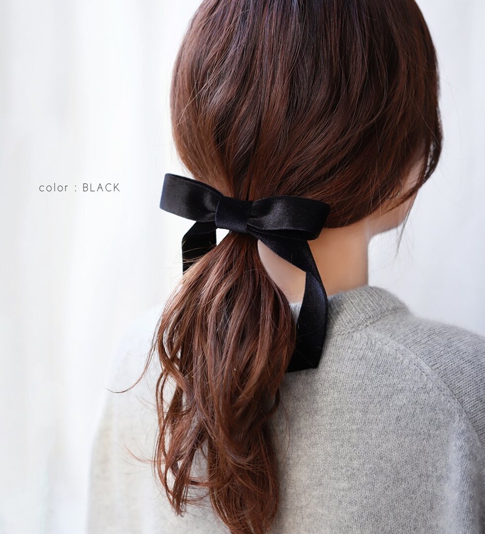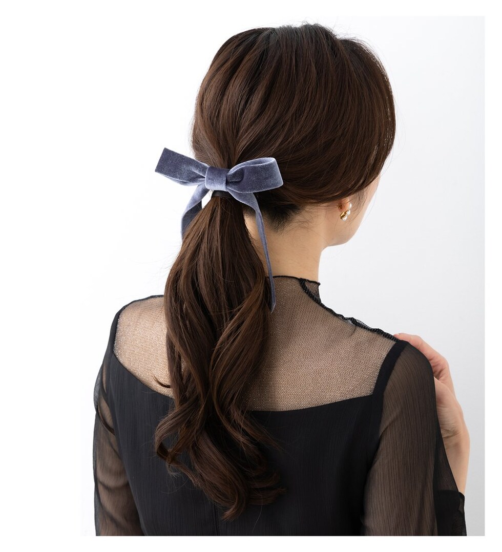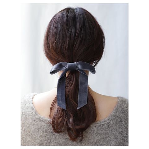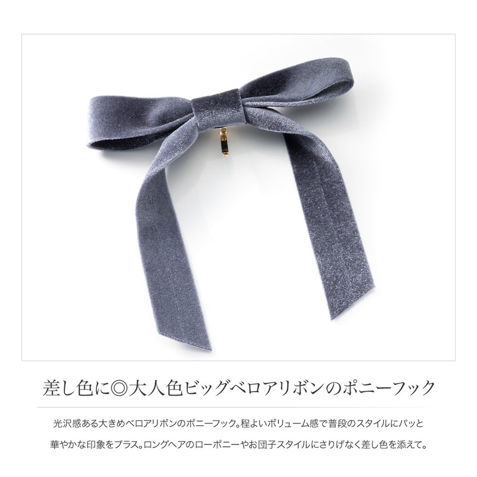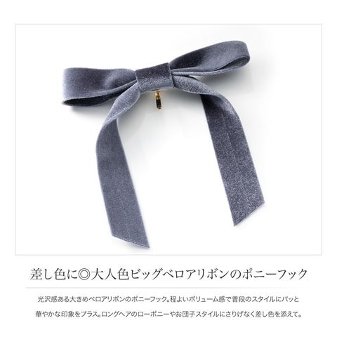光沢感ある大きめベロアリボンのポニーフック。程よいボリューム感で普段のスタイルにパッと華やかな印象をプラス。ロングヘアのローポニーやお団子スタイルにさりげなく差し色を添えて。