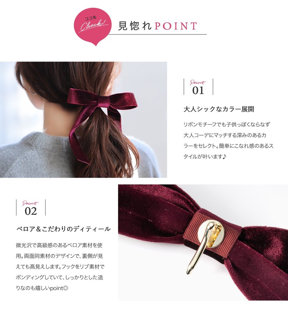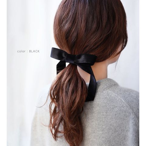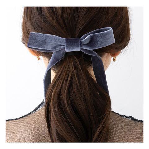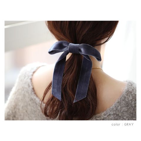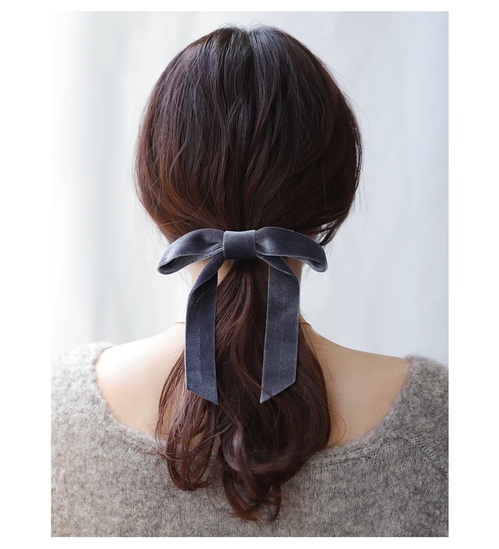 光沢感ある大きめベロアリボンのポニーフック。程よいボリューム感で普段のスタイルにパッと華やかな印象をプラス。ロングヘアのローポニーやお団子スタイルにさりげなく差し色を添えて。