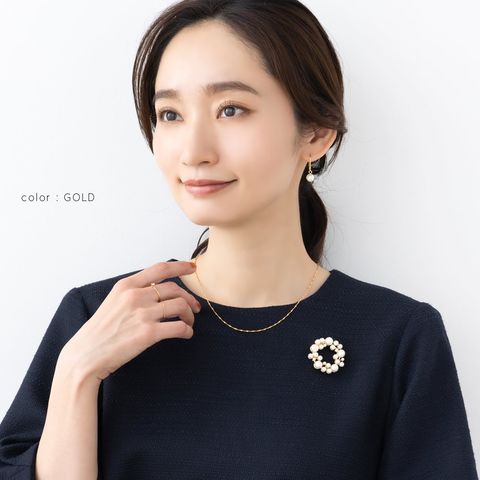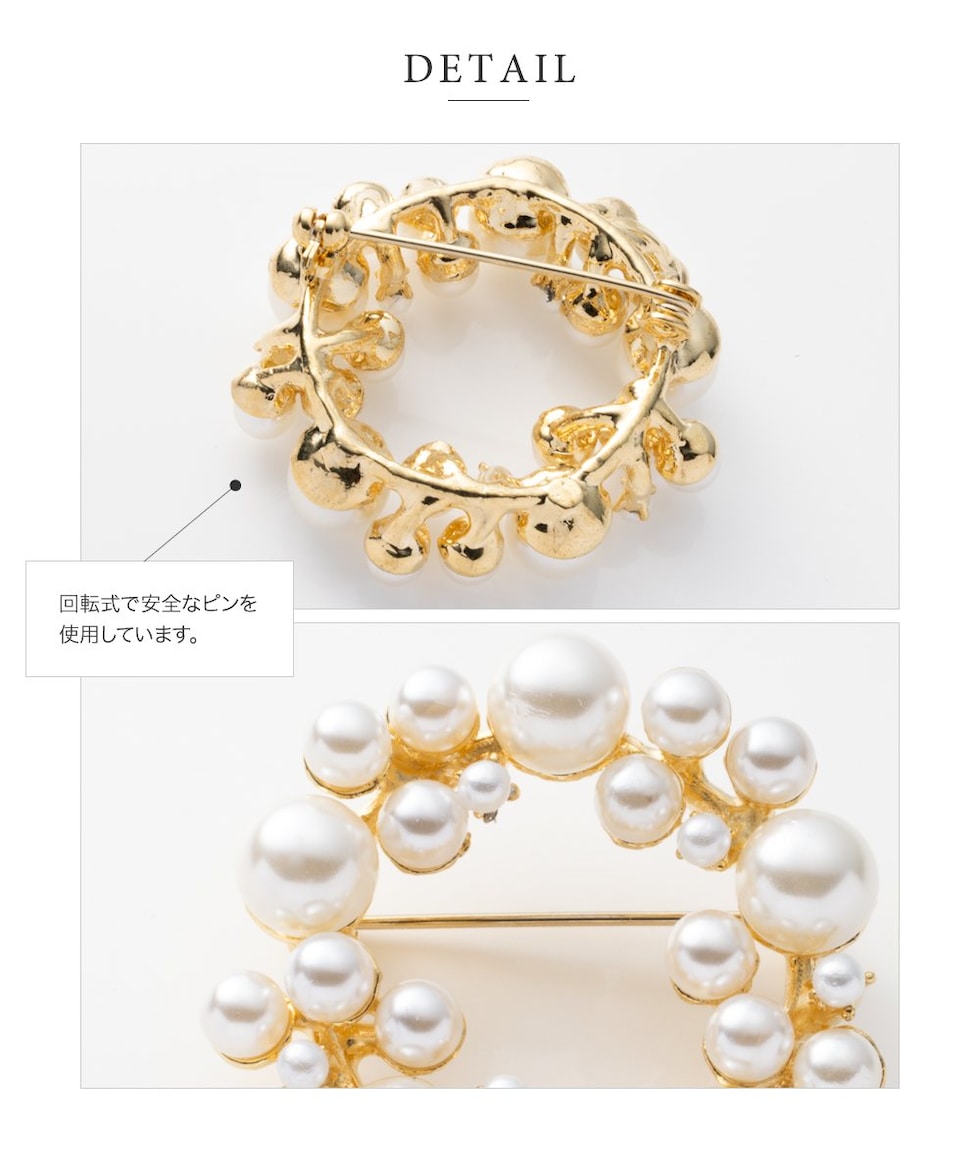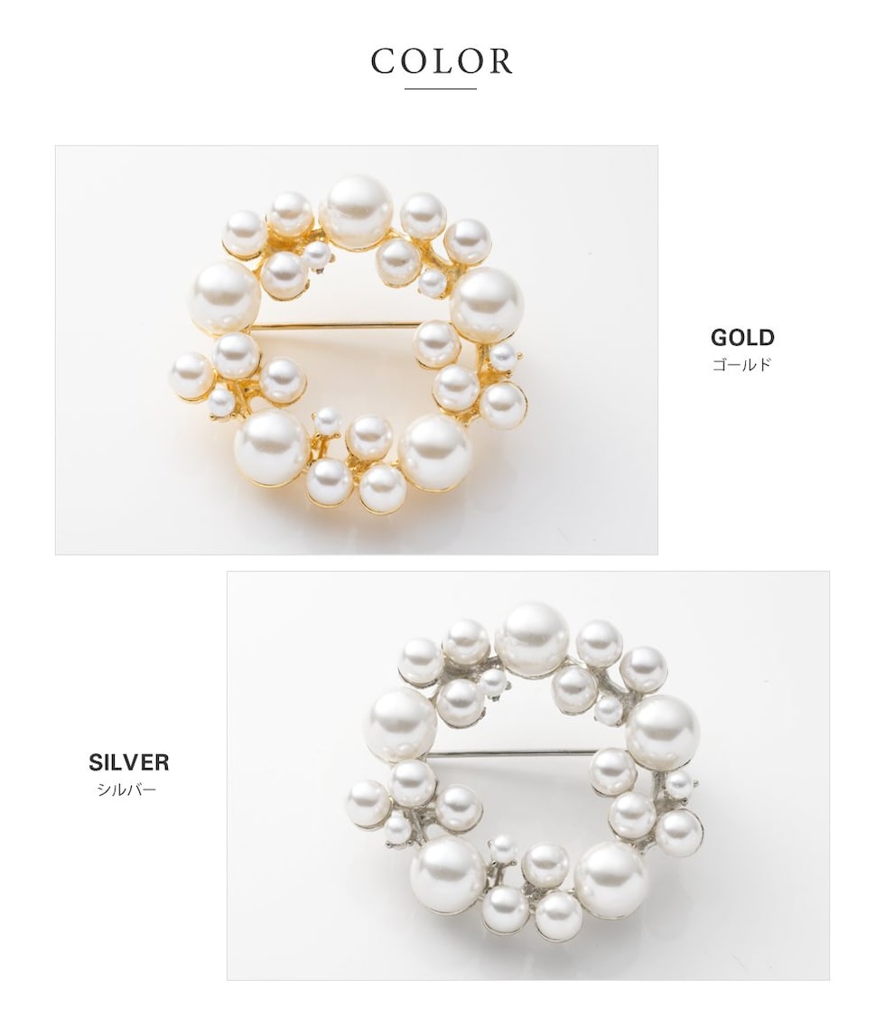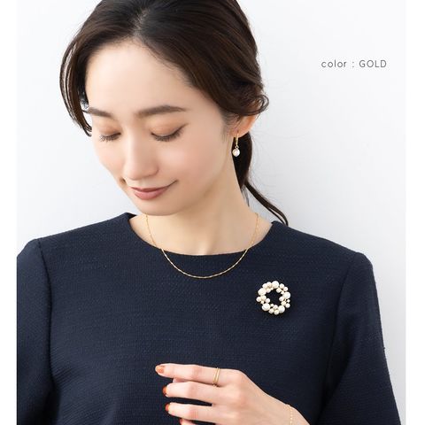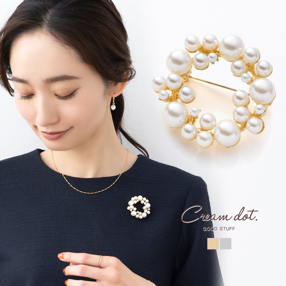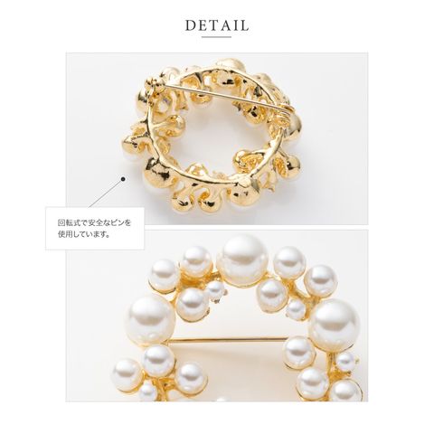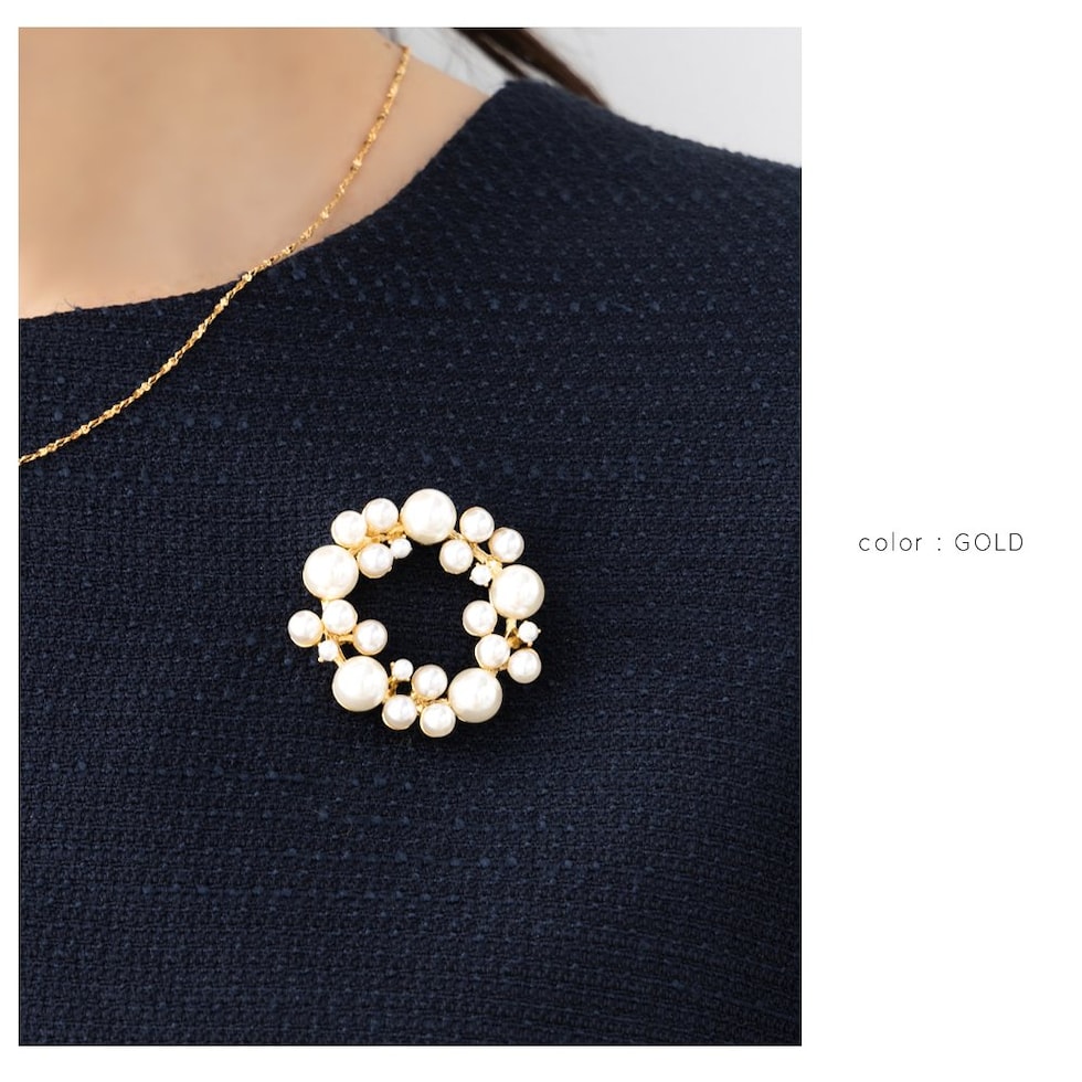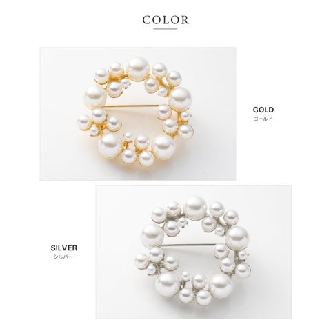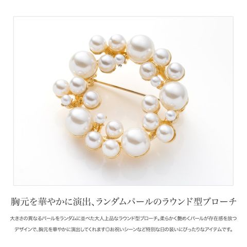 大きさの異なるパールをランダムに並べた大人上品なラウンド型ブローチ。柔らかく艶めくパールが存在感を放つデザインで、胸元を華やかに演出してくれます◎お祝いシーンなど特別な日の装いにぴったりなアイテムです。
