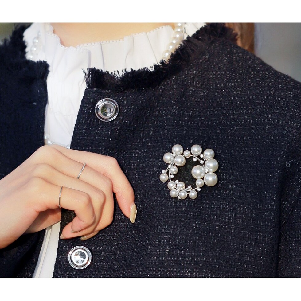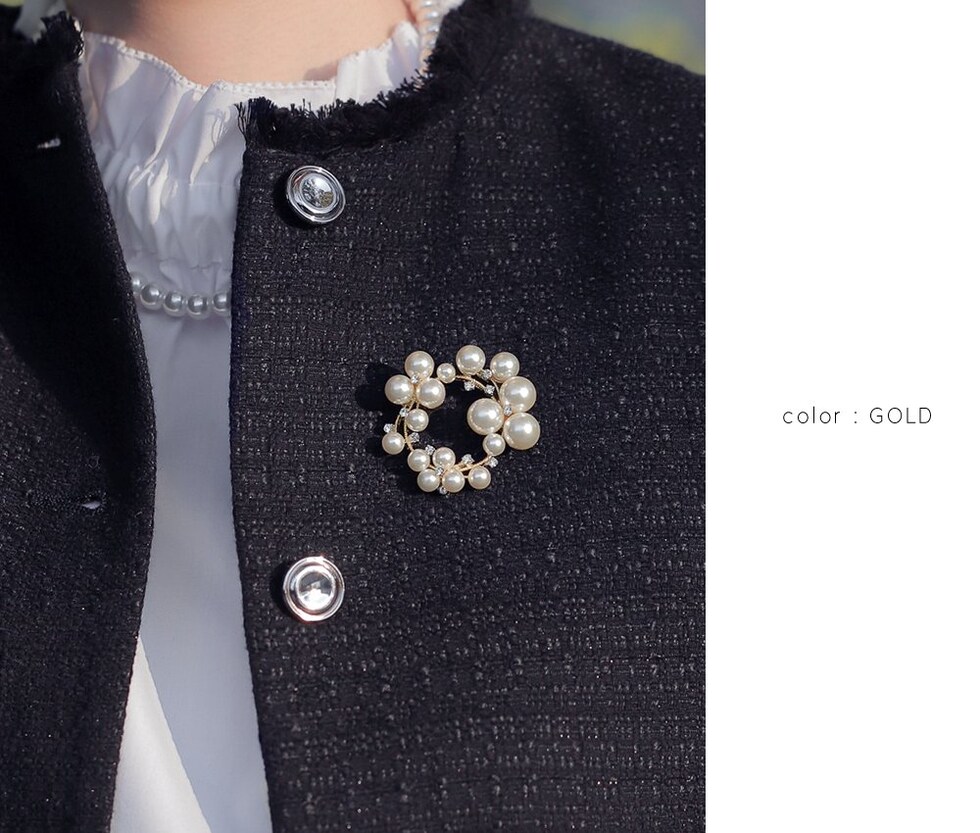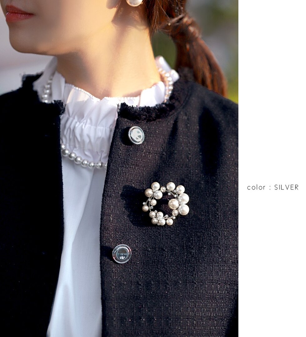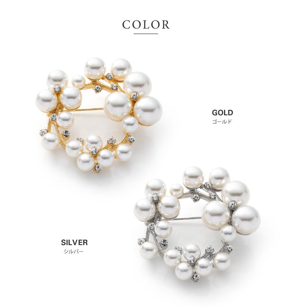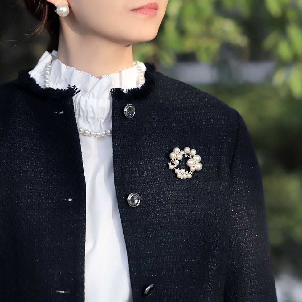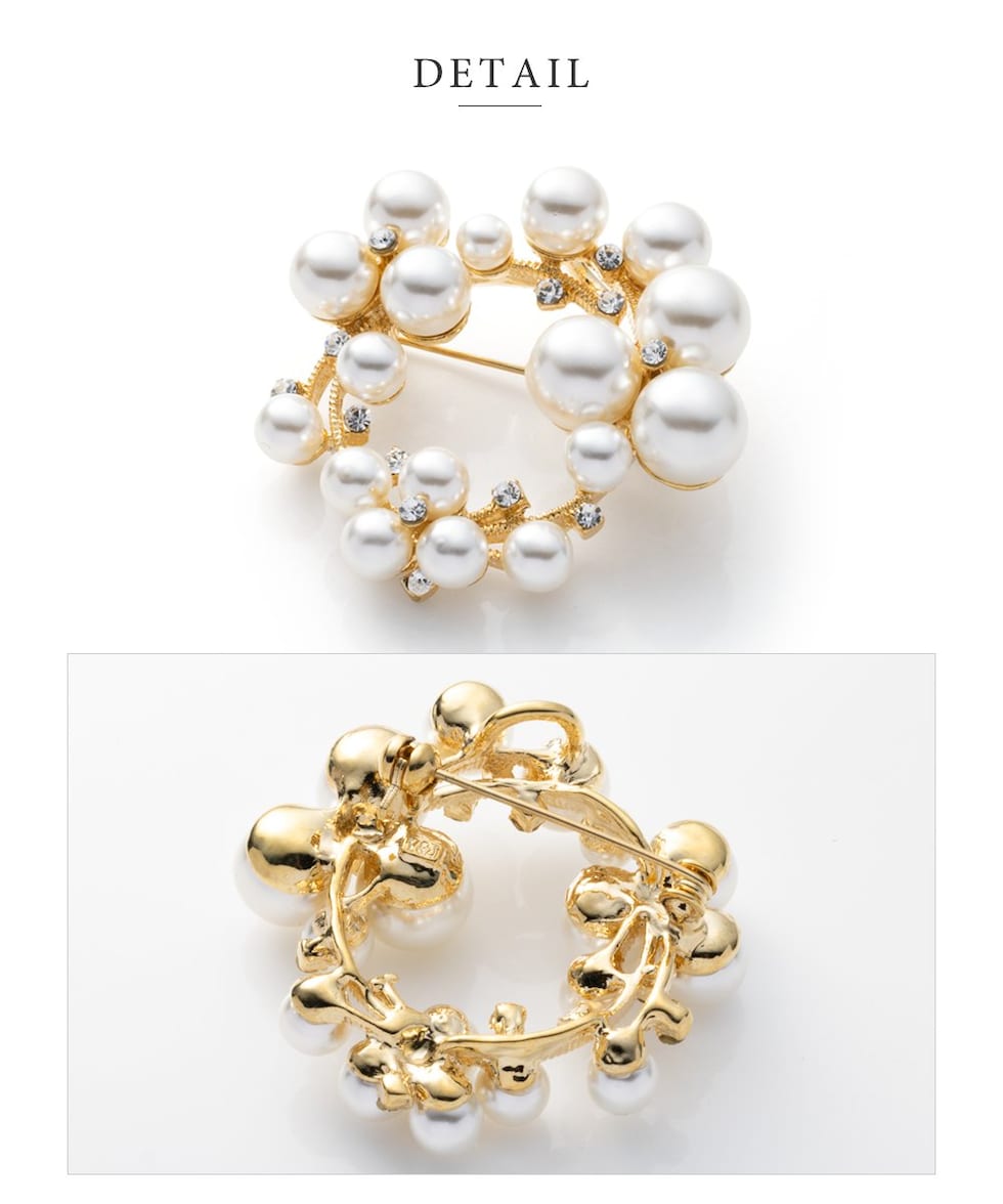 大きさの異なるパールを円形に並べた大人上品なブローチ。小粒なビジューとパールの艶めきが優美な雰囲気を高めます。お祝いシーンなど華やかな装いのワンポイントにオススメなひと品。