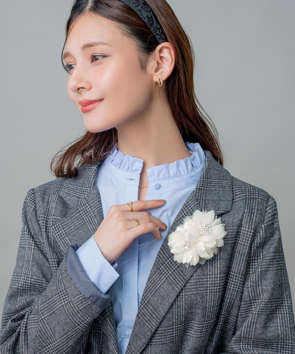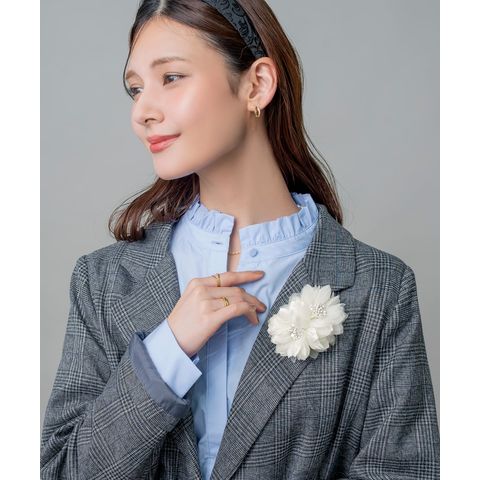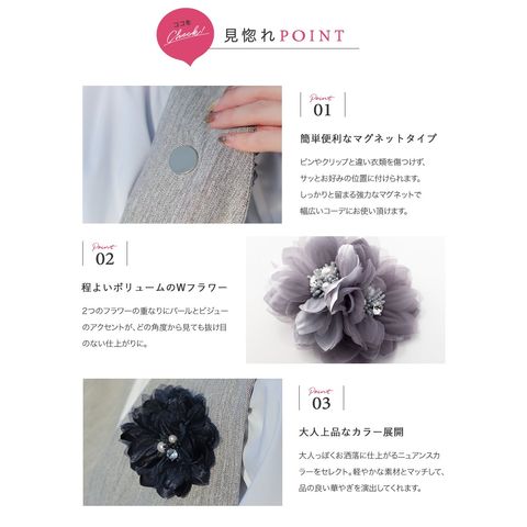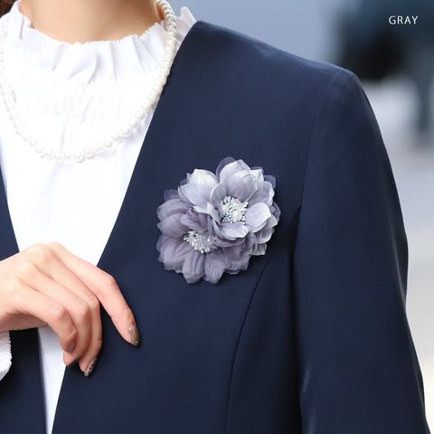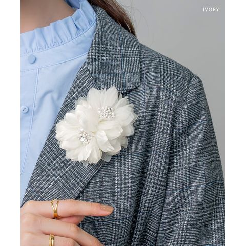 パールとビジューをあしらったフラワーを2つ連ねたコサージュ。立体的なフラワーが華やかな印象で、セレモニースタイルにぴったりなアイテム。強力マグネットを使用しているので、衣類を傷つけることなく簡単に装着できます。