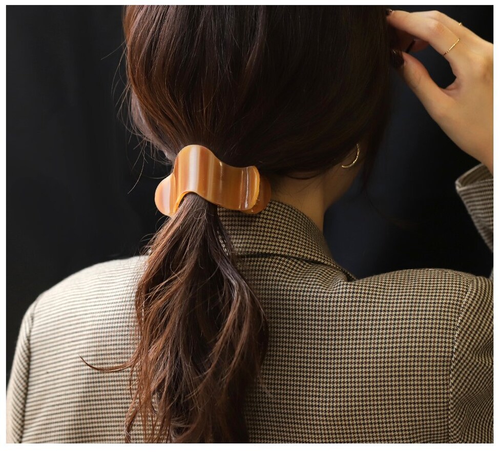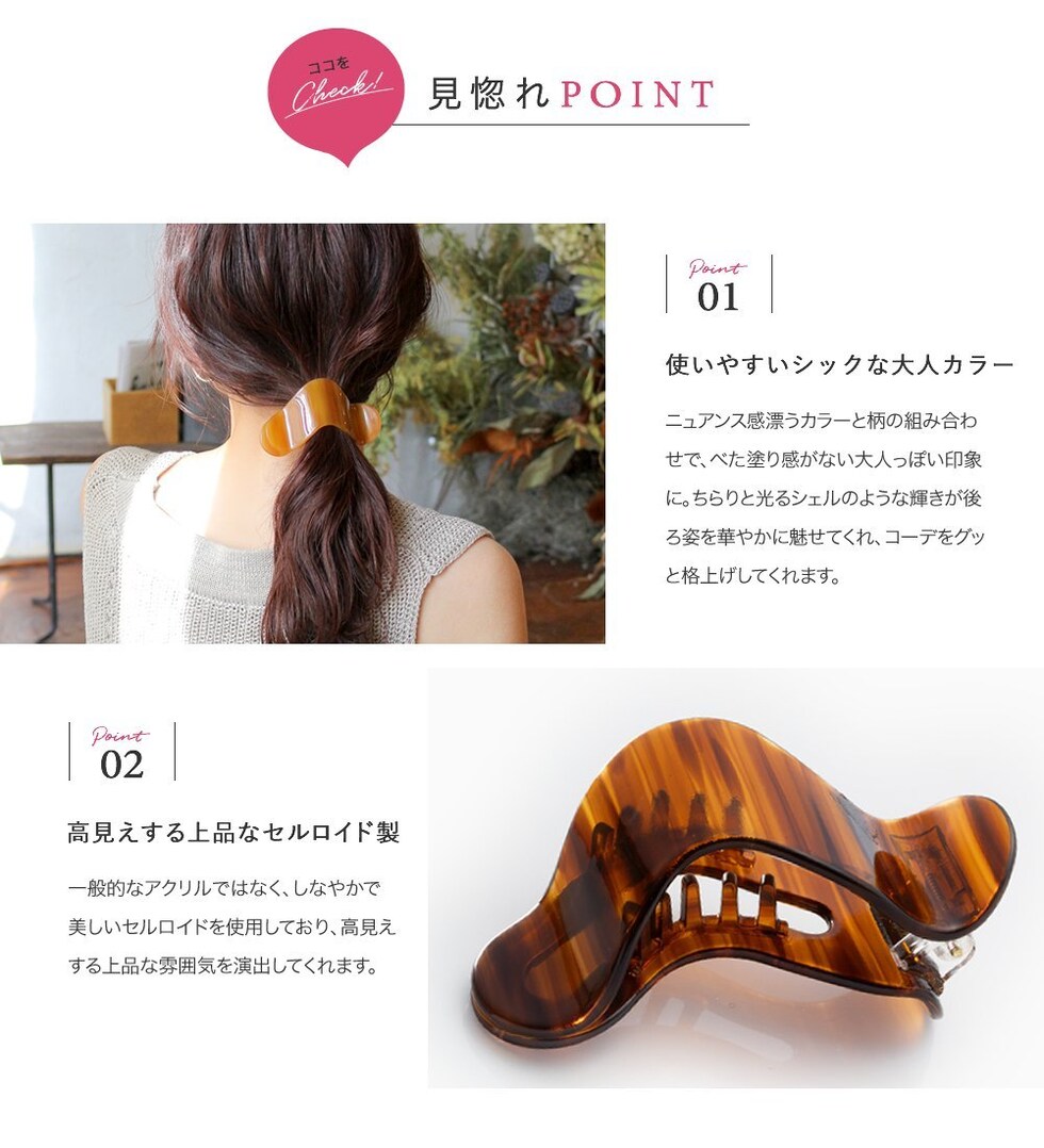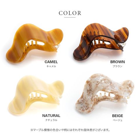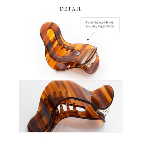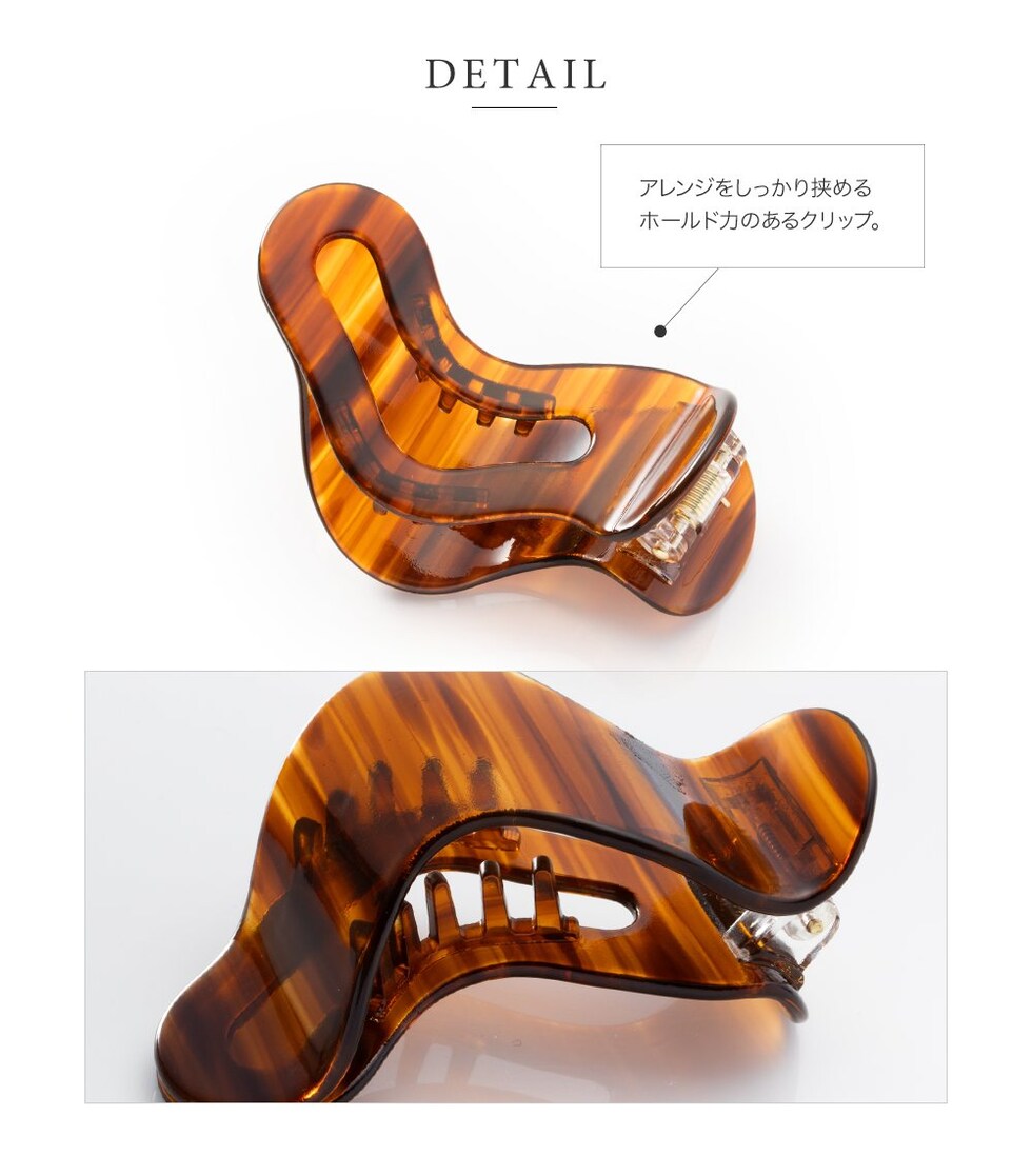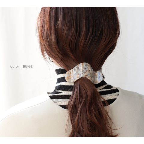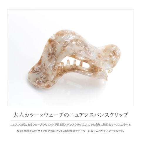 ニュアンス感のあるウェーブシルエットが目を惹くバンスクリップ。大人でも自然に馴染むマーブルカラーと程よく個性的なデザインが絶妙にマッチ。着脱簡単でデイリーに取り入れやすいアイテムです。