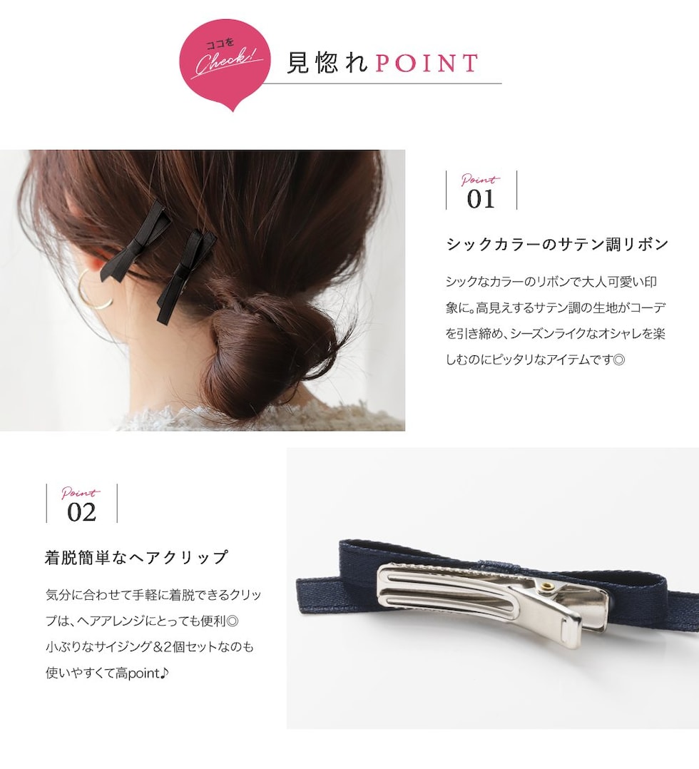 気分に合わせて手軽に着脱できるクリップは、ヘアアレンジにとっても便利◎小ぶりなサイジング&2個セットなのも使いやすくて高point♪