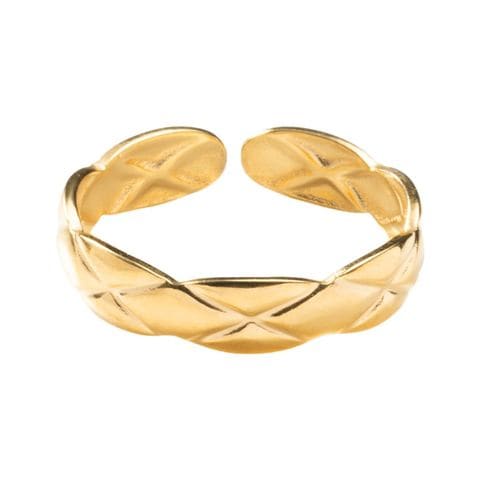 メタルとキルティング柄のコンビが印象的なリング。調節できるオープンタイプだから色々な指に着用可能です♪ほど良いボリューム感で大人の手元のアクセントにオススメ。錆びにくく傷に強いステンレス製です。