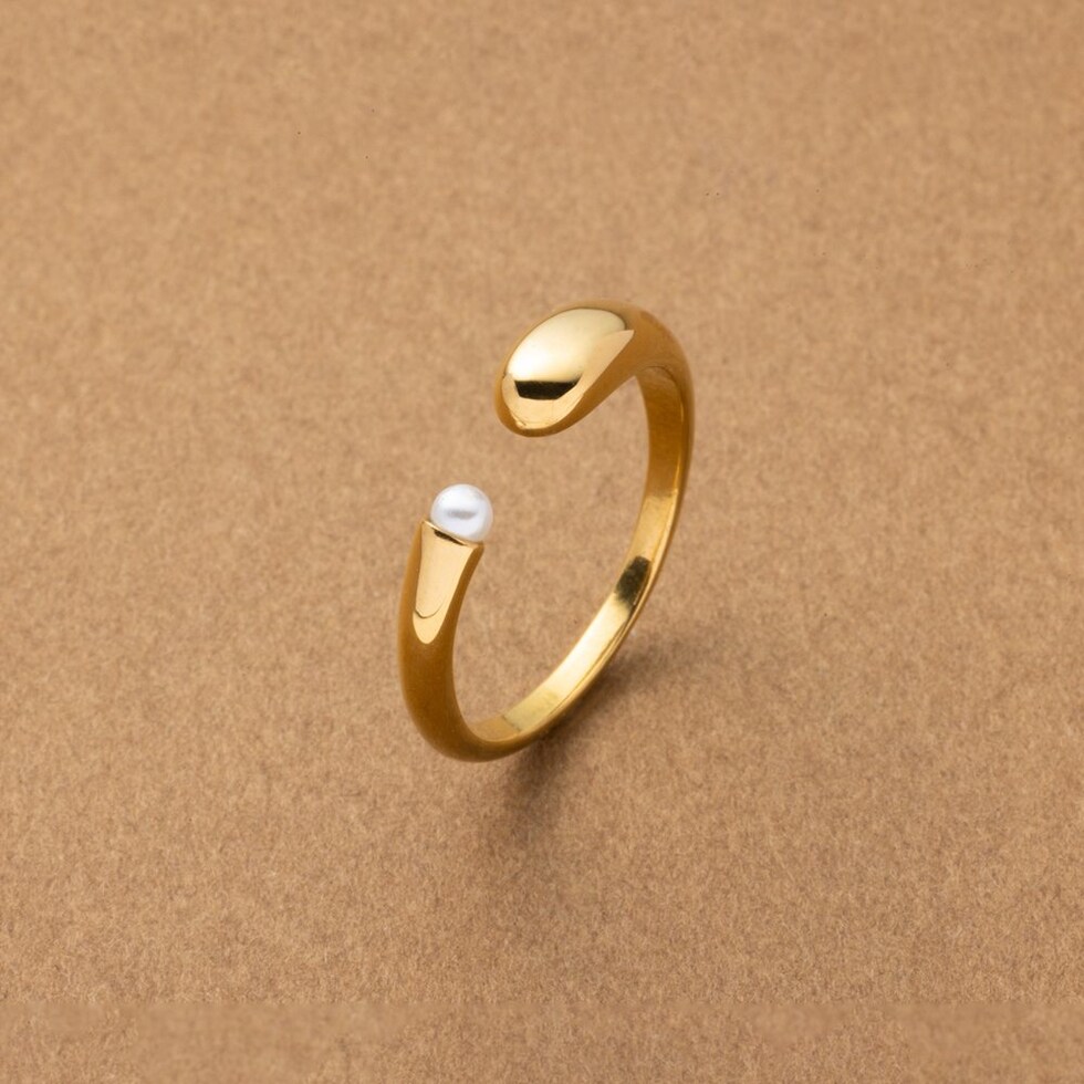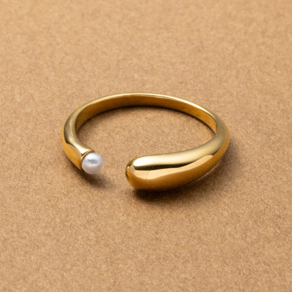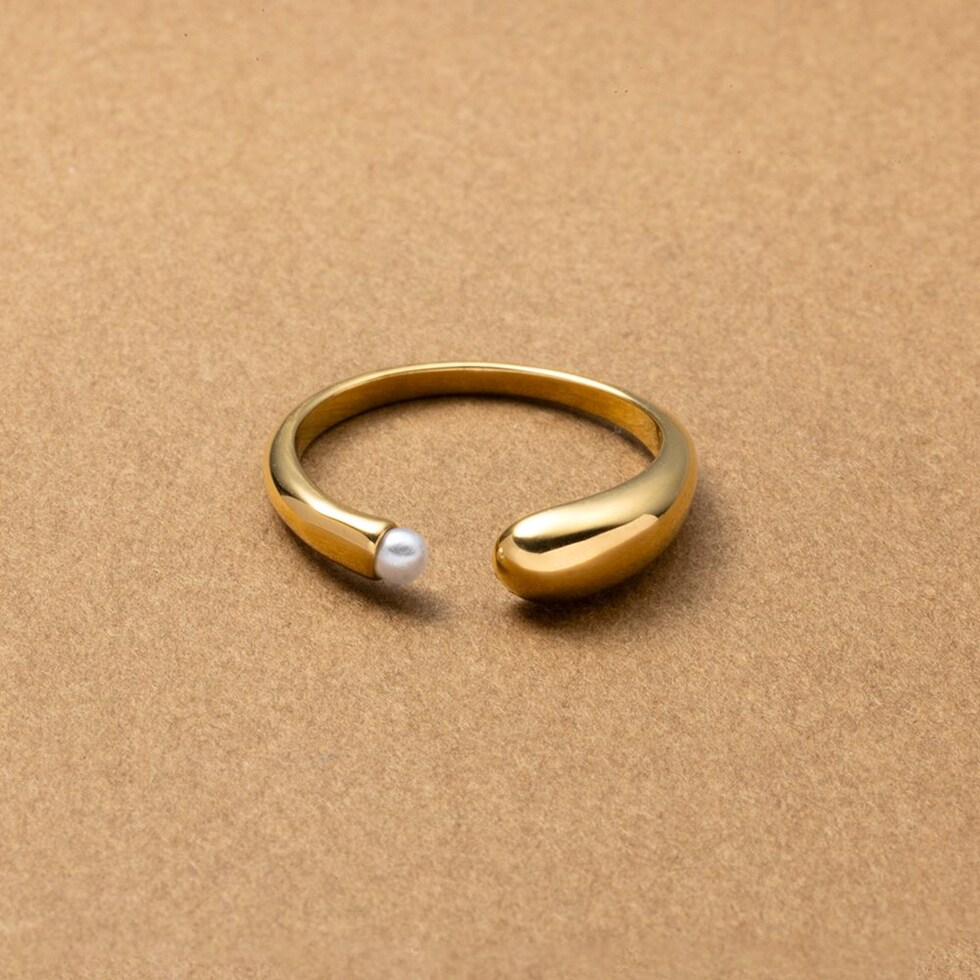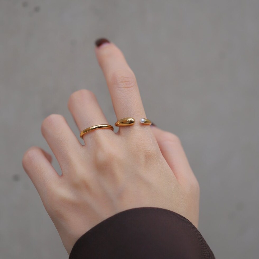 ぷっくり感が可愛いドロップモチーフにパールをちょこんとのせた華奢なデザインリング。オープンデザインが手元に程よい抜け感を演出します。錆びにくく傷に強いステンレス製で、デイリーに活躍してくれるひと品。