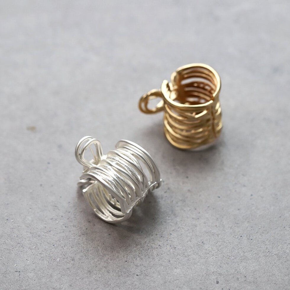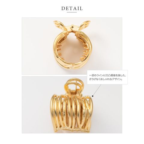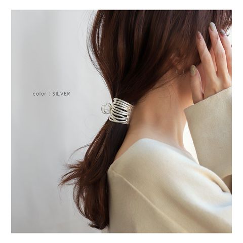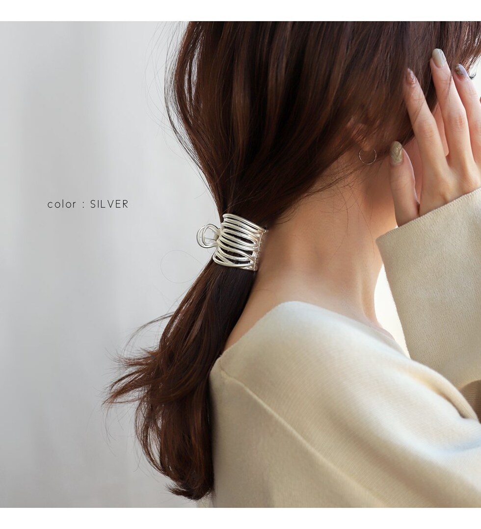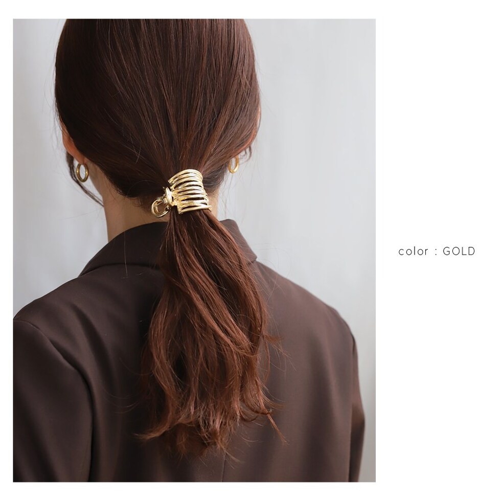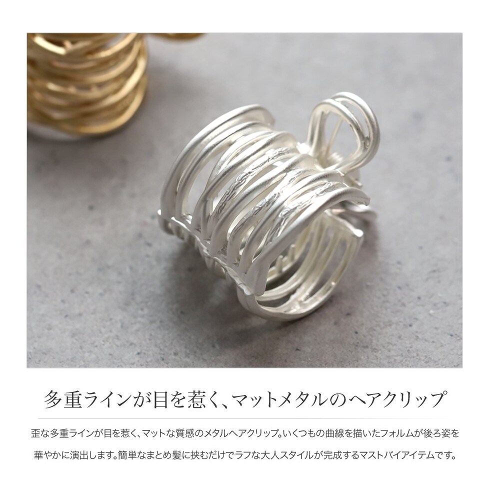 歪な多重ラインが目を惹く、マットな質感のメタルヘアクリップ。いくつもの曲線を描いたフォルムが後ろ姿を華やかに演出します。簡単なまとめ髪に挟むだけでラフな大人スタイルが完成するマストバイアイテムです。