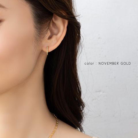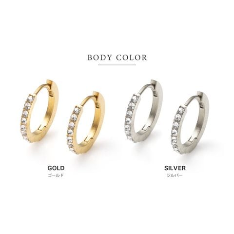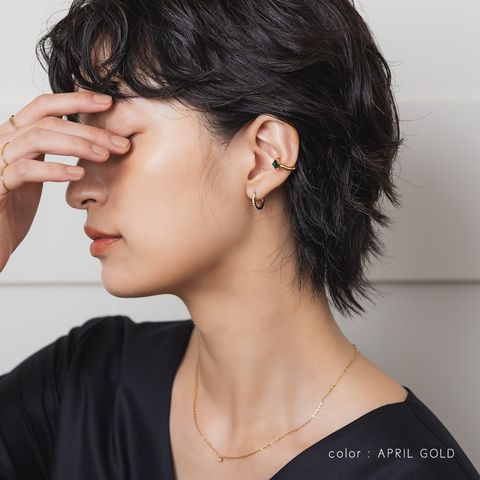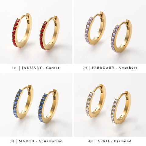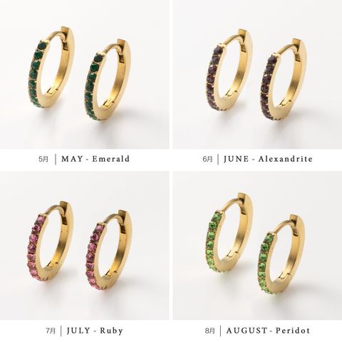 並んだカラービジューがリッチで上品な印象を演出するキャッチレスフープピアス。誕生月をイメージしたビジューがコーデにアクセントを添えてくれます。シンプルなデザインと錆びにくく傷に強いステンレス製でデイリーに大活躍。長時間の着用も安心の低アレルギー素材です。