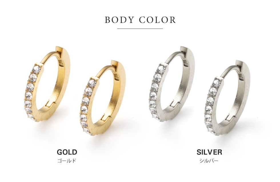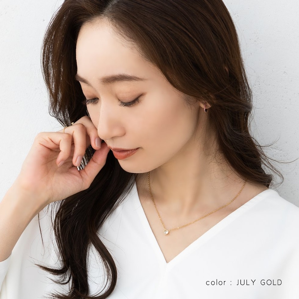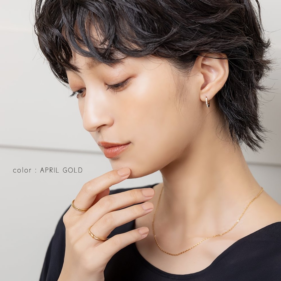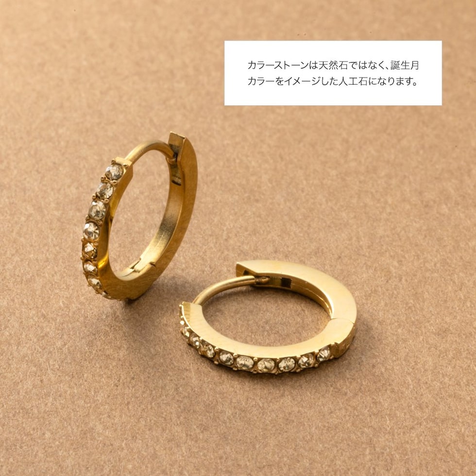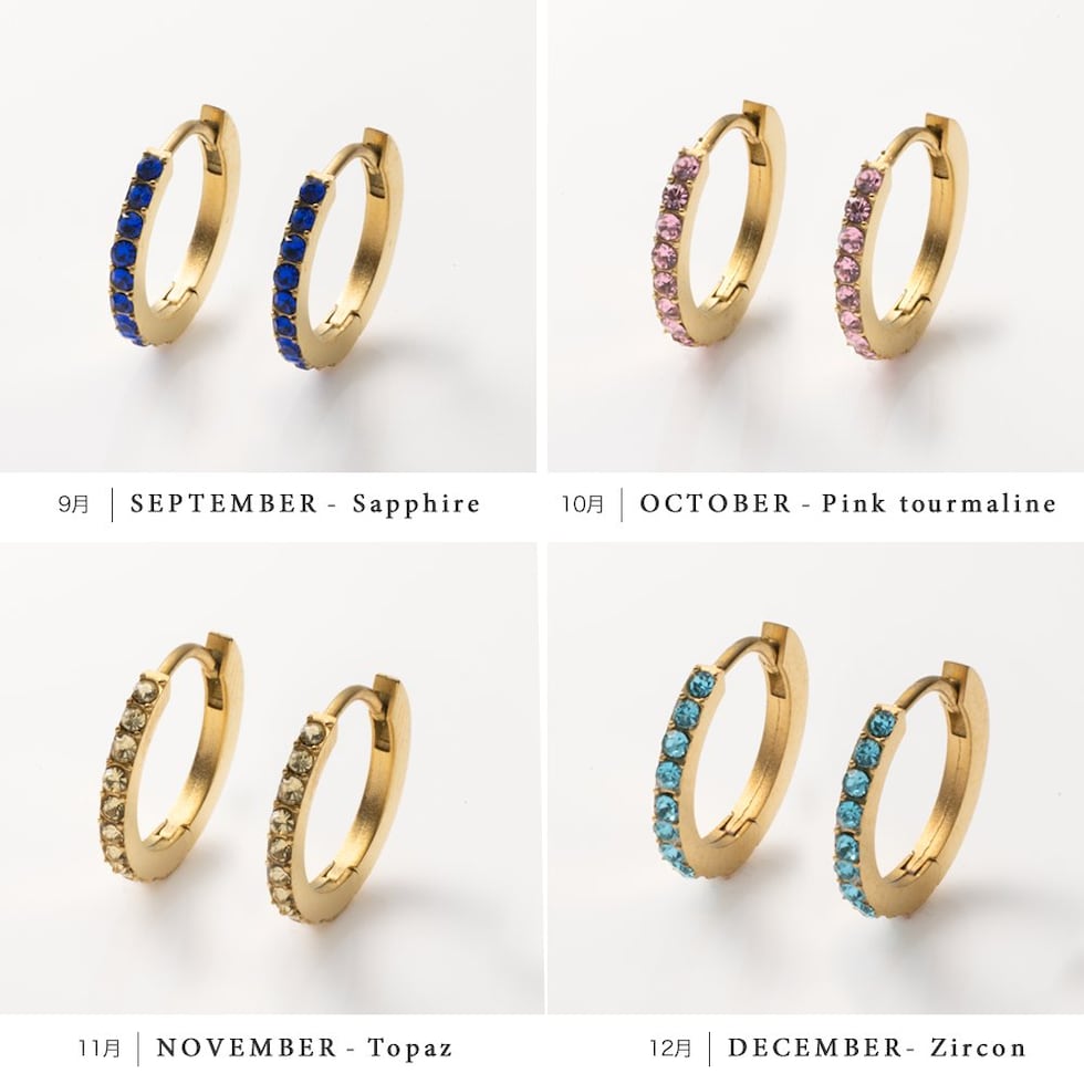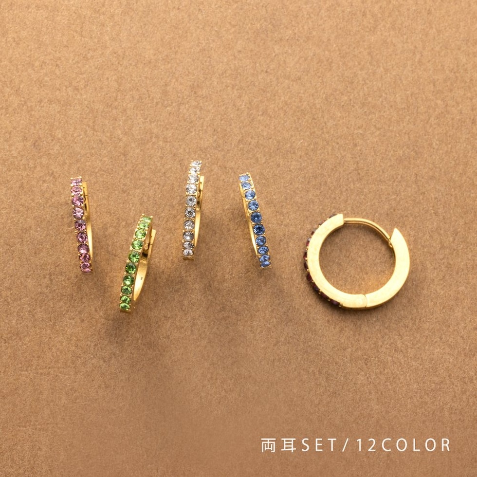 並んだカラービジューがリッチで上品な印象を演出するキャッチレスフープピアス。誕生月をイメージしたビジューがコーデにアクセントを添えてくれます。シンプルなデザインと錆びにくく傷に強いステンレス製でデイリーに大活躍。長時間の着用も安心の低アレルギー素材です。
