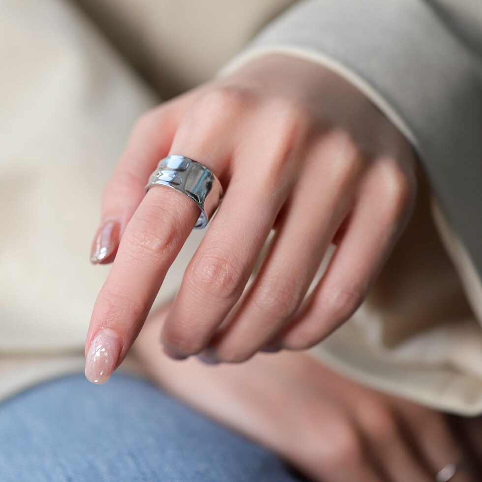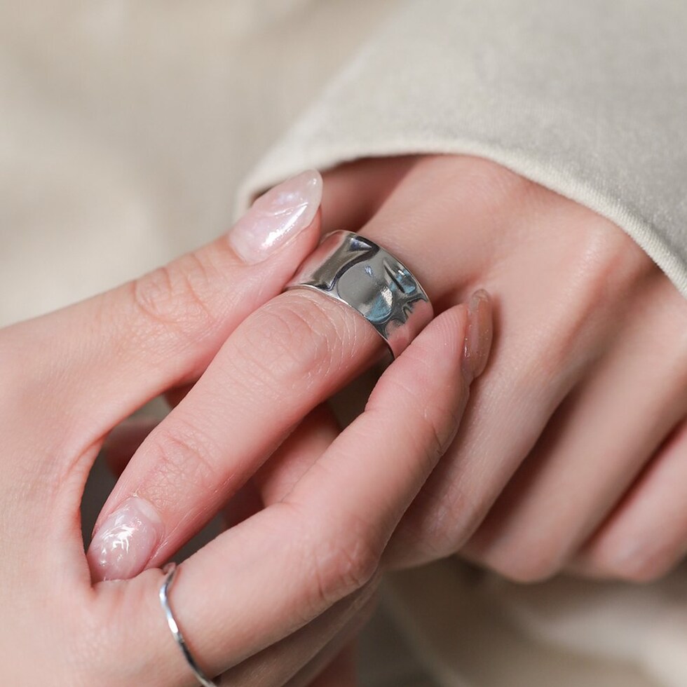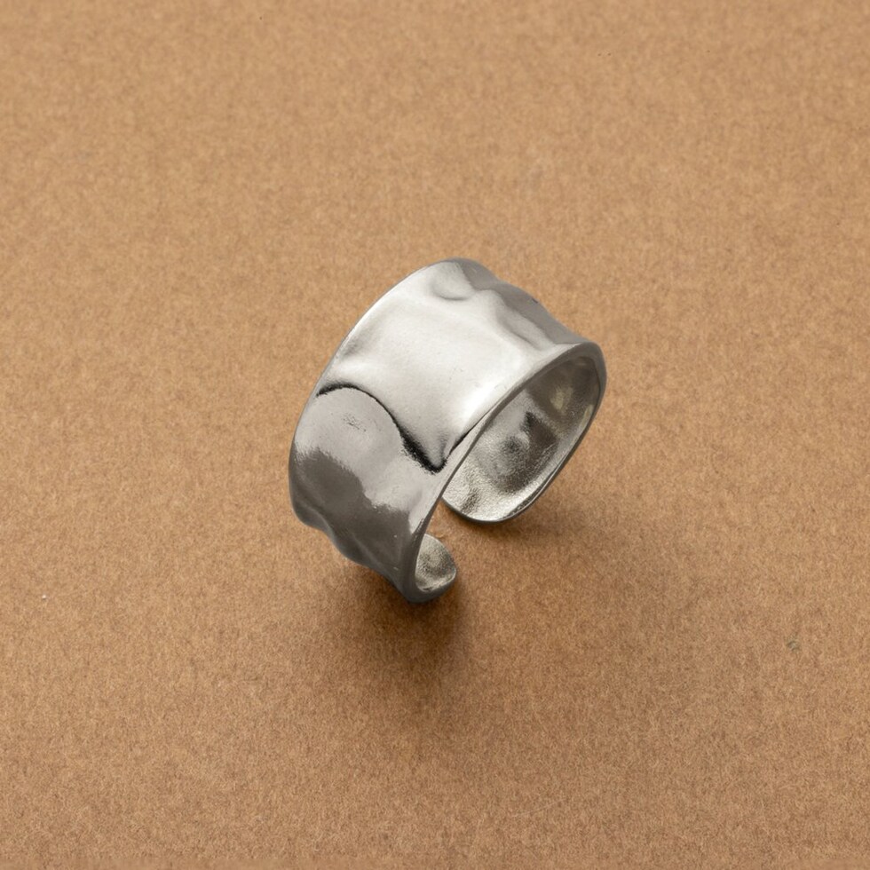 さりげなく凹凸テクスチャを施したワイドオープンリング。若干シェイプしたデザインが高見えで、ニュアンスたっぷりな印象。イヤーカフとしても使える2WAYデザインです。錆びにくく傷に強いステンレス製で、デイリーに活躍してくれそう◎