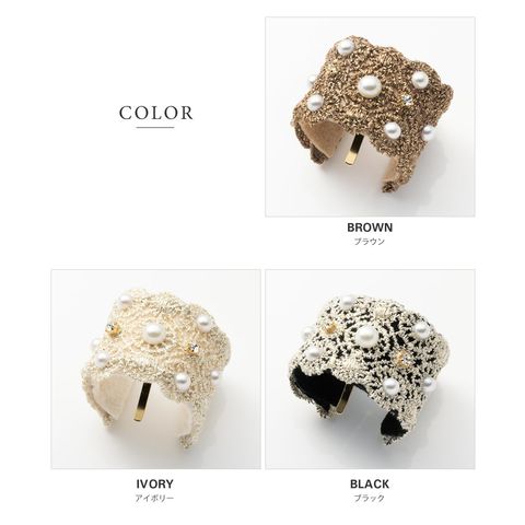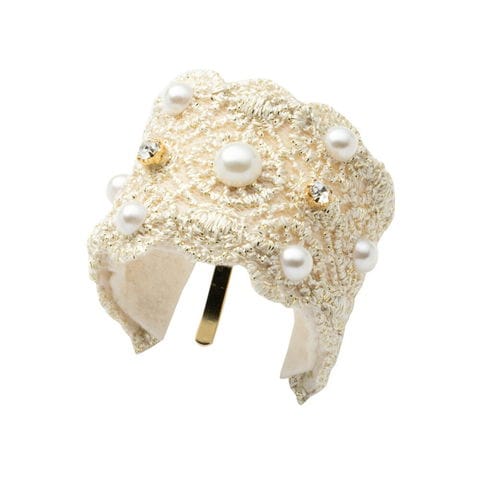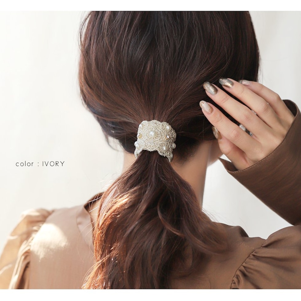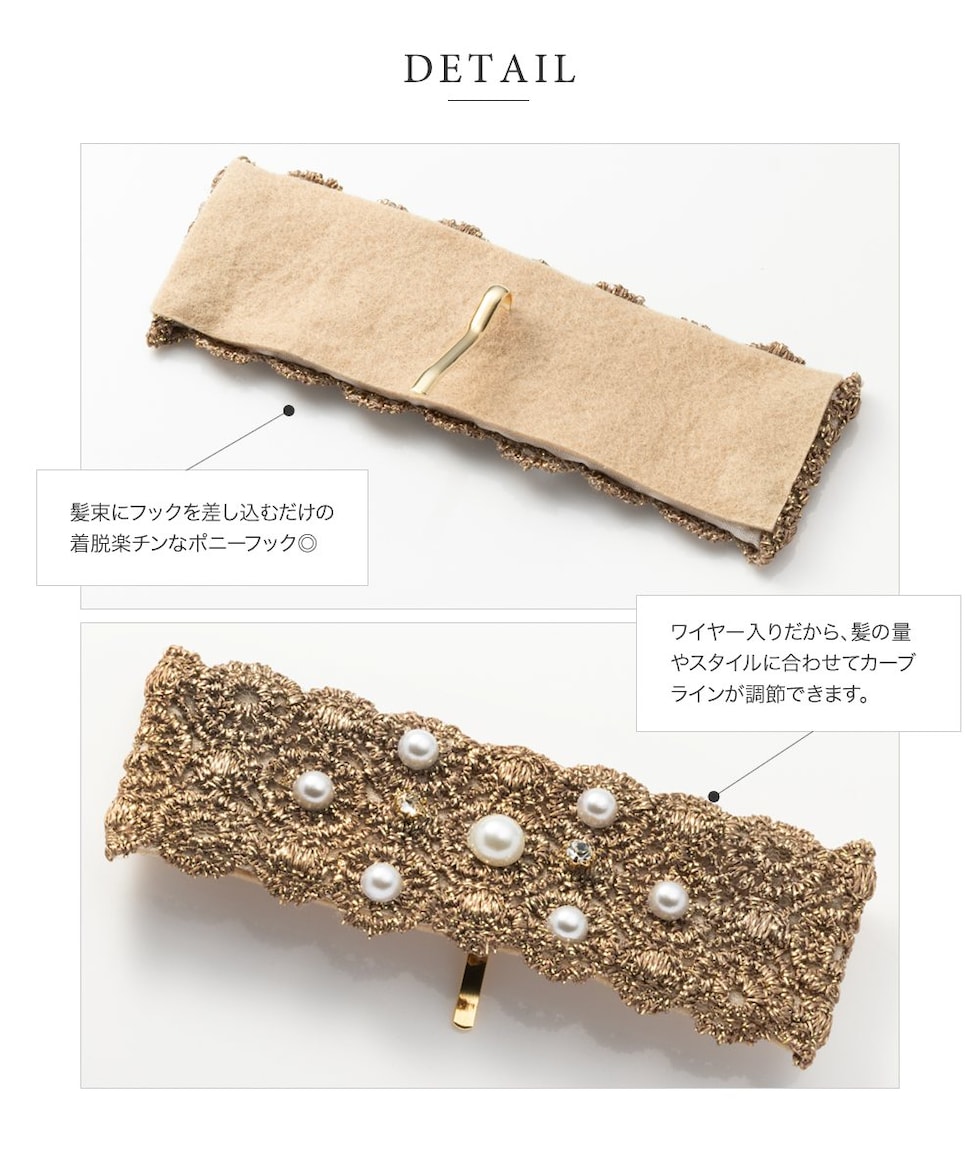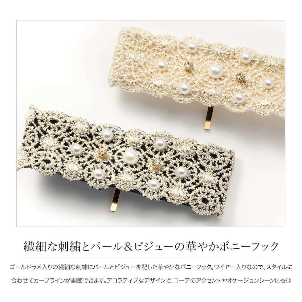 ゴールドラメ入りの繊細な刺繍にパールとビジューを配した華やかなポニーフック。ワイヤー入りなので、スタイルに合わせてカーブラインが調節できます。デコラティブなデザインで、コーデのアクセントやオケージョンシーンにも◎