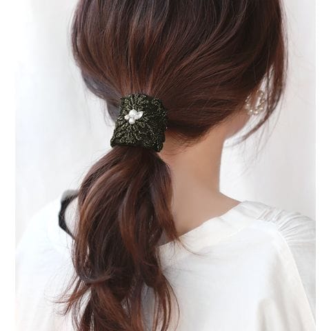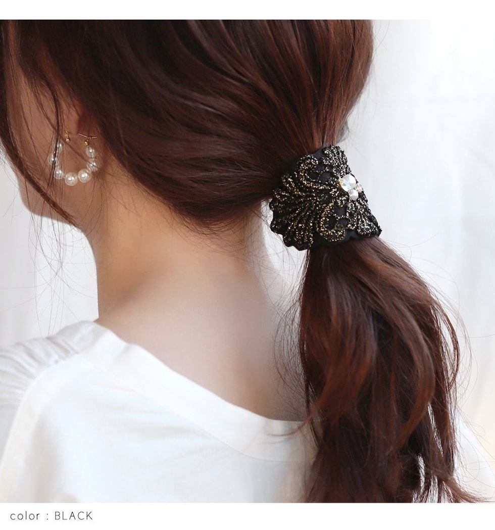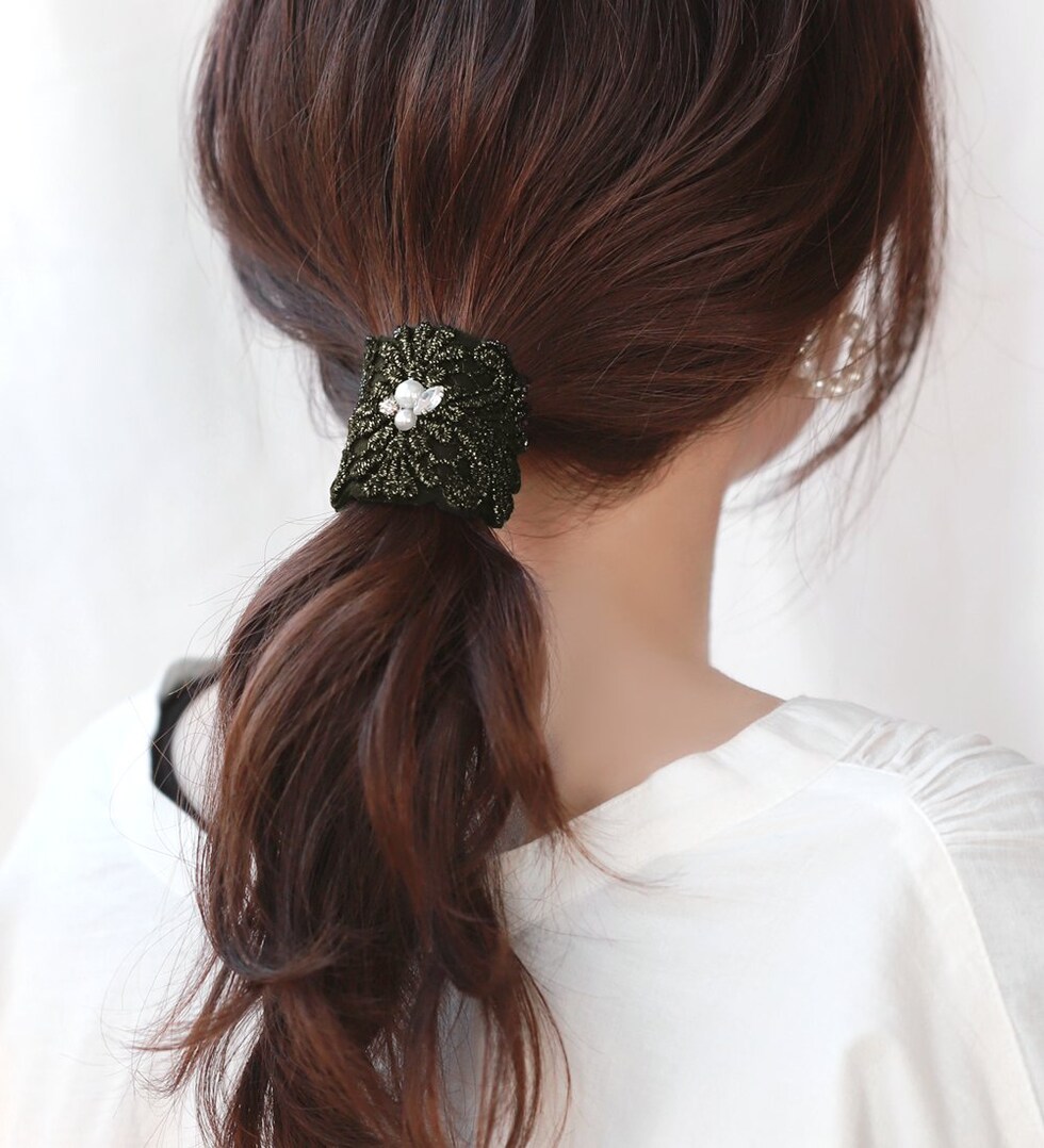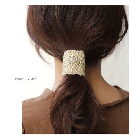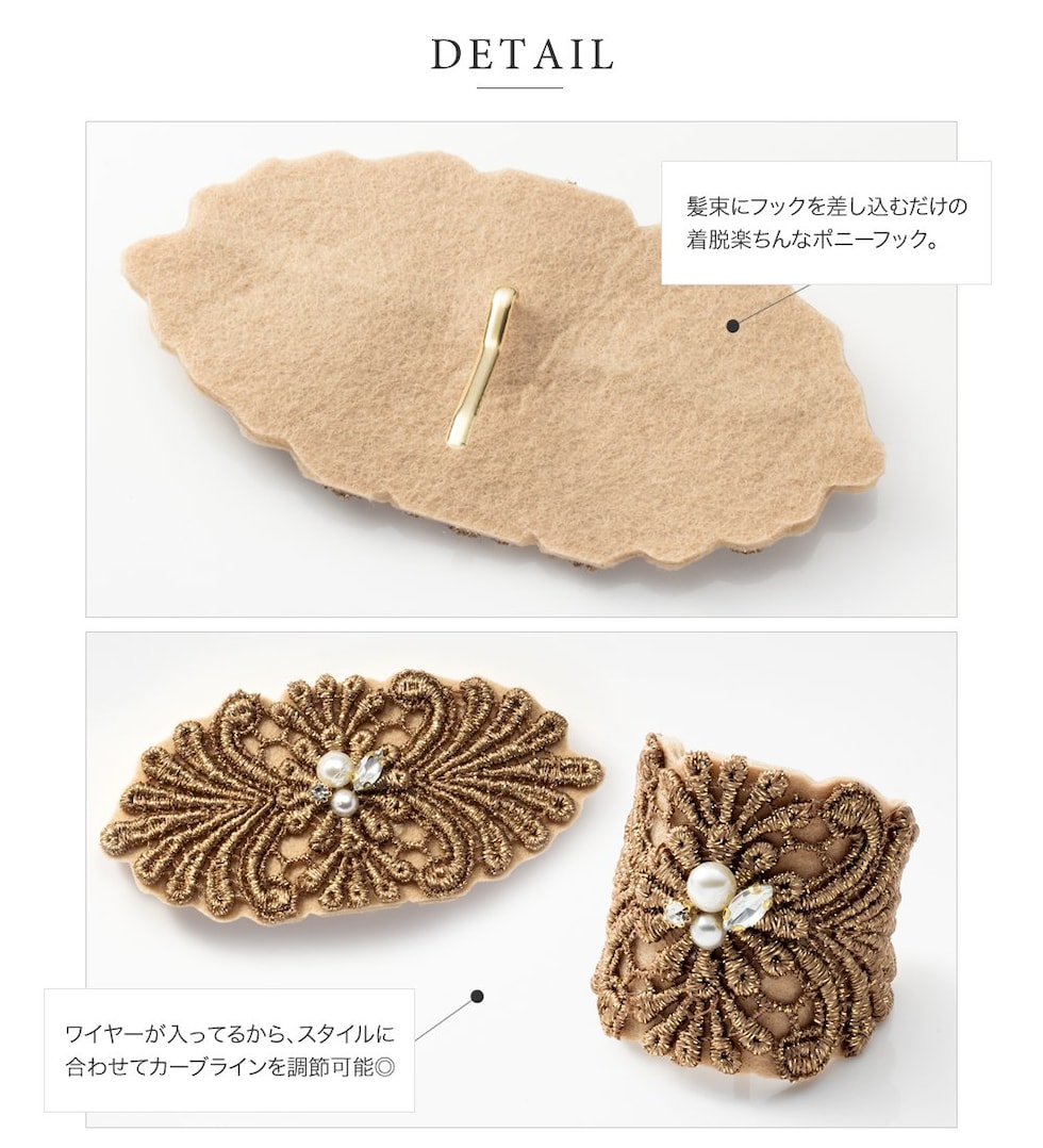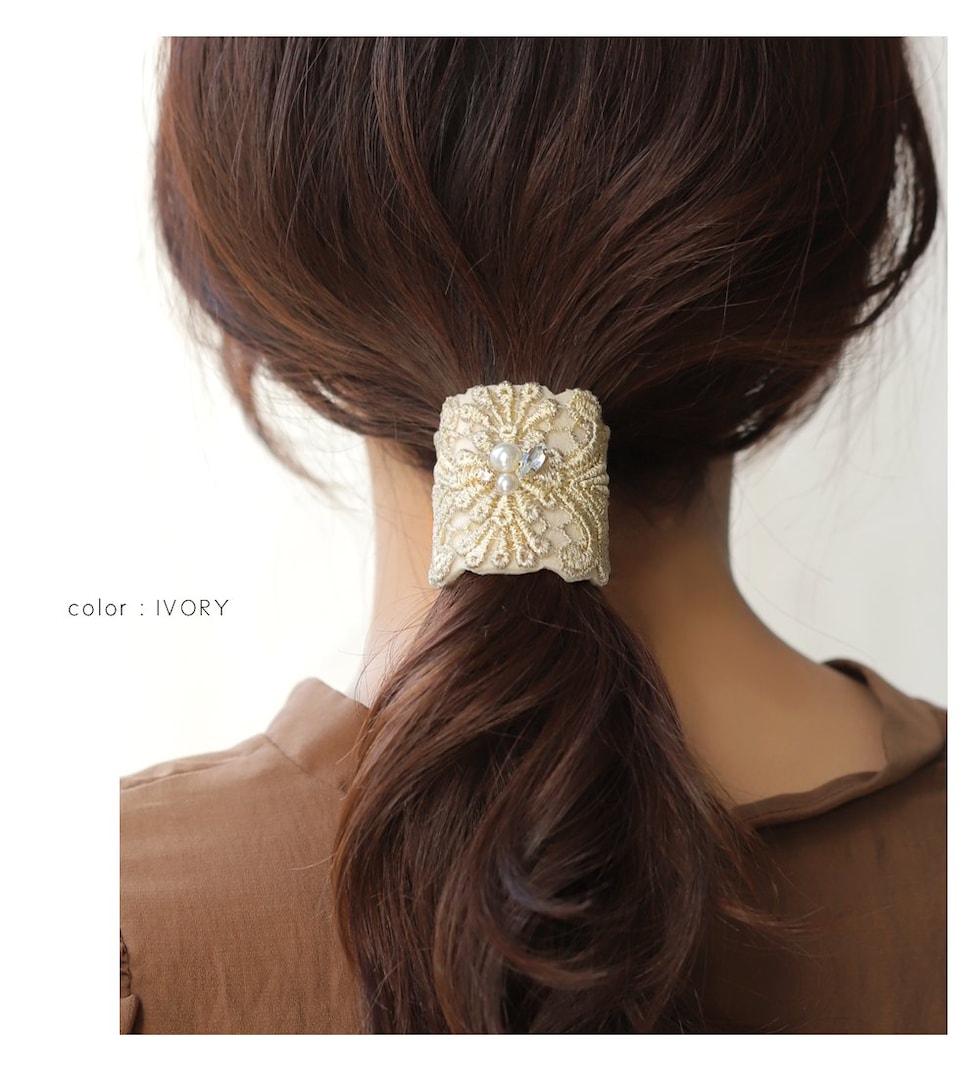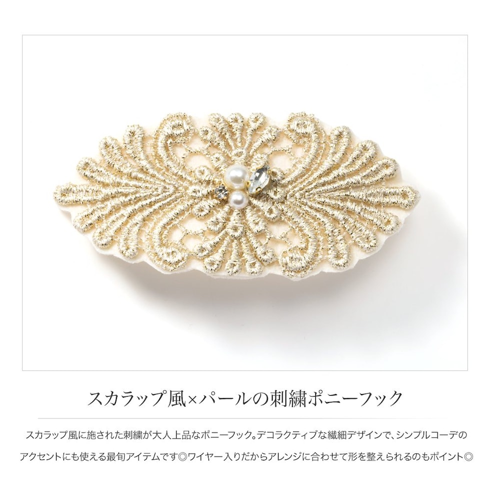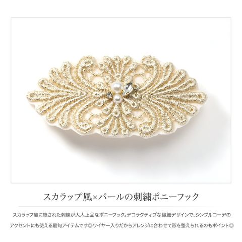 スカラップ風に施された刺繍が大人上品なポニーフック。デコラクティブな繊細デザインで、シンプルコーデのアクセントにも使える最旬アイテムです◎ワイヤー入りだからアレンジに合わせて形を整えられるのもポイント◎
