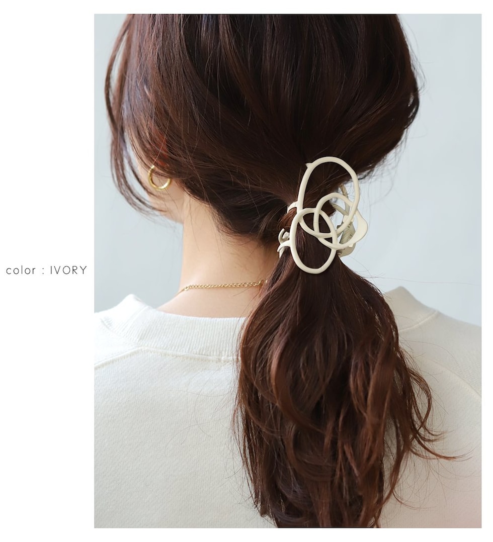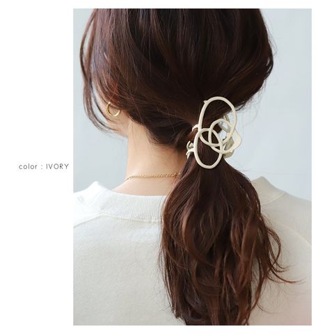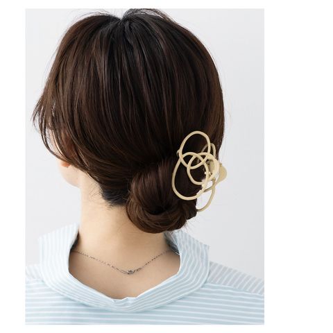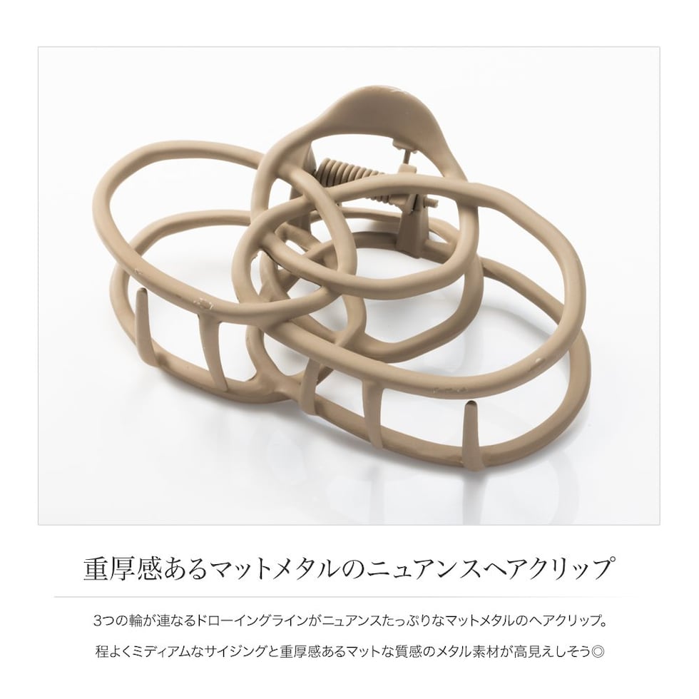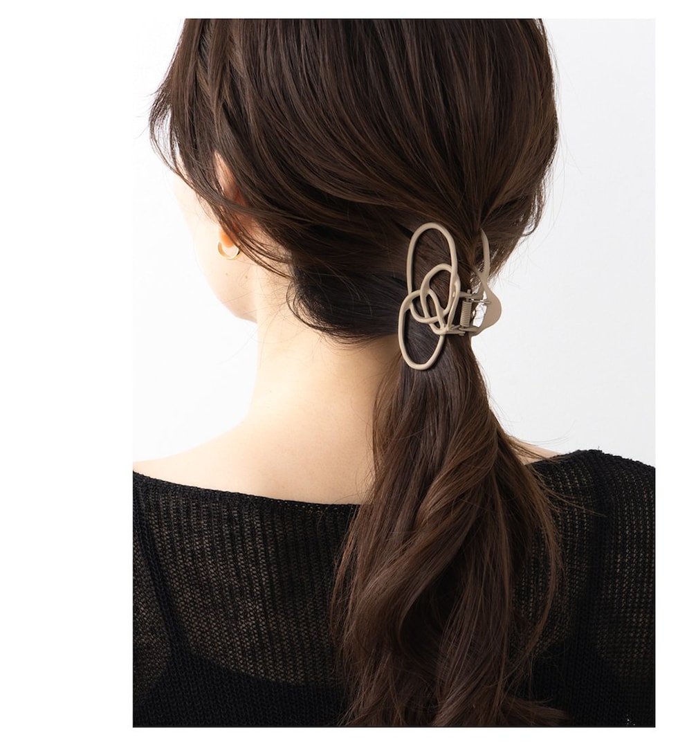 3つの輪が連なるドローイングラインがニュアンスたっぷりなマットメタルのヘアクリップ。程よくミディアムなサイジングと重厚感あるマットな質感のメタル素材が高見えしそう◎