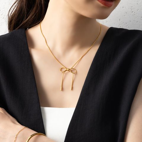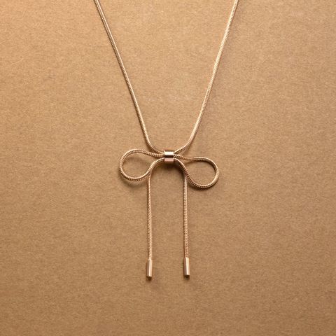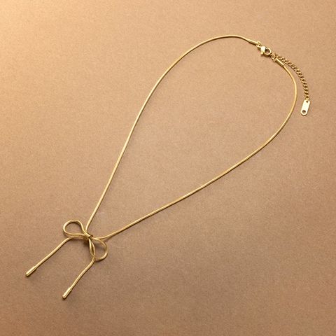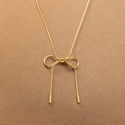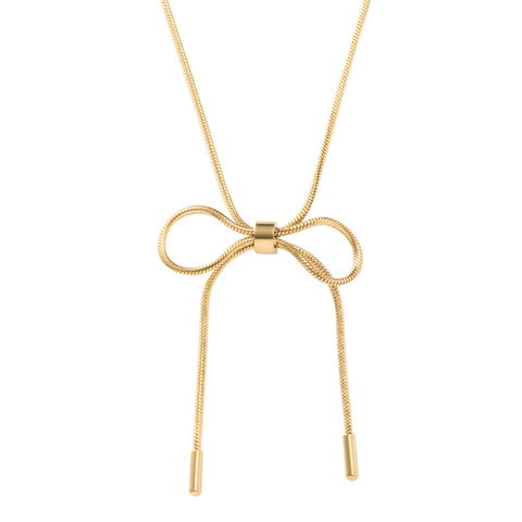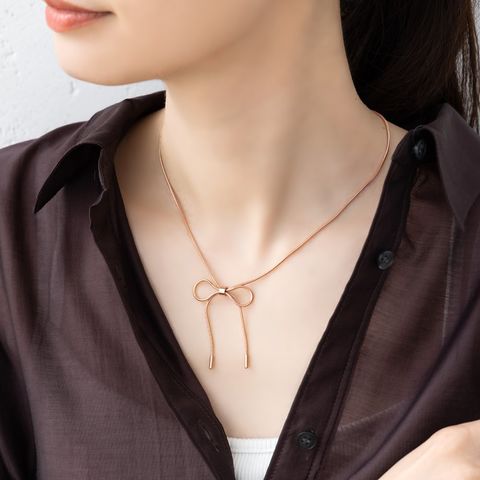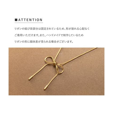 結んだようなリボンモチーフがレディライクな印象のスネークチェーンネックレス。カジュアルからキレイめまで幅広いコーデに合わせやすく、大人コーデに取り入れやすいデザイン◎肌馴染みもよく錆びにくいステンレス製だからデイリー使いにぴったりの一品です。