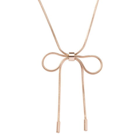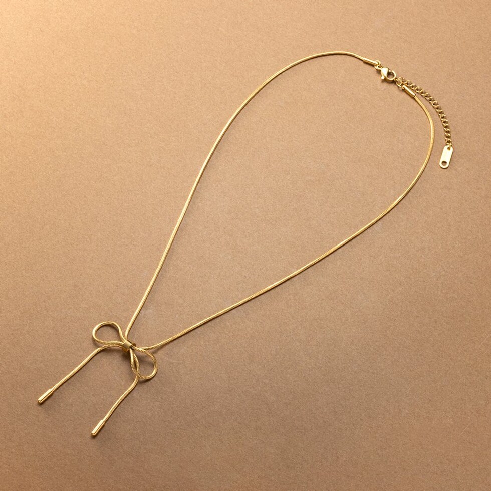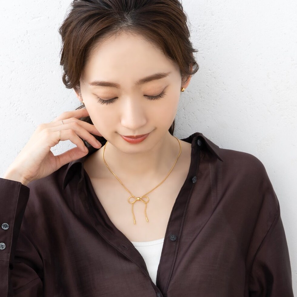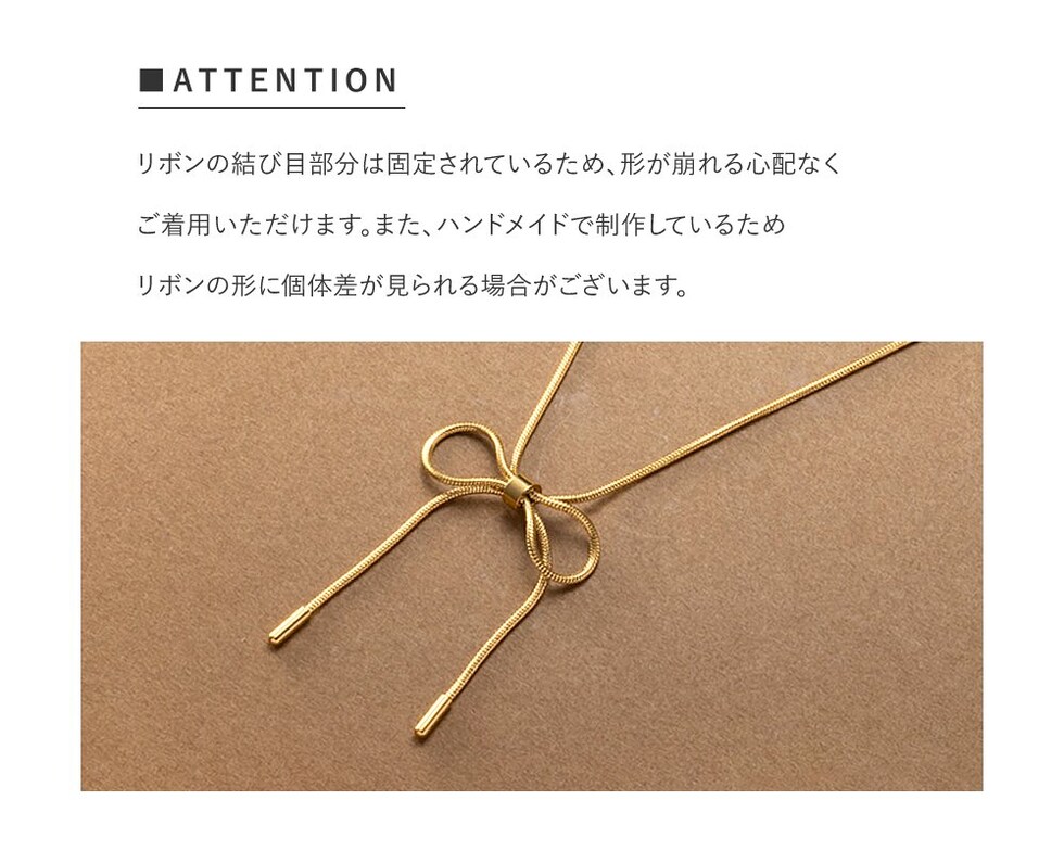 結んだようなリボンモチーフがレディライクな印象のスネークチェーンネックレス。カジュアルからキレイめまで幅広いコーデに合わせやすく、大人コーデに取り入れやすいデザイン◎肌馴染みもよく錆びにくいステンレス製だからデイリー使いにぴったりの一品です。