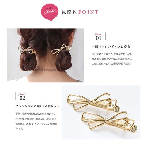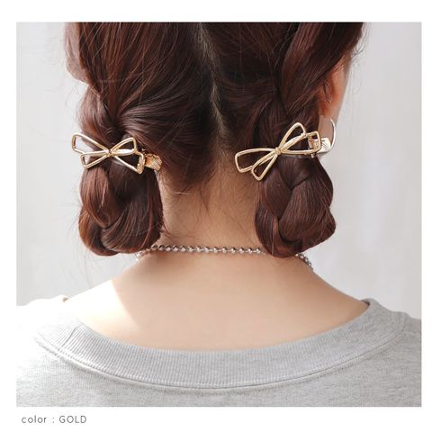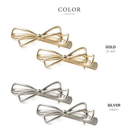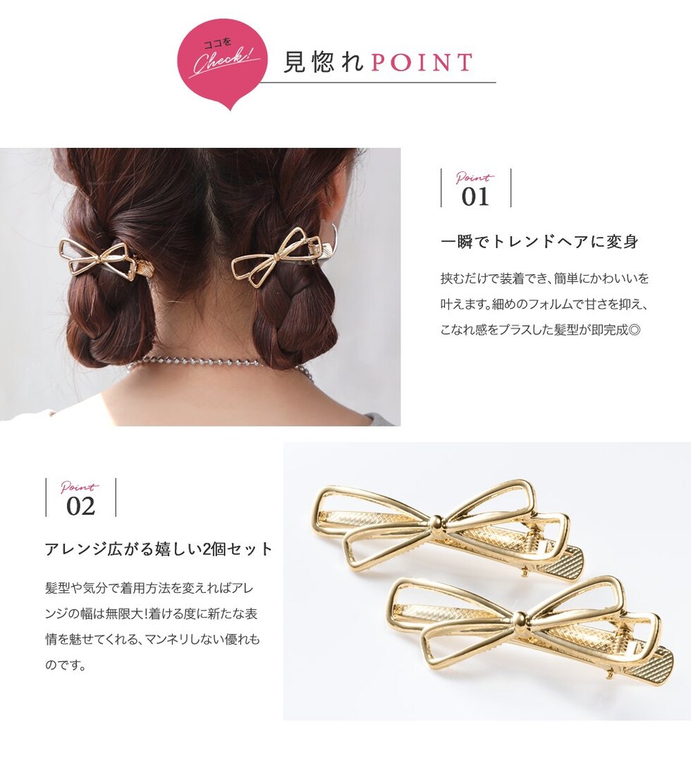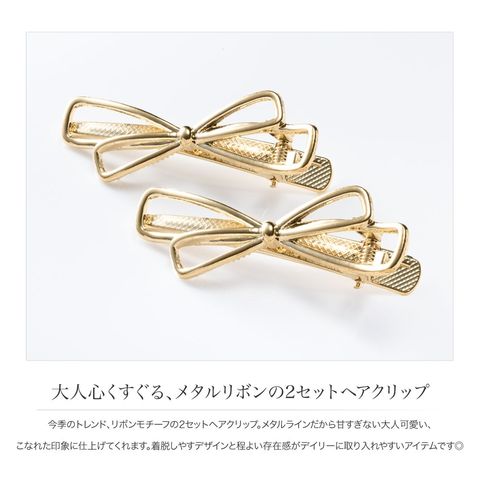 今季のトレンド、リボンモチーフの2セットヘアクリップ。メタルラインだから甘すぎない大人可愛い、こなれた印象に仕上げてくれます。着脱しやすデザインと程よい存在感がデイリーに取り入れやすいアイテムです◎