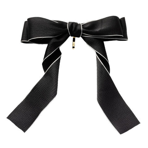 モノトーンのリボンを、バイカラーの縁どりで引き締めたデザイン。後ろ姿を簡単に華やかに魅せてくれ、コーデをグッと格上げしてくれます。