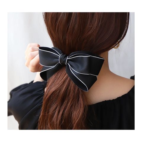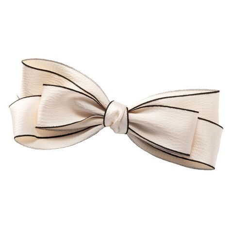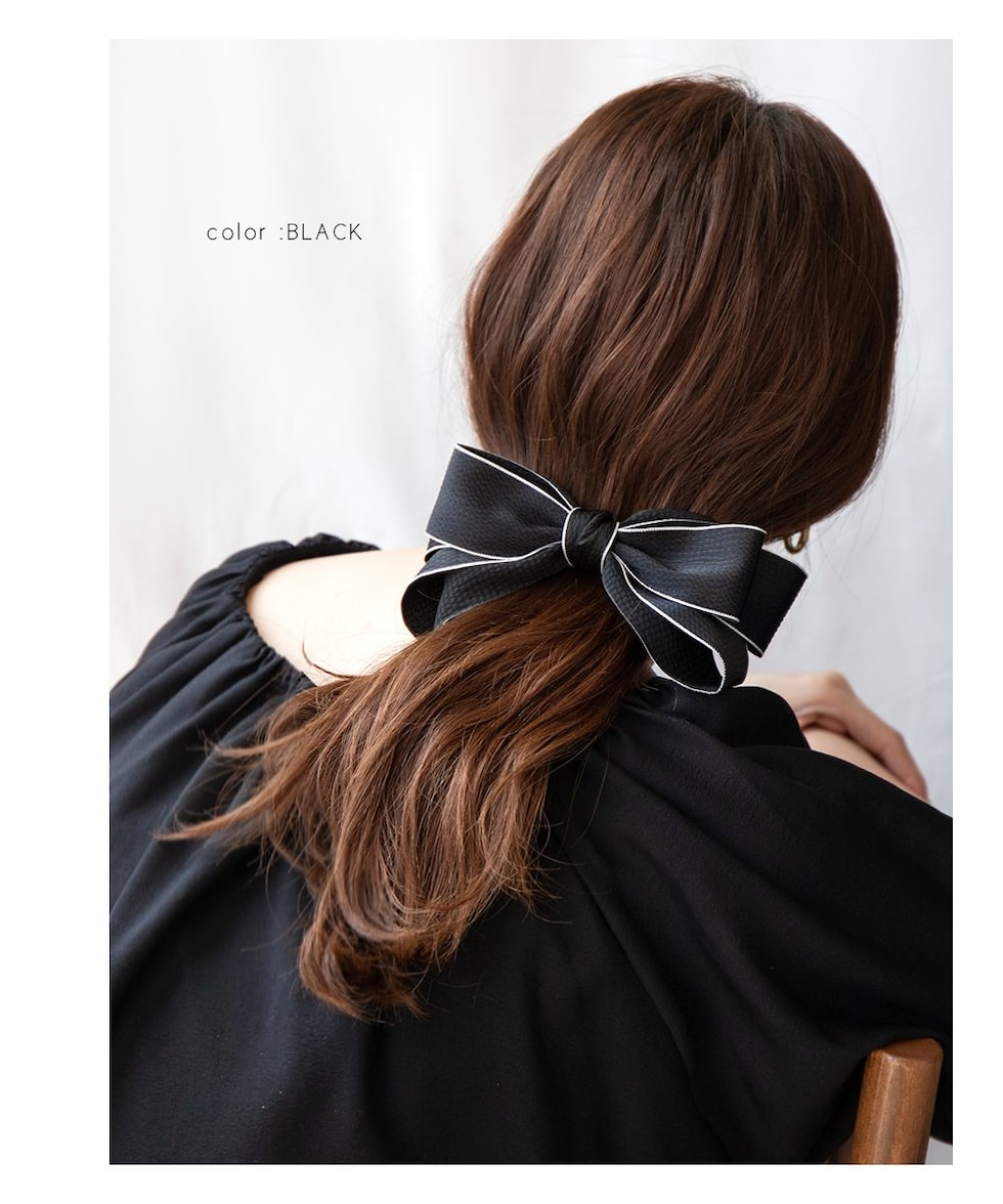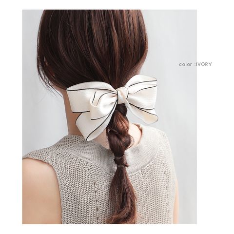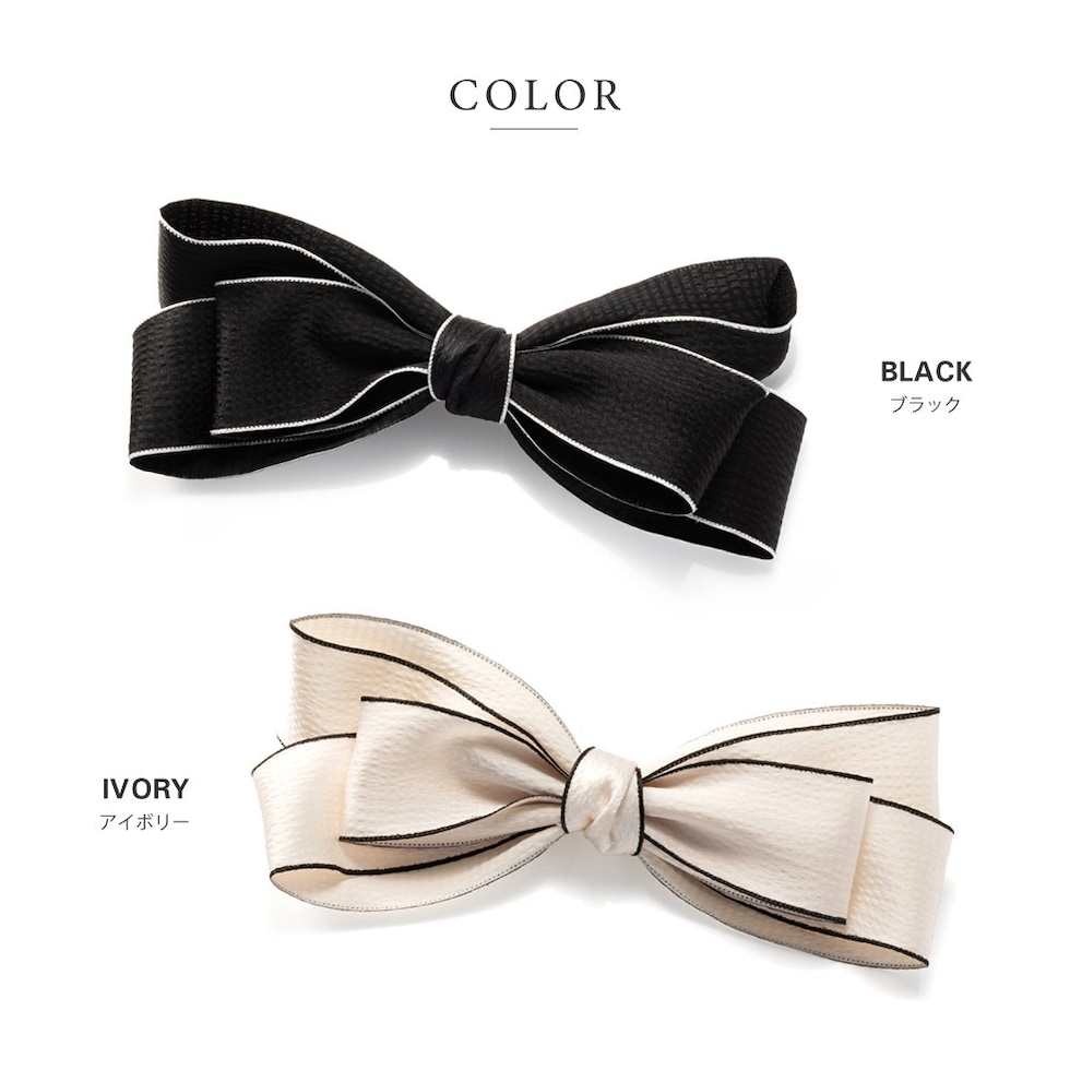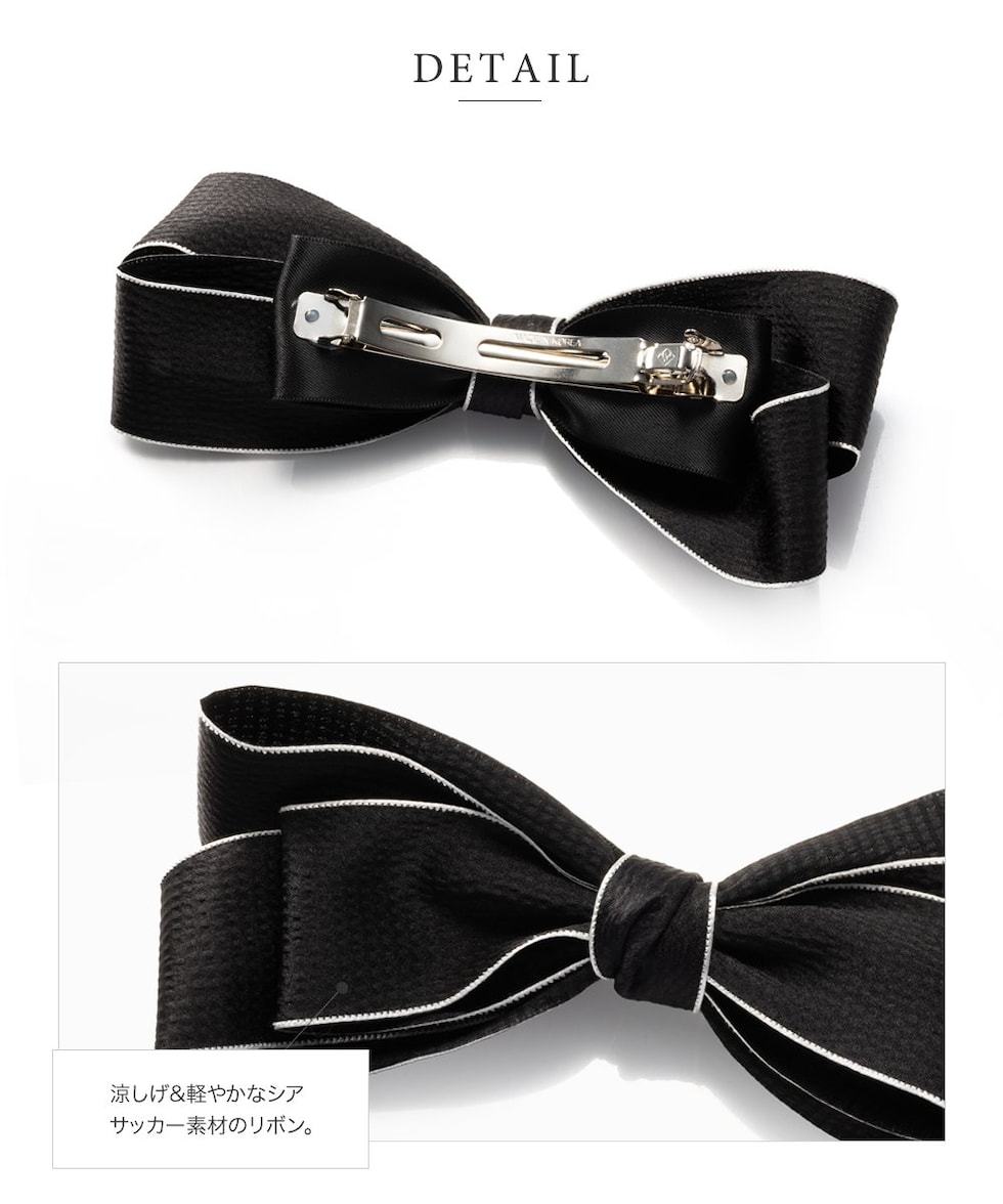 大人っぽいモノトーンカラーのリボンバレッタ。高級感あるシアサッカー生地と、バイカラーで縁どったデザインが華やかで涼しげなアクセントを添えてくれます。シンプルだからデイリーに取り入れやすいアイテムです。
