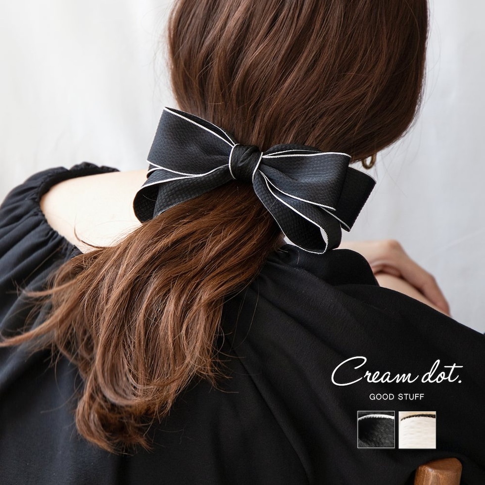 ヘアアクセサリー レディース バレッタ ヘアクリップ 髪留め まとめ髪 リボン シアサッカー バイカラー モノトーン 大きめ cream dot ゆうパケット [アイボリー_ワンサイズ]