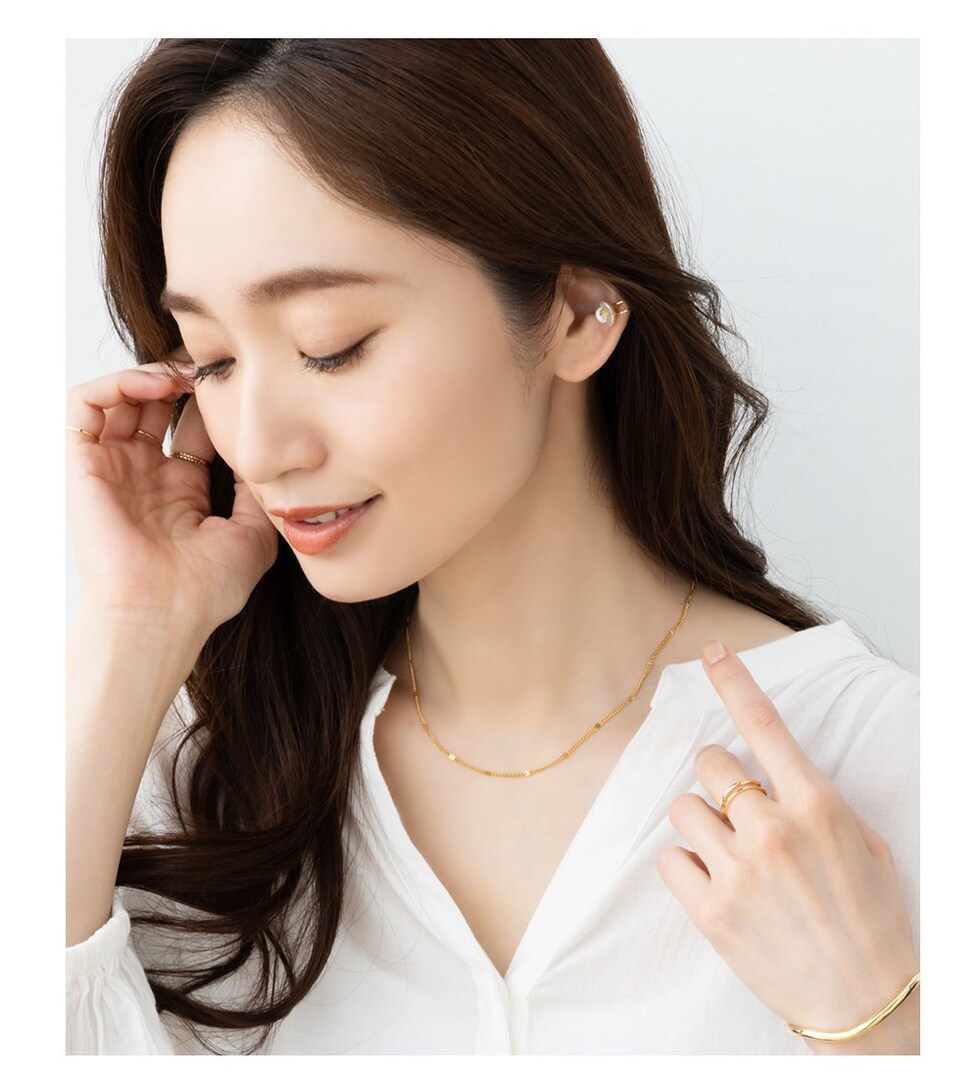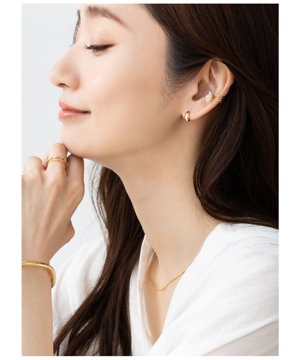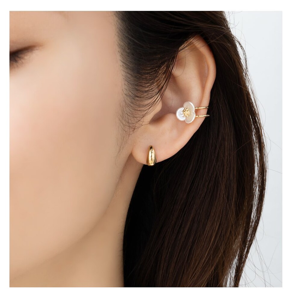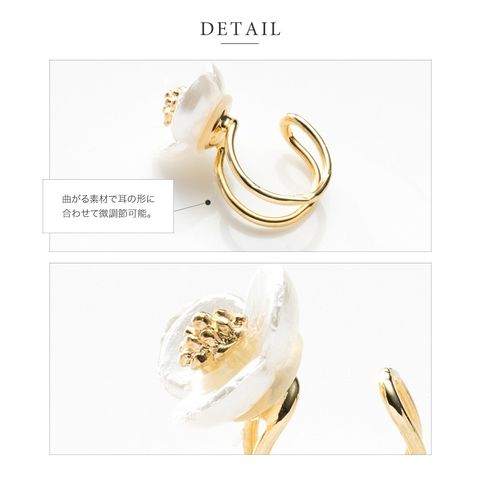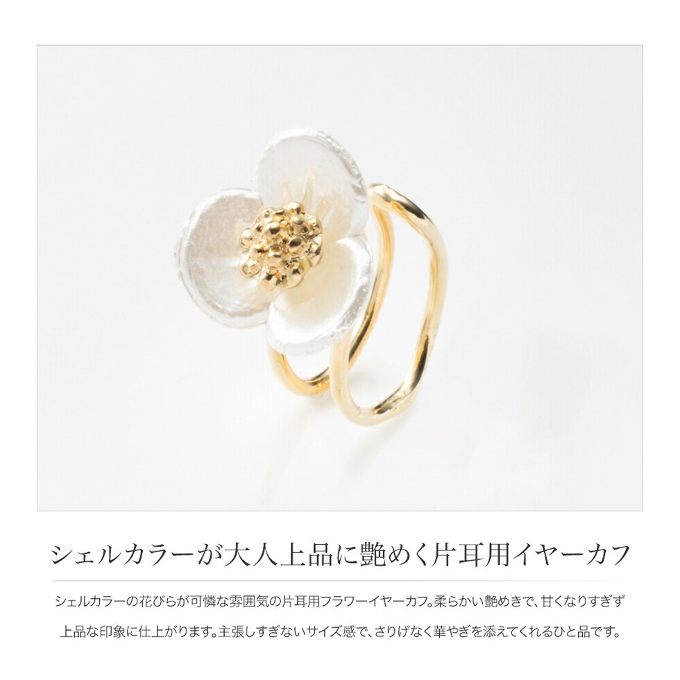 シェルカラーの花びらが可憐な雰囲気の片耳用フラワーイヤーカフ。柔らかい艶めきで、甘くなりすぎず上品な印象に仕上がります。主張しすぎないサイズ感で、さりげなく華やぎを添えてくれるひと品です。