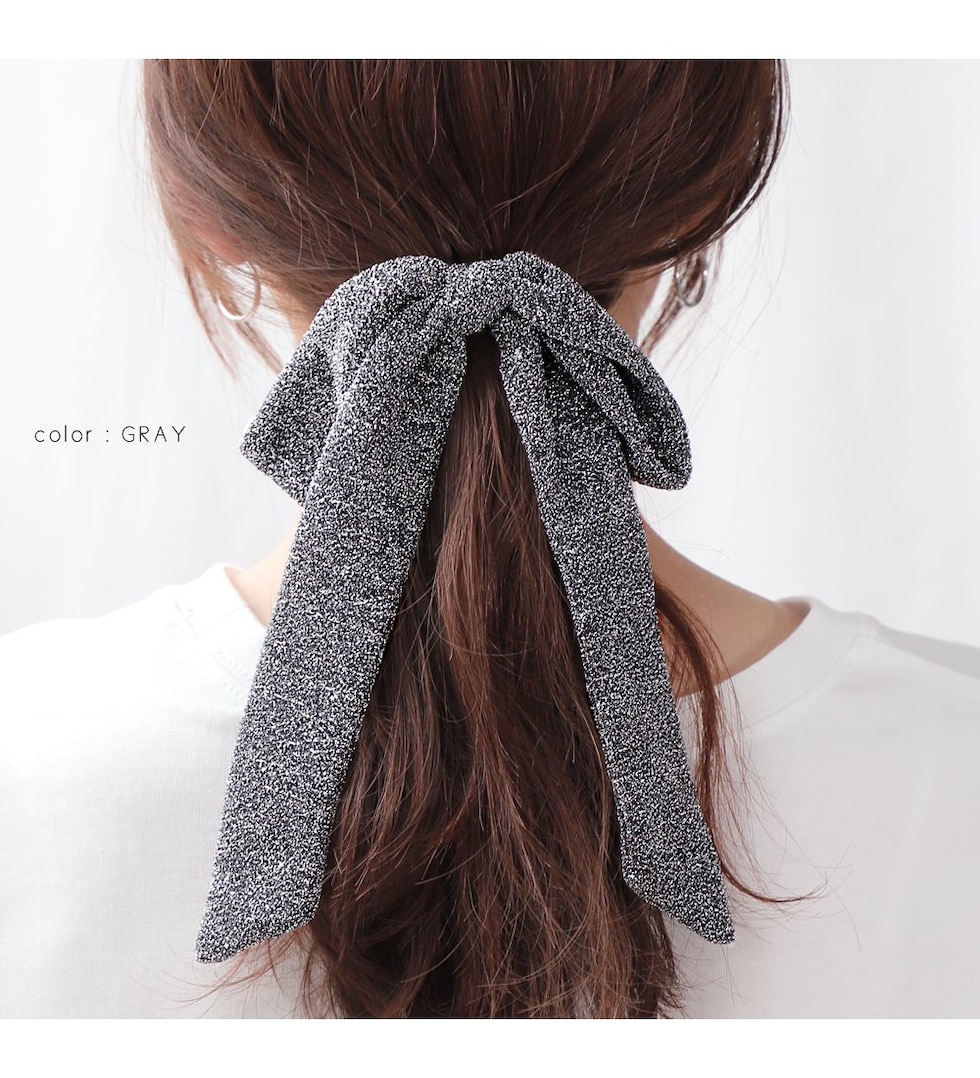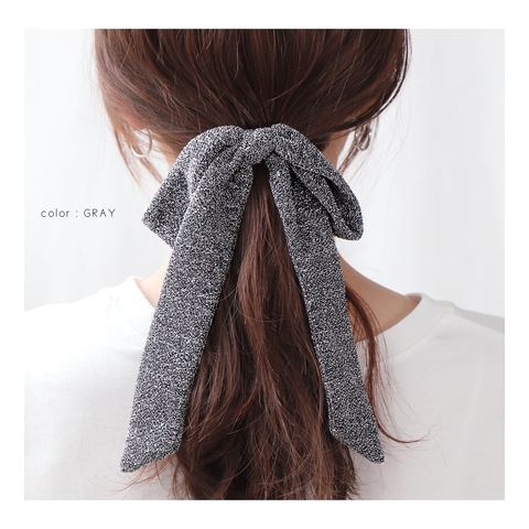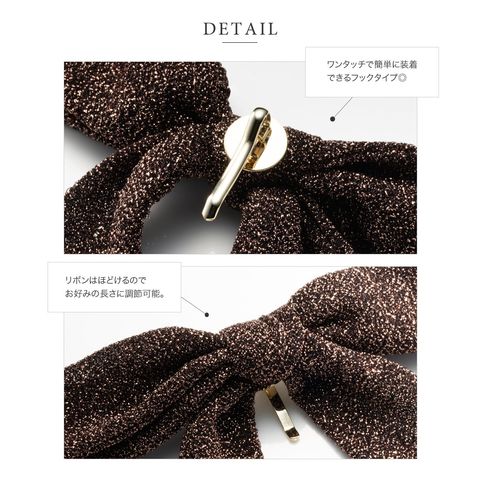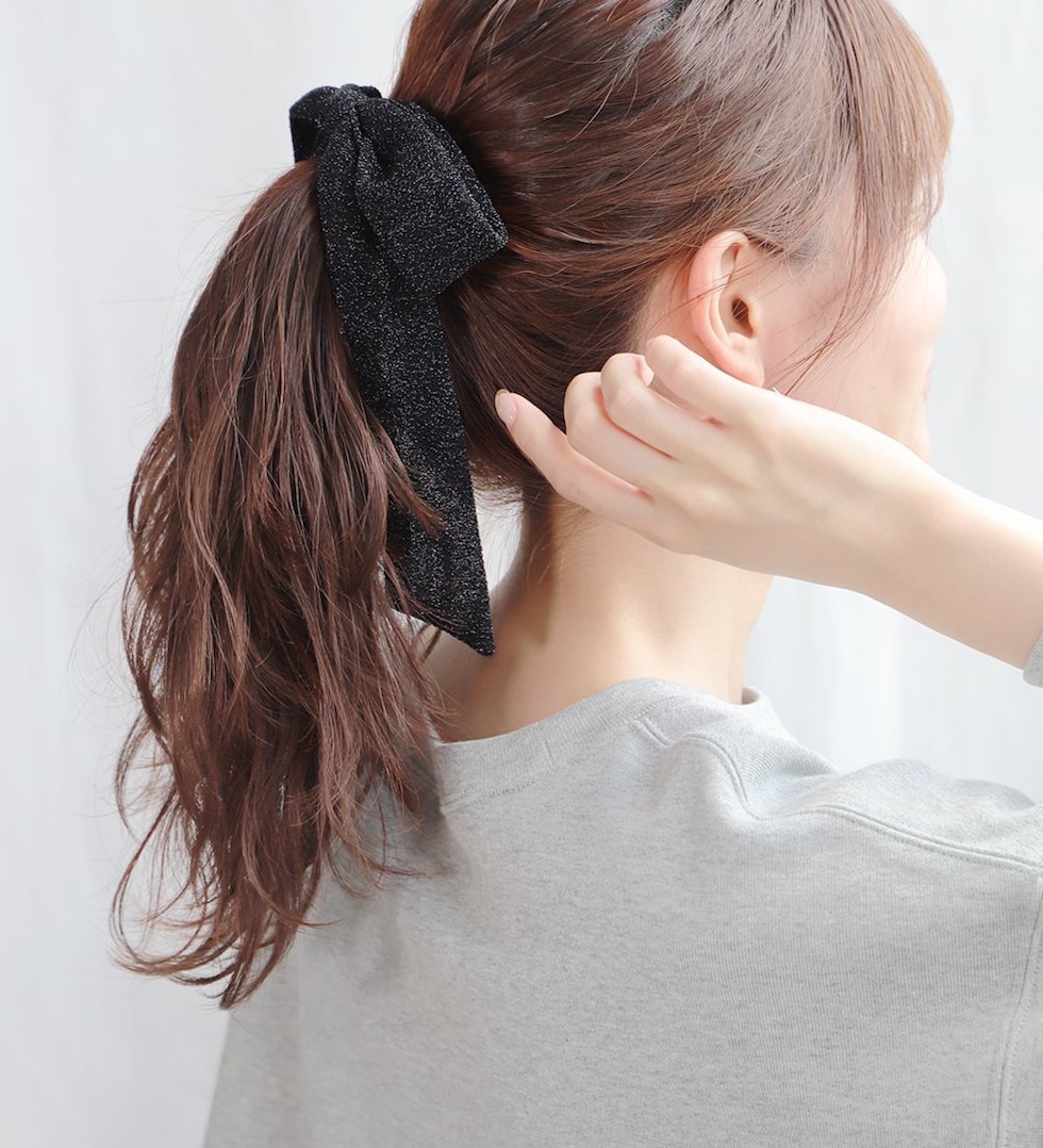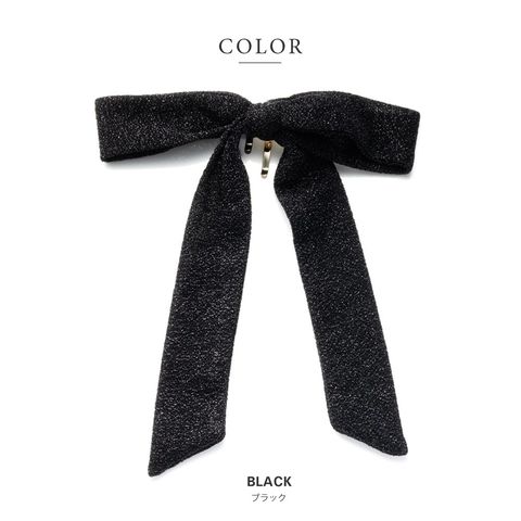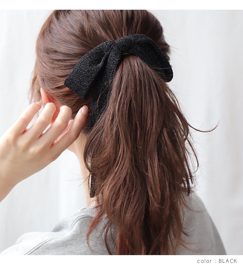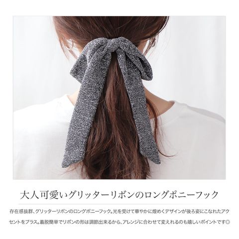 存在感抜群、グリッターリボンのロングポニーフック。光を受けて華やかに煌めくデザインが後ろ姿にこなれたアクセントをプラス。着脱簡単でリボンの形は調節出来るから、アレンジに合わせて変えれるのも嬉しいポイントです◎